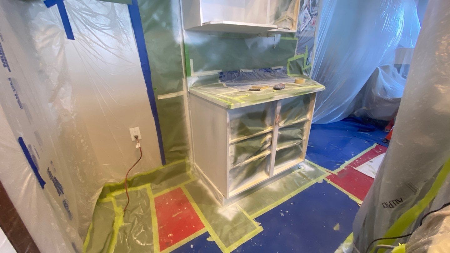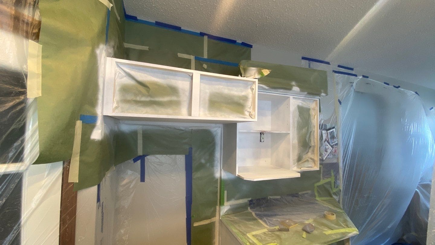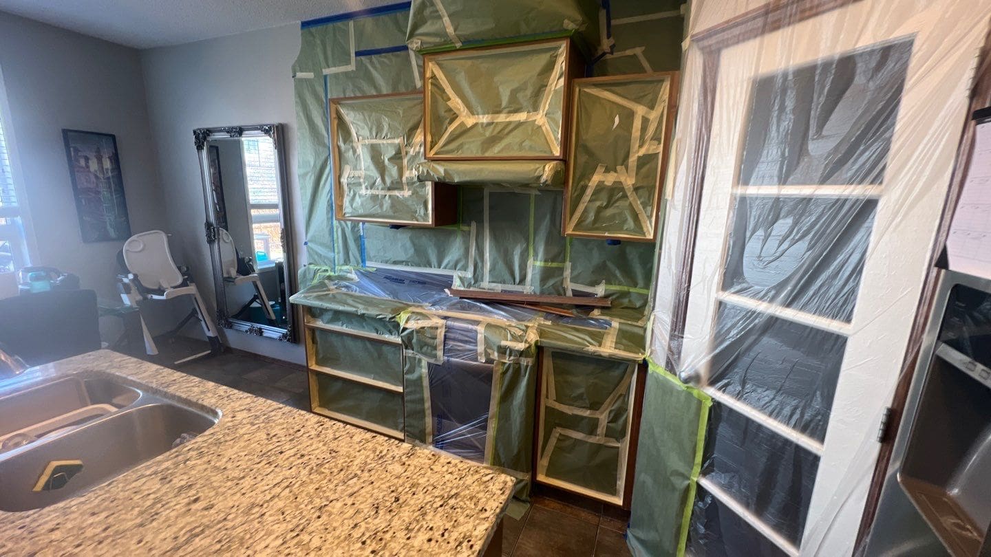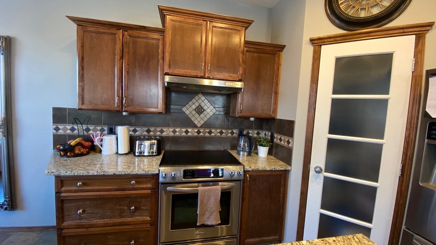 This project featured a kitchen cabinetry painting of the perimeter cabinets only, and under the crown moulding, as well as new handles. This client wanted us to update their kitchen cabinets with a modern bright tone on the perimeter boxes, turning the brown wood island and crown moulding into a stylish accent feature. The colour choice for this kitchen was Mountain Peak, a slightly creamy modern white shade that goes perfectly with the stylish black cylindrical door pulls the client chose as an additional upgrade. Do you have classic brown wood kitchen cabinets? Consider having them painted a stylish and modern shade of white! It not only instantly modernizes your home, but renews your cabinetry doors and wooden fronts in such a way that makes them look brand new once the painting is done. Don’t replace your aging cabinetry when you could easily get another ten or fifteen years of good use out of them!
