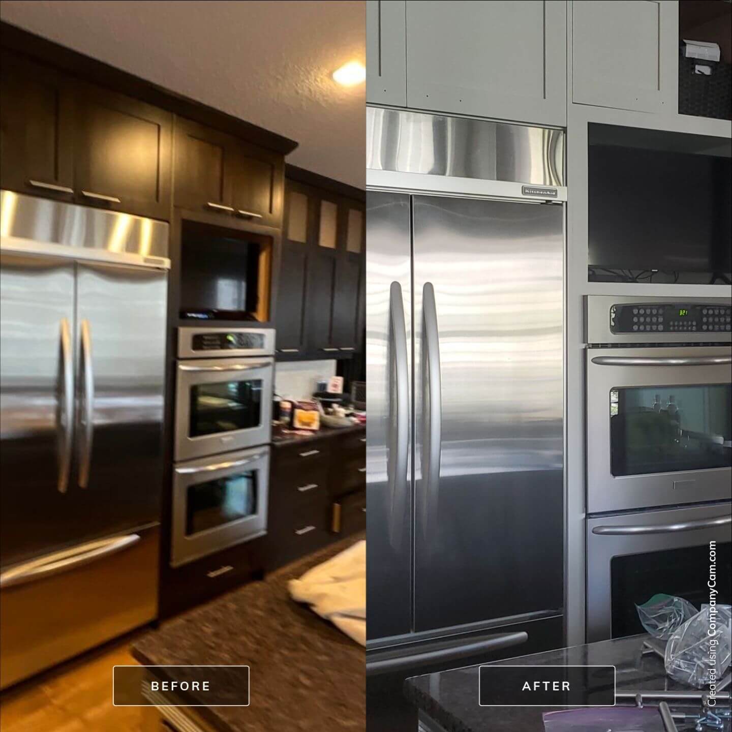 Do you have dated dark brown kitchen cabinets and other home features? Consider having them painted in stylish and contemporary shades of white and grey! These dark and dated cabinets were instantly modernized with a fresh two tone colour scheme in the home that truly opened up the space and modernized the whole interior. Replacing your cabinetry can be very expensive, and in most cases the doors and boxes you already have are still in great shape! Save money and transform your entire home with a cabinetry painting job today!