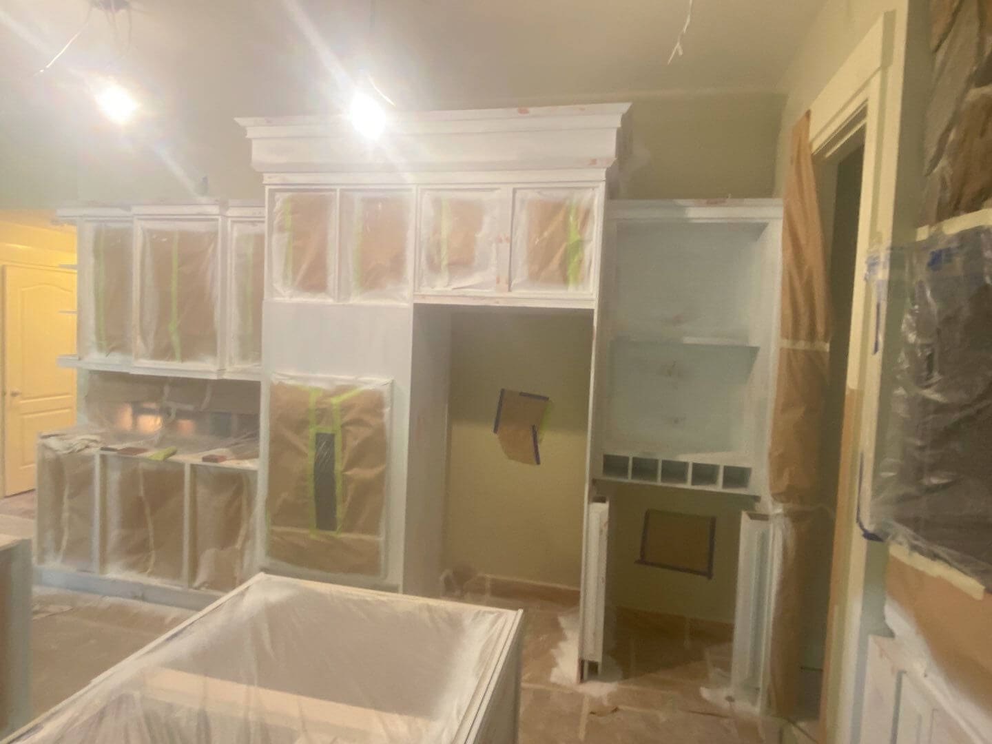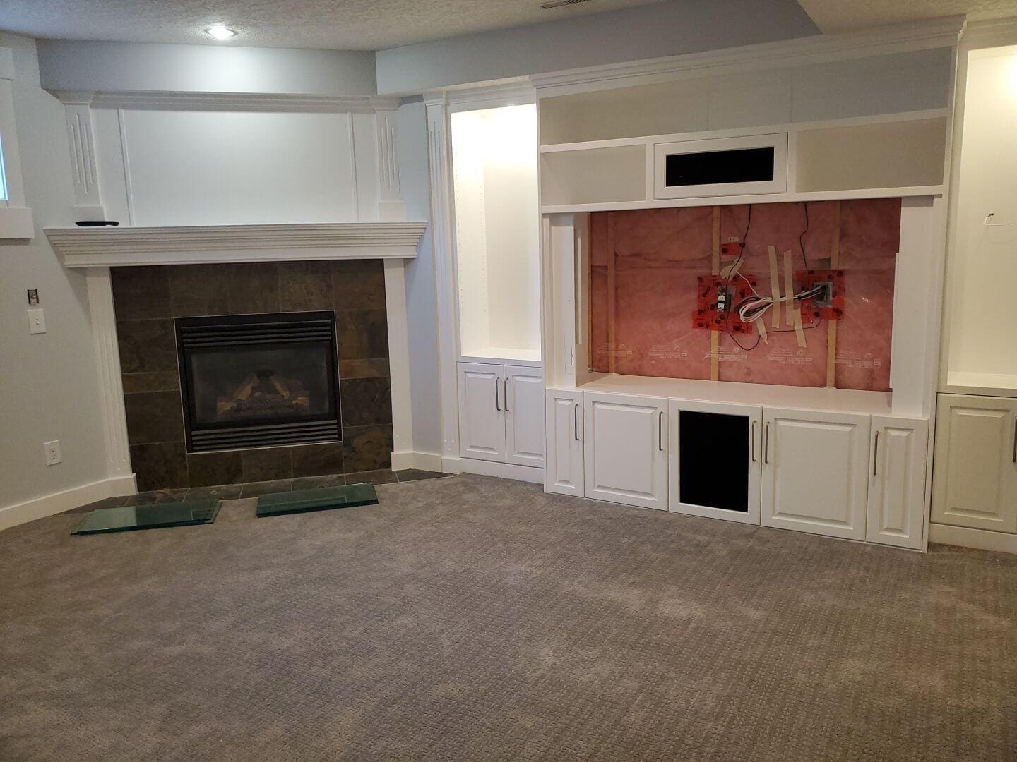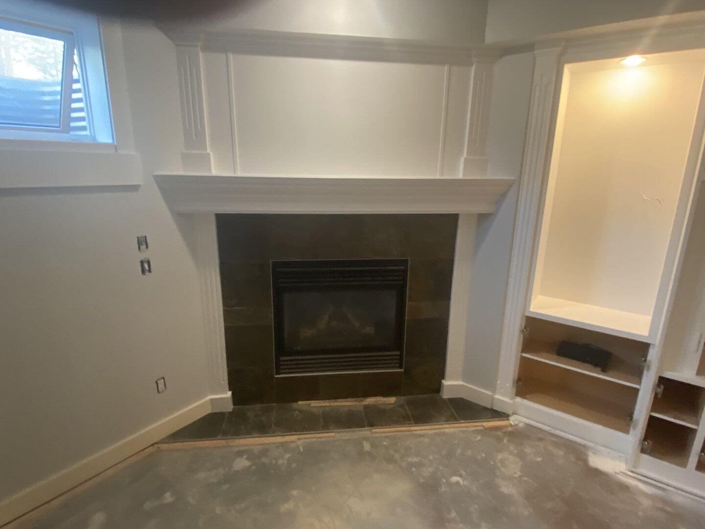 Racoon fur is a luxurious Blue/ Black that really made this project jump ahead from dated to urban. Normally, we try to avoid any type of fur in the paint but in this case our client was more than happy with it! The colours she chose for her project were Racoon Fur and Straight White, both by Benjamin Moore. So maybe a little bit of fur in the paint isn’t always a bad thing…?! This project was all throughout this newly purchased home in Discovery Ridge. Painted cabinets and banister, the entertainment centre and fireplace mantle all received a much needed refresh.