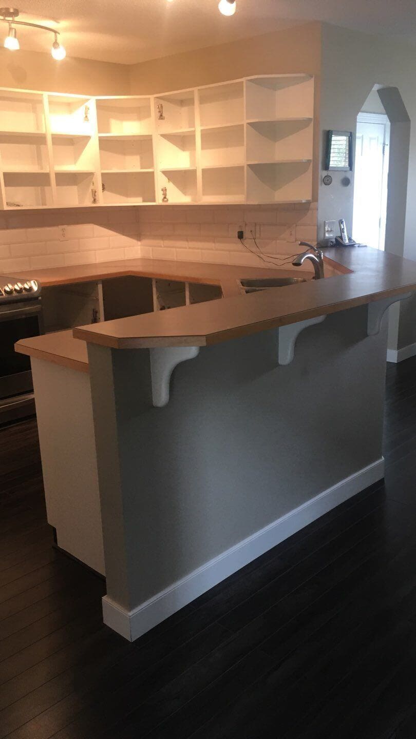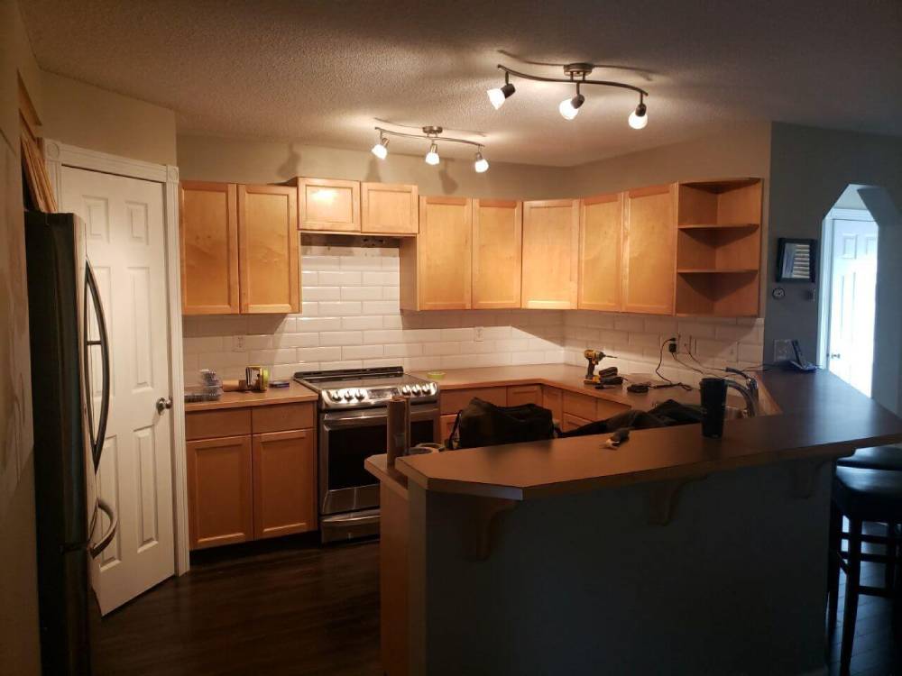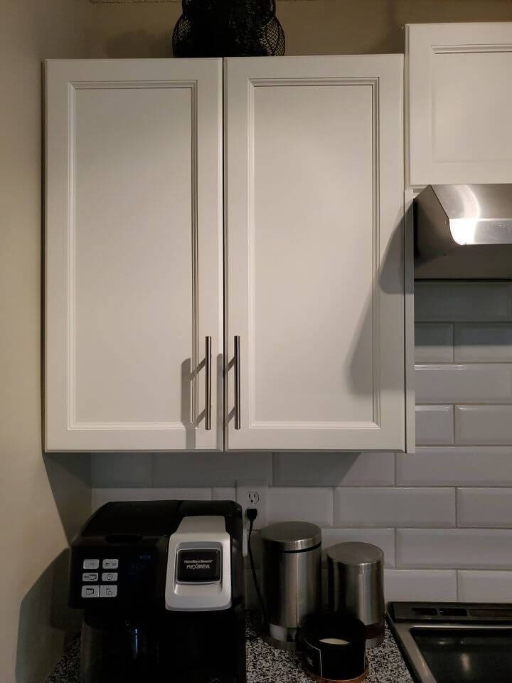 Do you have a dated wood stain kitchen? Consider having it painted a modern shade of white! These dated light wood kitchen cabinets were instantly modernized with a fresh and stylish shade of cloud white that truly opened up the space and changed the entire feel of the main floor. Going from dated wood to a modern white shade on your cabinets will not only instantly upgrade the feel of the space, but your cabinet surfaces will reflect more light back into the home. They will even give off a variety of warm and cool shades depending on the source of lighting. Having your cabinets painted will completely transform your home!