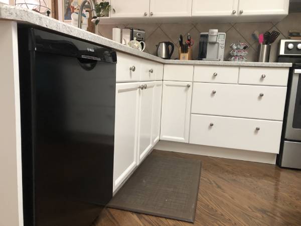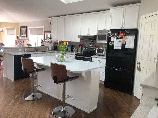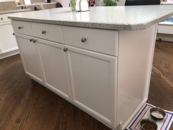 In this Valley Stream home, we repainted the upper and lower kitchen cabinets with a sprayed lacquer finish. Calgary Countertops did a wonderful job on the new countertops