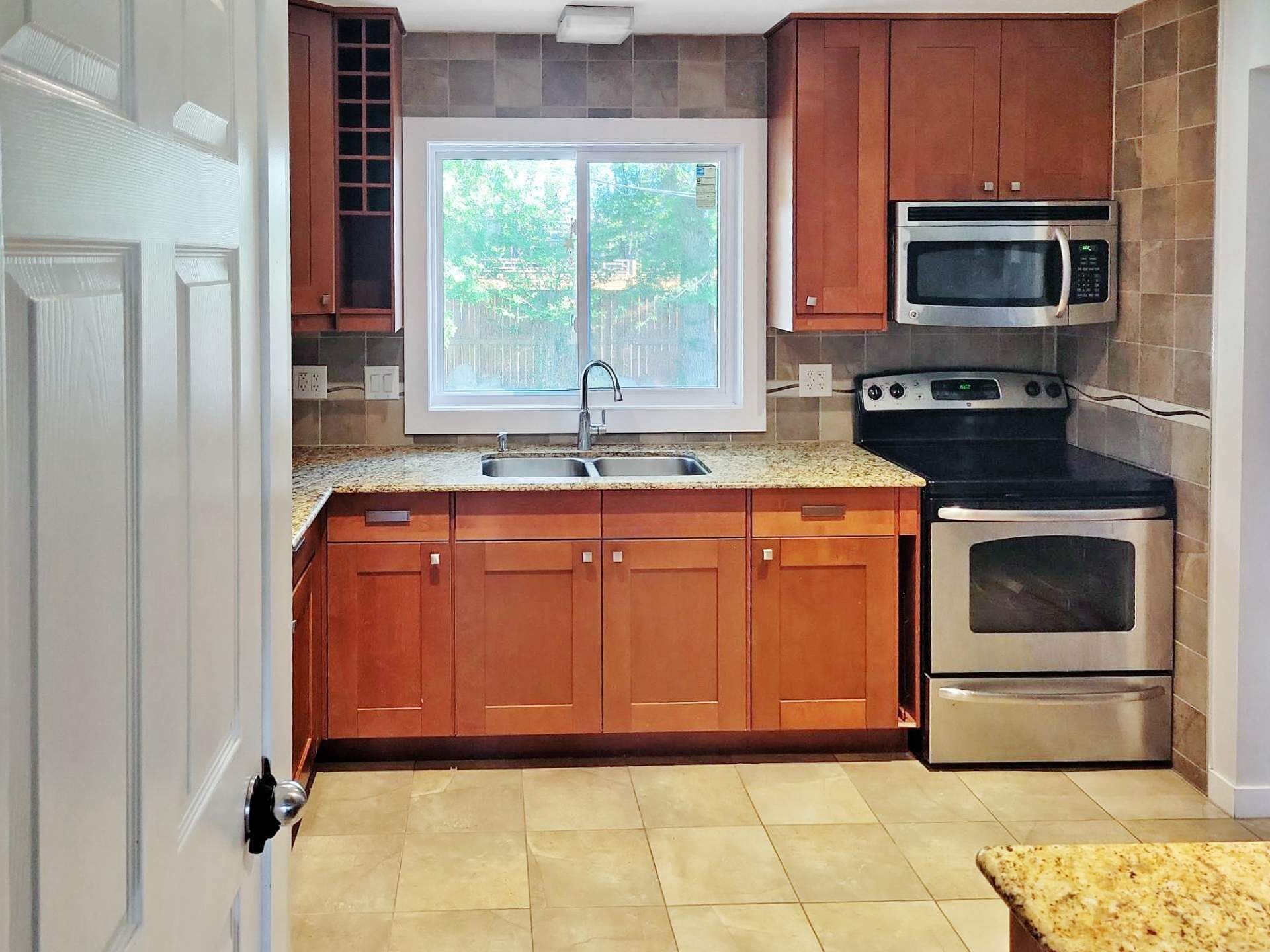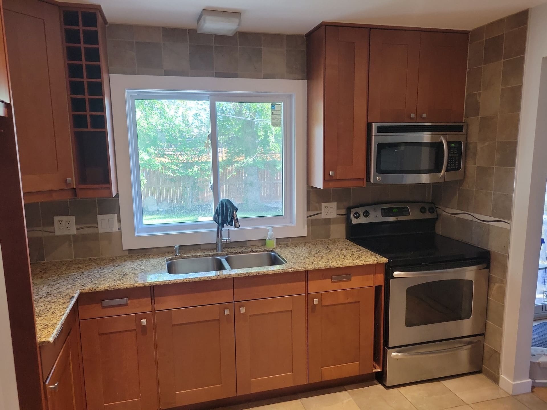 This project featured a full kitchen cabinet painting in professional spray coatings, as well as wall painting in certain areas of the home. The primary concern for this client of ours was to deal with the dated reddish-orange stain on their kitchen cabinets. Our team painted the kitchen with a fan-favourite at our company, the neutral but complex, warm gray-beige called Revere Pewter. The walls in the hallway and staircase surrounding the kitchen were painted a bright and airy Dove Wing. The end result was a much nicer flow between the kitchen area and the rest of the house – a brighter, more spacious feel in the kitchen thanks to the durable, vibrant colour on the cabinets and freshened walls in the immediate vicinity.