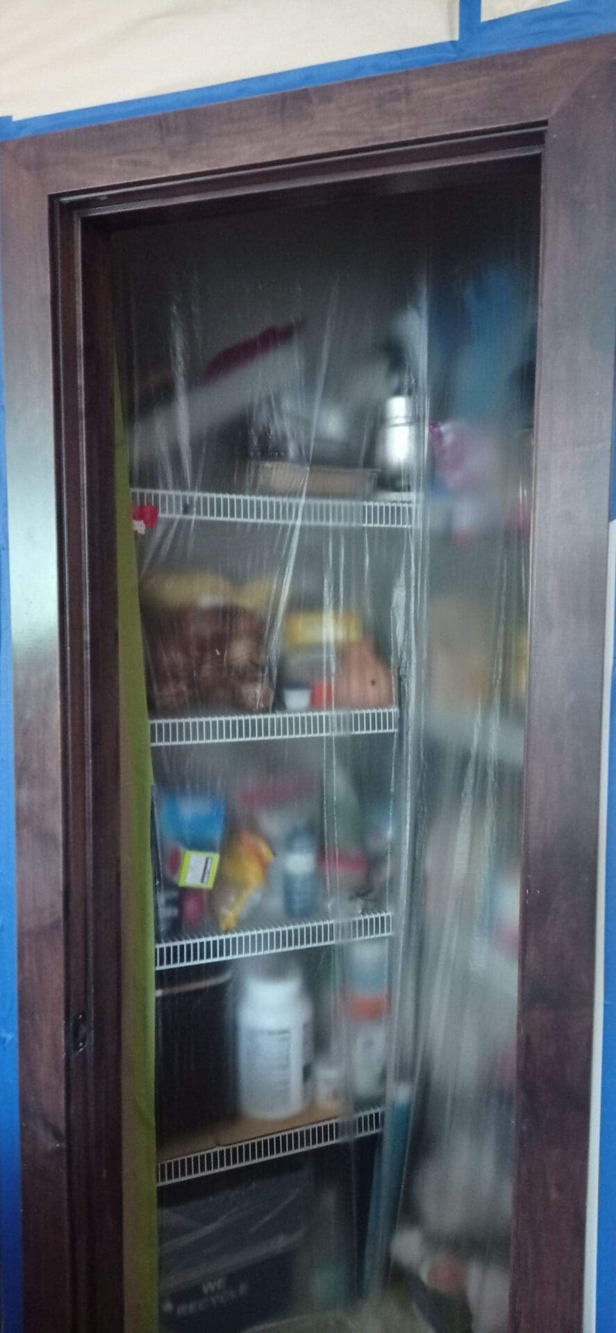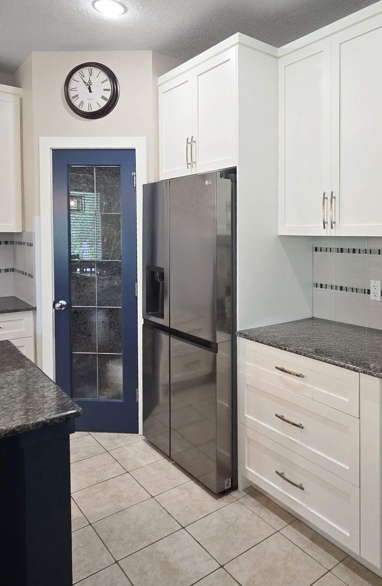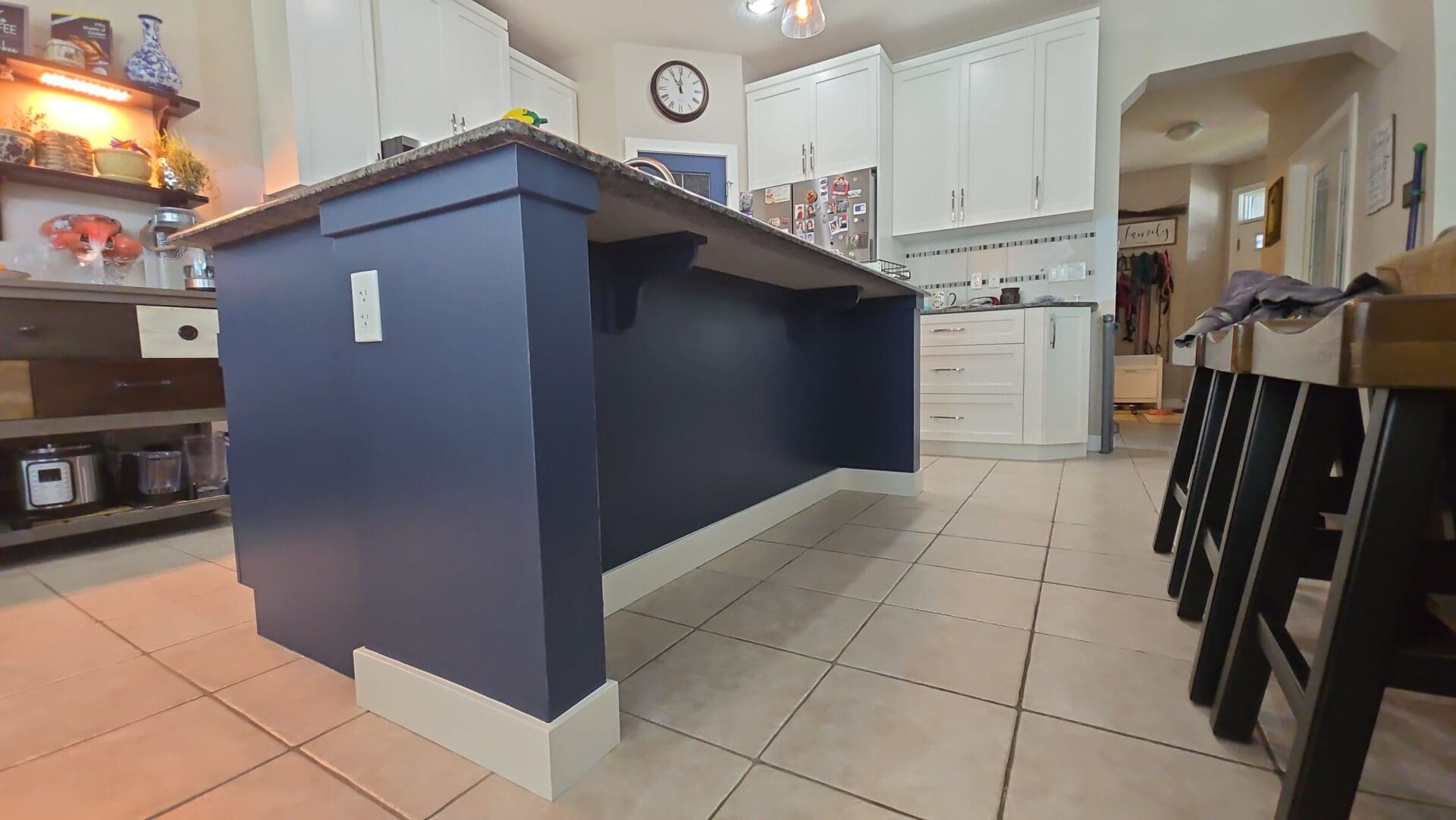 This project featured a full kitchen cabinet painting and pantry door/frame using professional spray coatings. This client of ours wanted to transform their dark brown kitchen using a bright and stylish, creative two-tone colour scheme. Our team painted the perimeter cabinets and pantry frame a clean, classic shade called White Dove while the island and pantry door received the stylish accent colour; a darker shade with warmer, almost purple undertones called Newburyport Blue. The end result was a bright and spacious, stylish new kitchen design that felt more inviting and creative. Not only will the professional spray coatings add years of durability to the original cabinets, but now the kitchen flows much better with the colour scheme of the rest of the house. As if it was always meant to be!