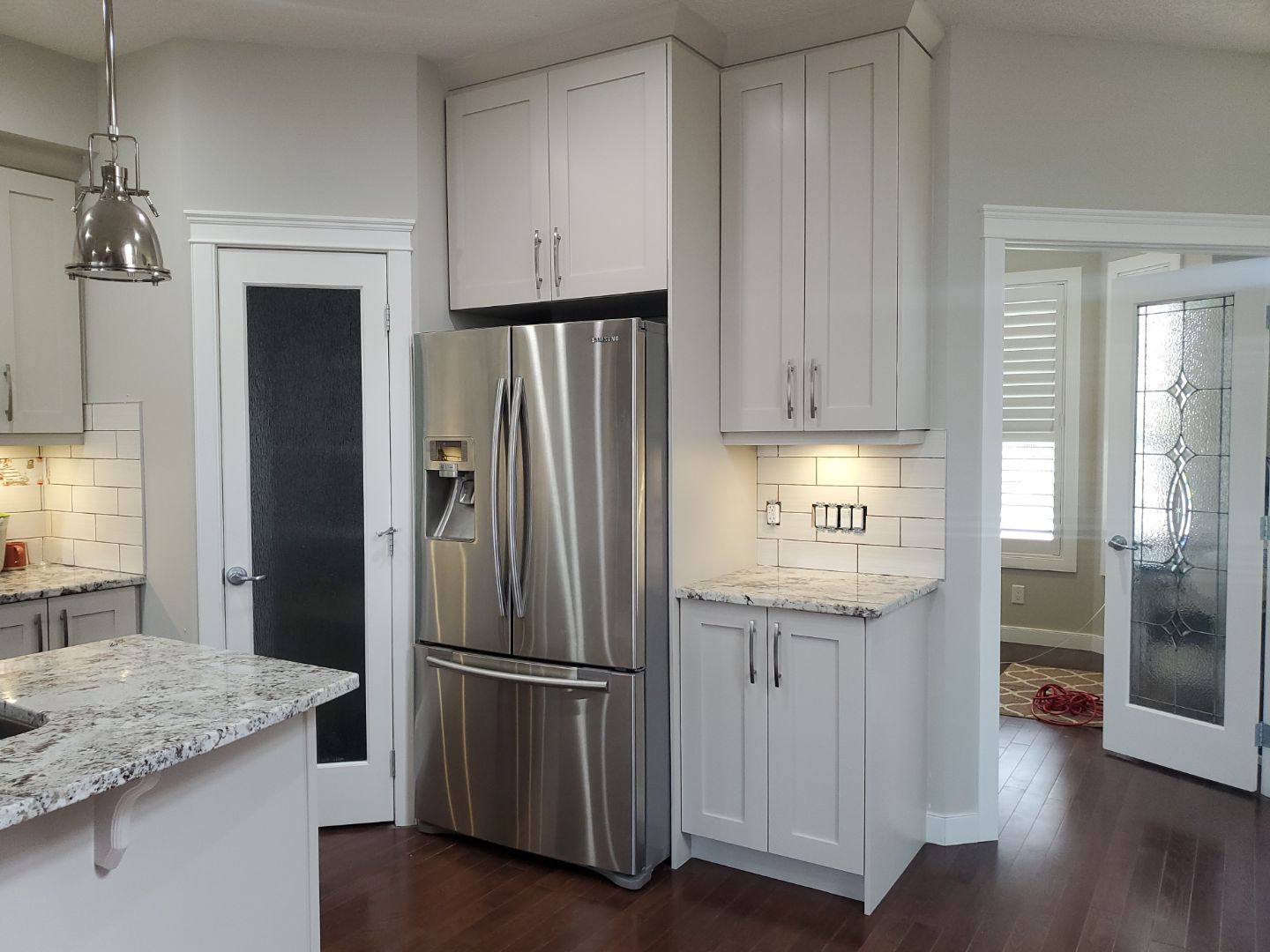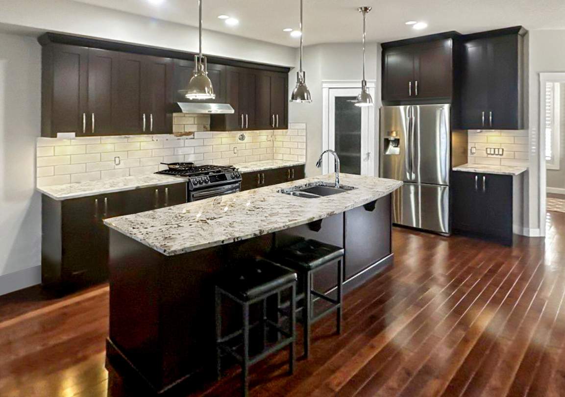The finished kitchen is a true show-stopper. The updated cabinet colour made the space feel brighter, more welcoming, and visually striking without overpowering the room. Depending on the time of day and lighting, the cabinets display subtle shifts in tone, adding depth and interest. The kitchen now confidently serves as the focal point of the main floor, just as the home’s design intended.