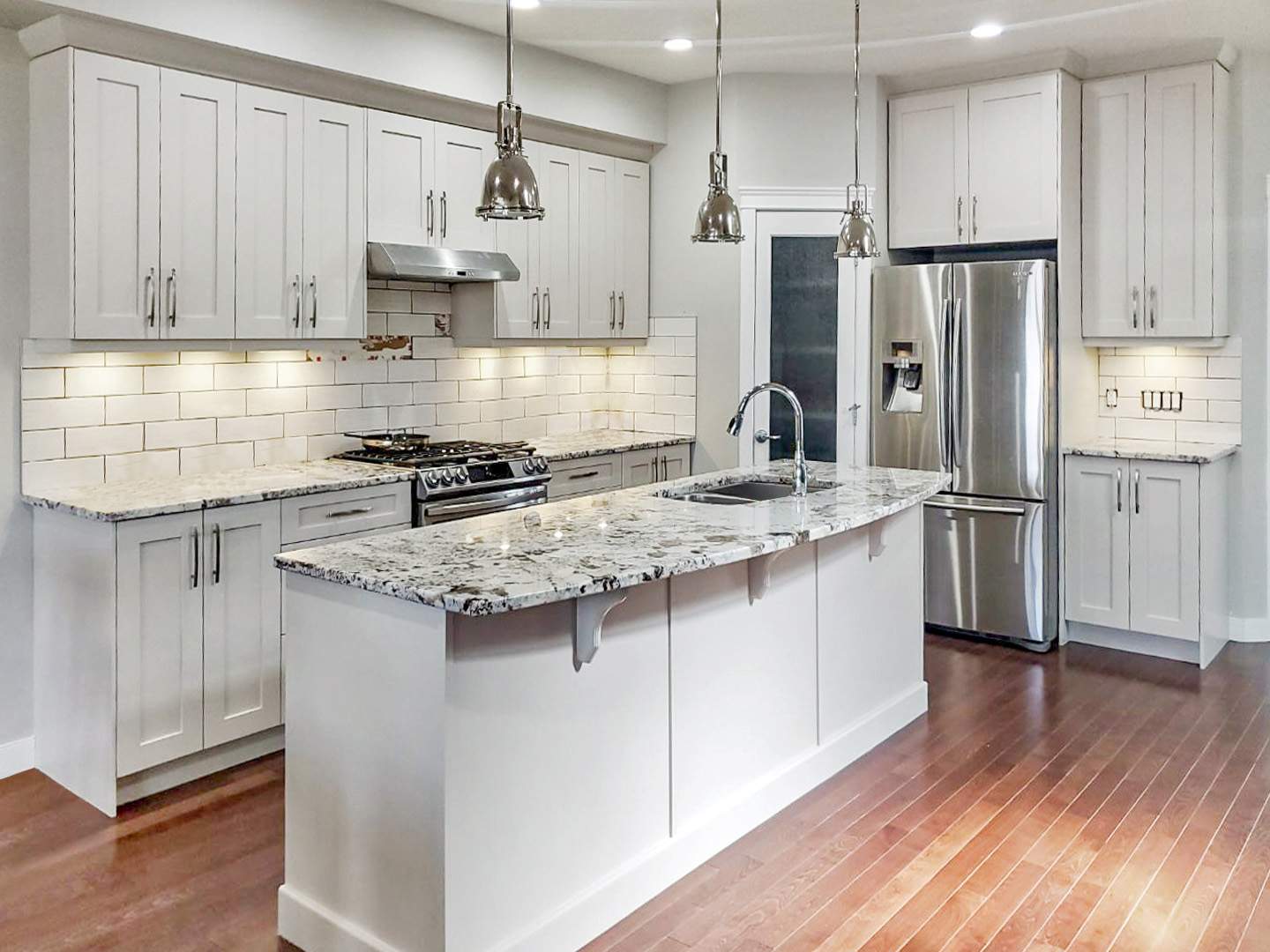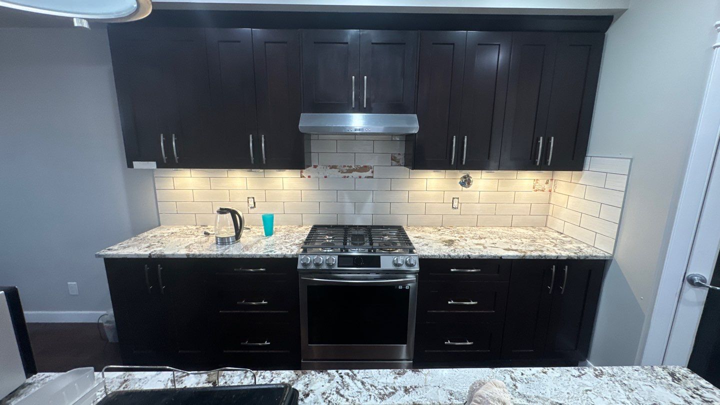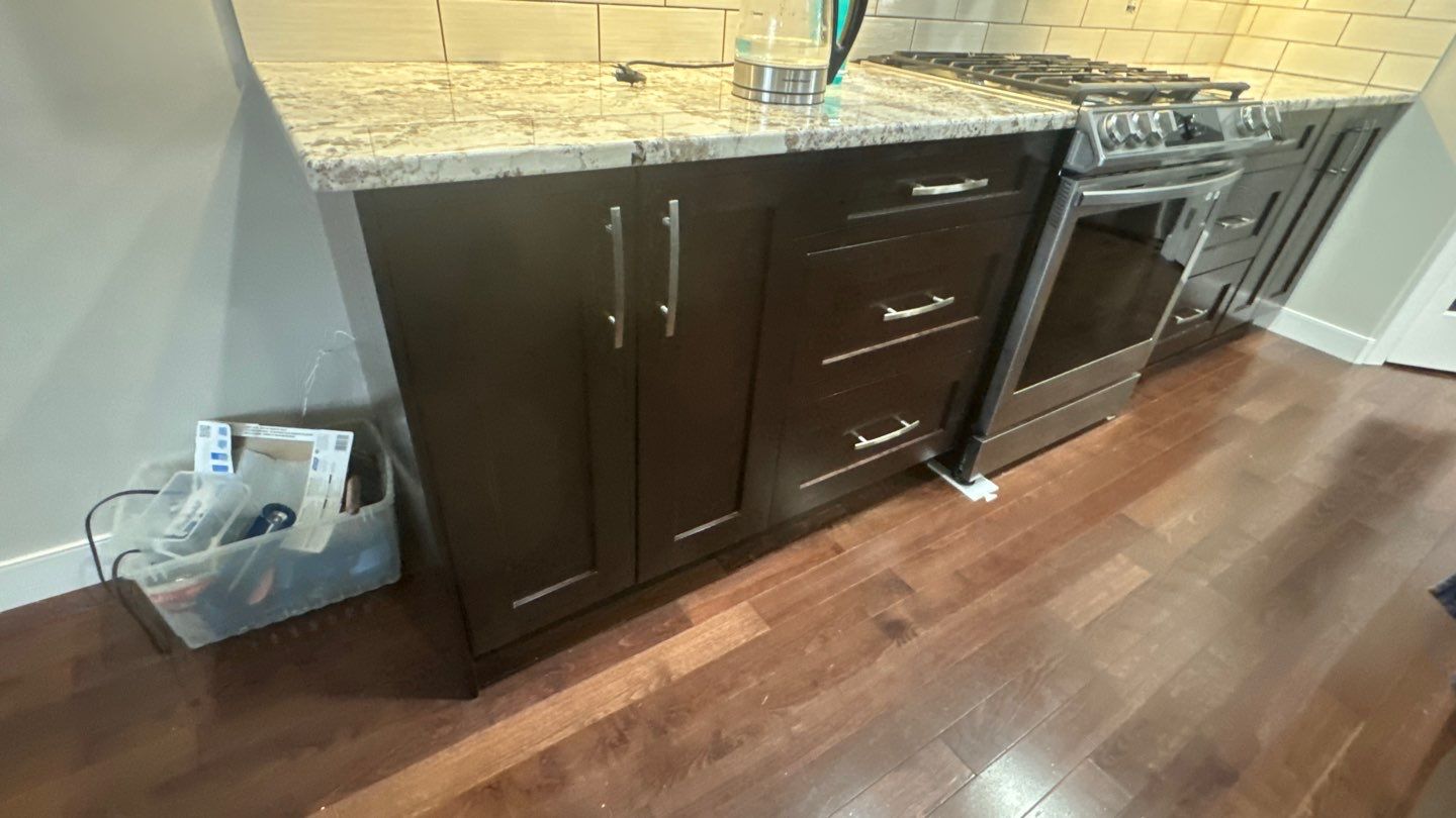 The existing cabinets were a dark brown that made the kitchen feel heavy and closed in. Our team carefully prepped and sprayed all kitchen cabinets to create a fresh, elevated look with long-lasting durability.