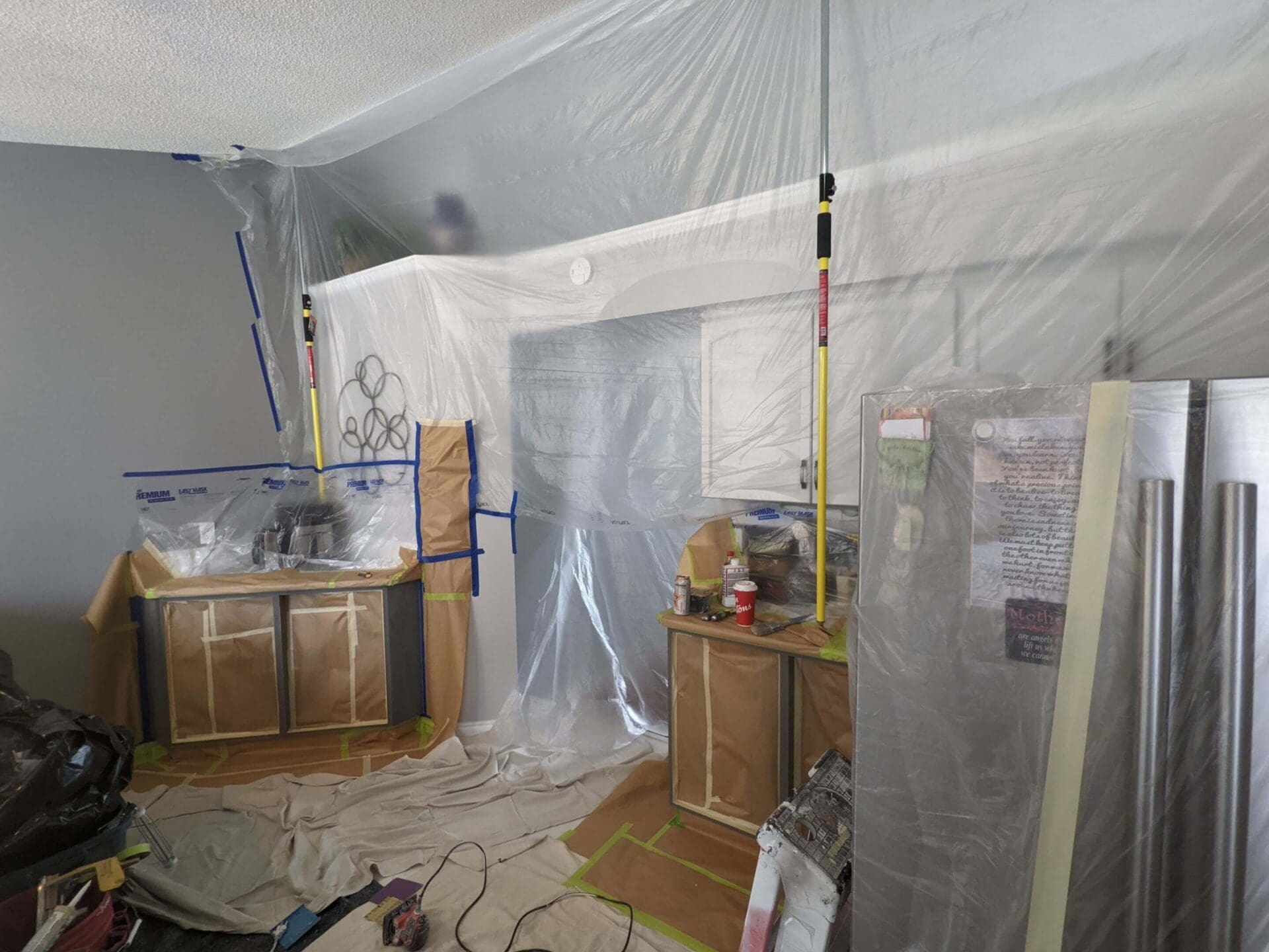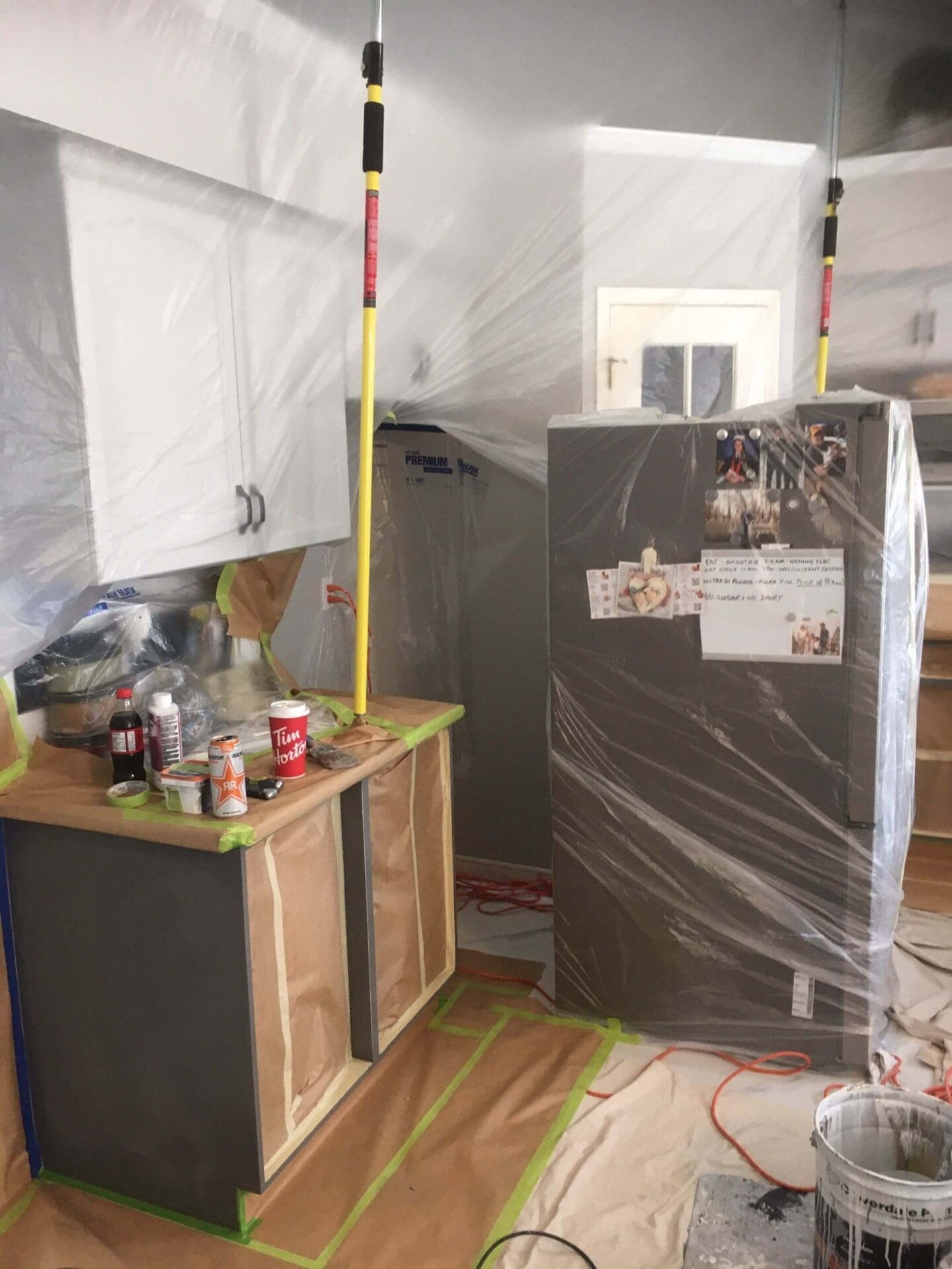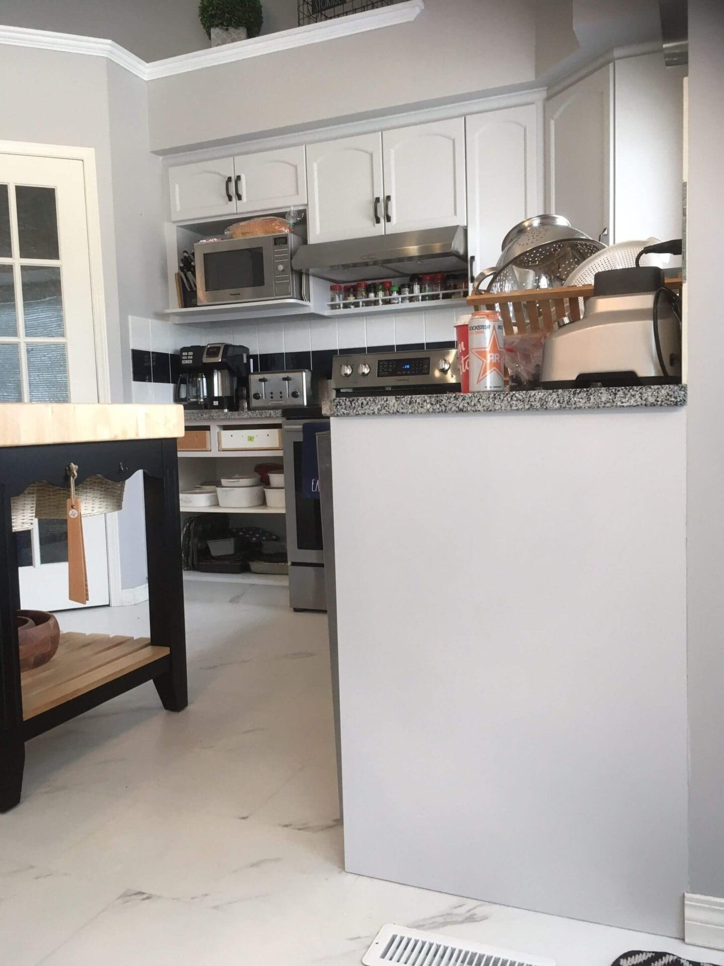Sometimes a client already has painted kitchen cabinets but would just like a freshening and brightening of the space. These painted cabinets in Citadel, NW Calgary were previously painted with Kendall Charcoal as an accent on the lowers, and we painted them to match the upper cabinets with the existing colour of Barely White for an all-around brighter look. The client was really happy with this cohesive overall grey white. Those counters and cabinet pulls really pop now!