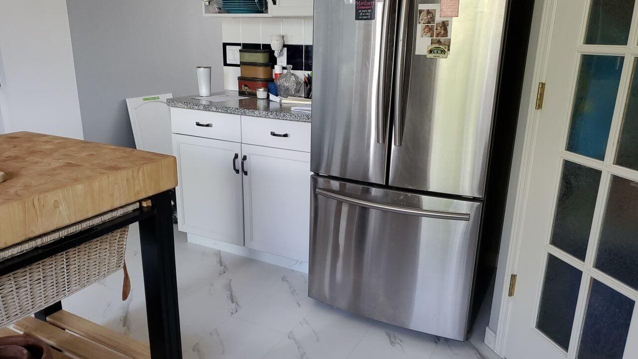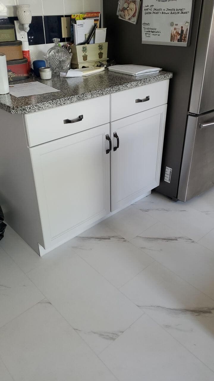 Do you have a dated and worn painted kitchen? Do you want a modern, cohesive look on your cabinets? Consider having it re-done in a vibrant and modern shade of off-white! This white/light grey kitchen was instantly modernized and the upgraded handles make this kitchen truly look brand new. Have your painted kitchen cabinet doors sanded, repaired and repainted today for a fraction of the cost to replace!