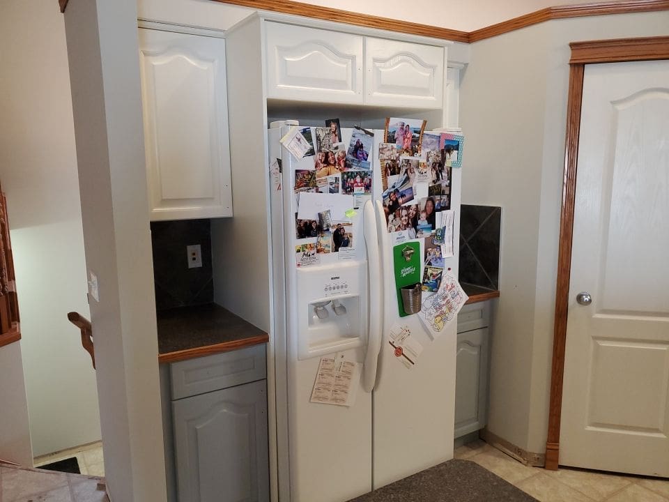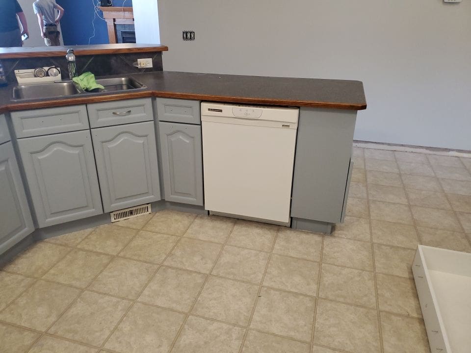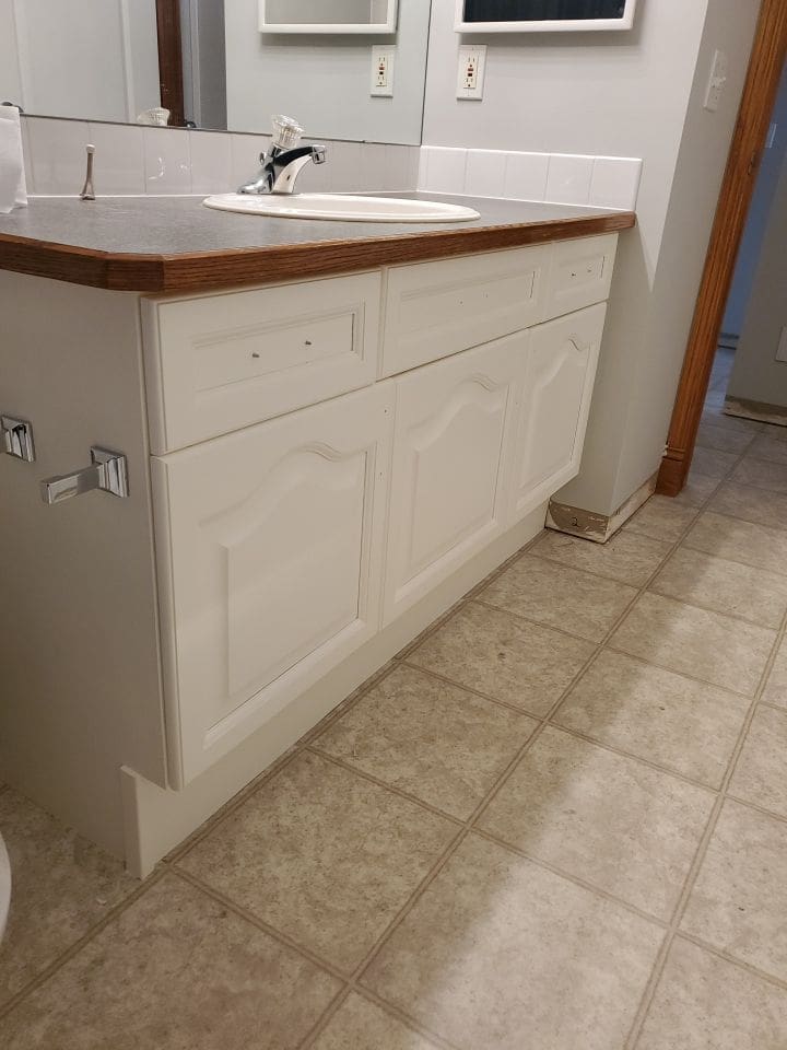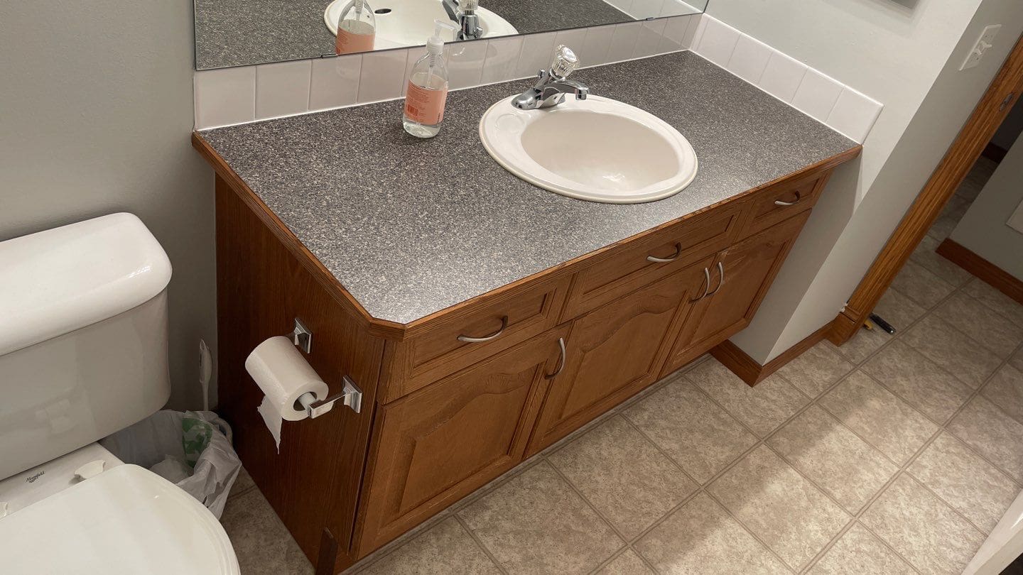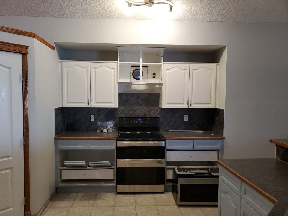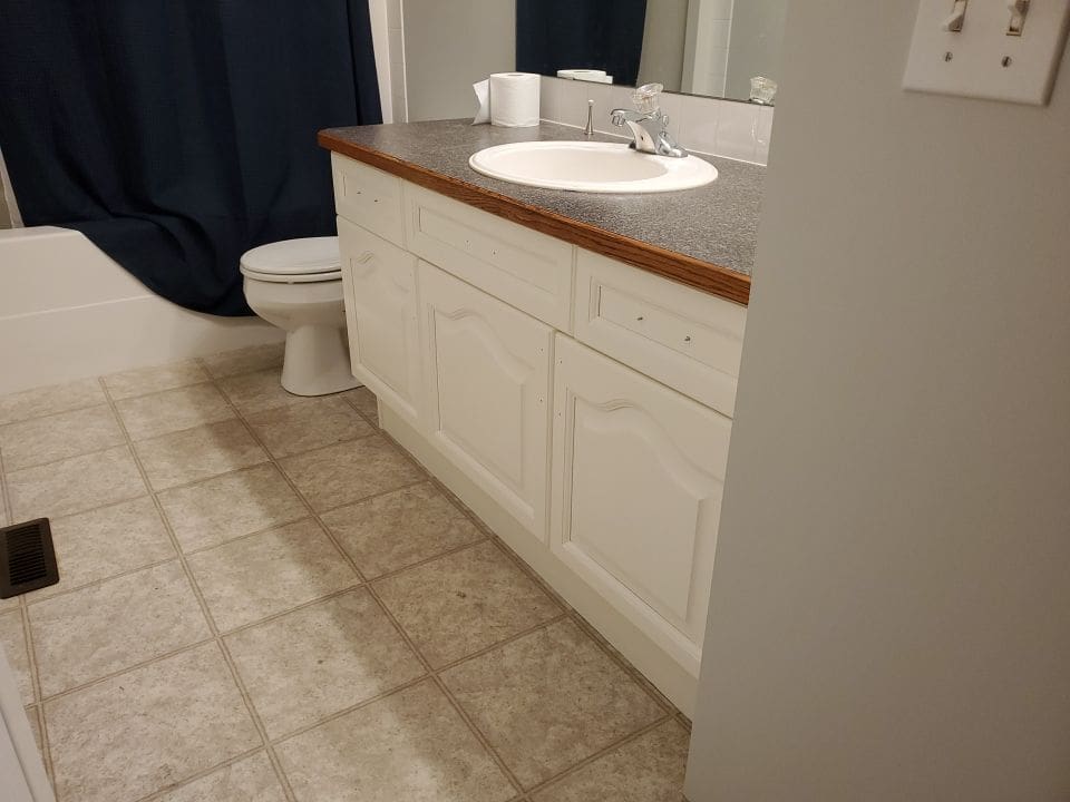 The two tone painted cabinets in the after images of this kitchen really updated the space. This project featured a full kitchen cabinetry and bathroom vanity painting in sprayed lacquer. This Airdrie home featured a ton of classic brown wood throughout, and the client wanted to update the cabinet colour with a trendy two tone colour scheme. We painted the kitchen upper cabinets and the bathroom vanity Cloud White and the kitchen lower cabinets Nimbus Grey.