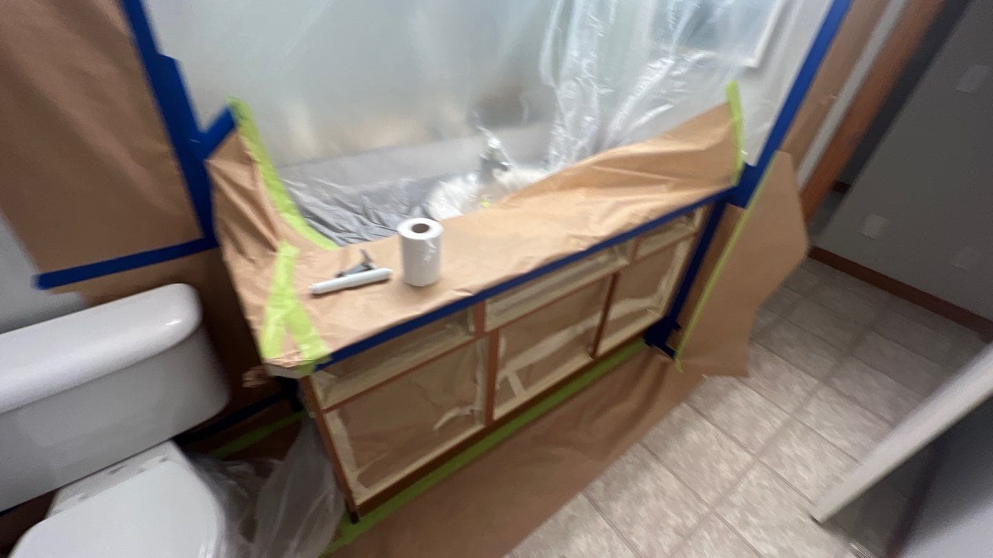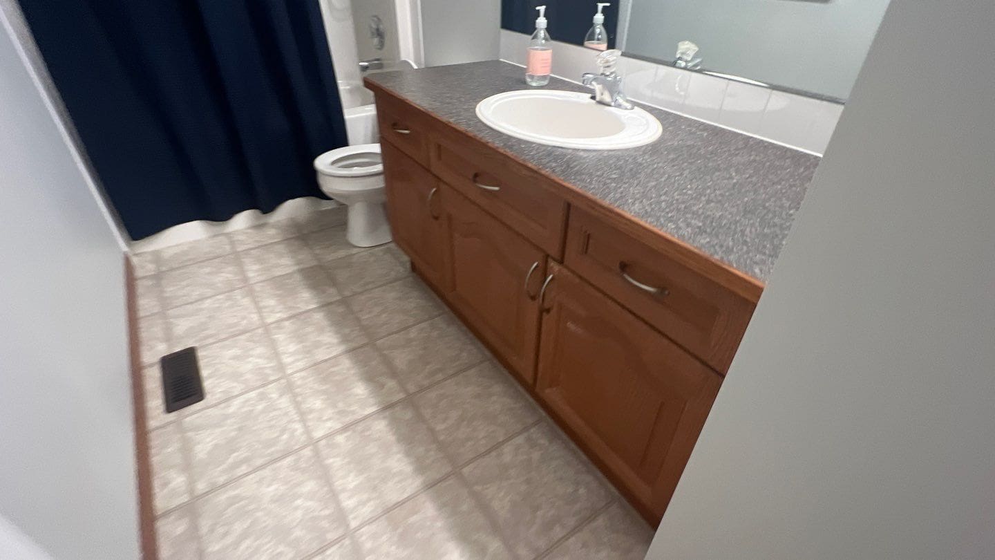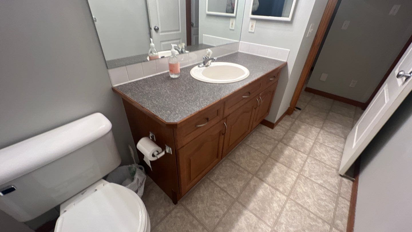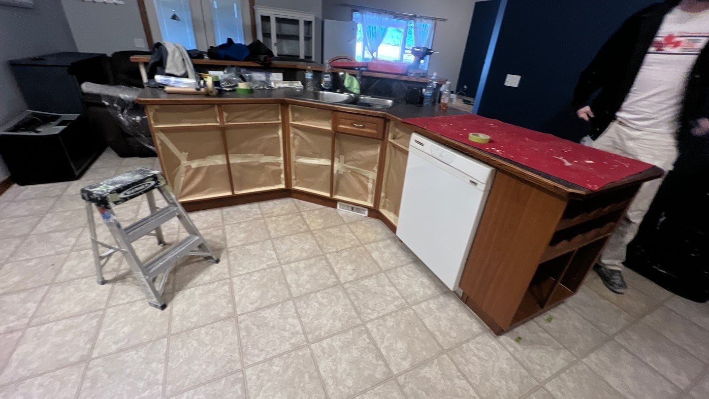 The two tone painted cabinets in the after images of this kitchen really updated the space. This project featured a full kitchen cabinetry and bathroom vanity painting in sprayed lacquer. This Airdrie home featured a ton of classic brown wood throughout, and the client wanted to update the cabinet colour with a trendy two tone colour scheme. We painted the kitchen upper cabinets and the bathroom vanity Cloud White and the kitchen lower cabinets Nimbus Grey.