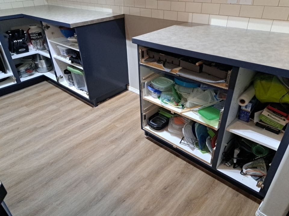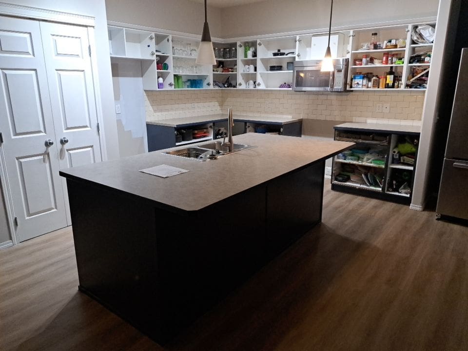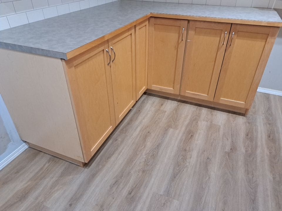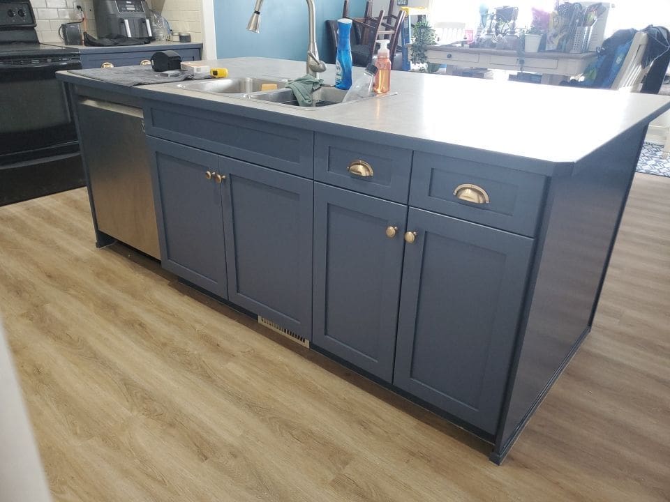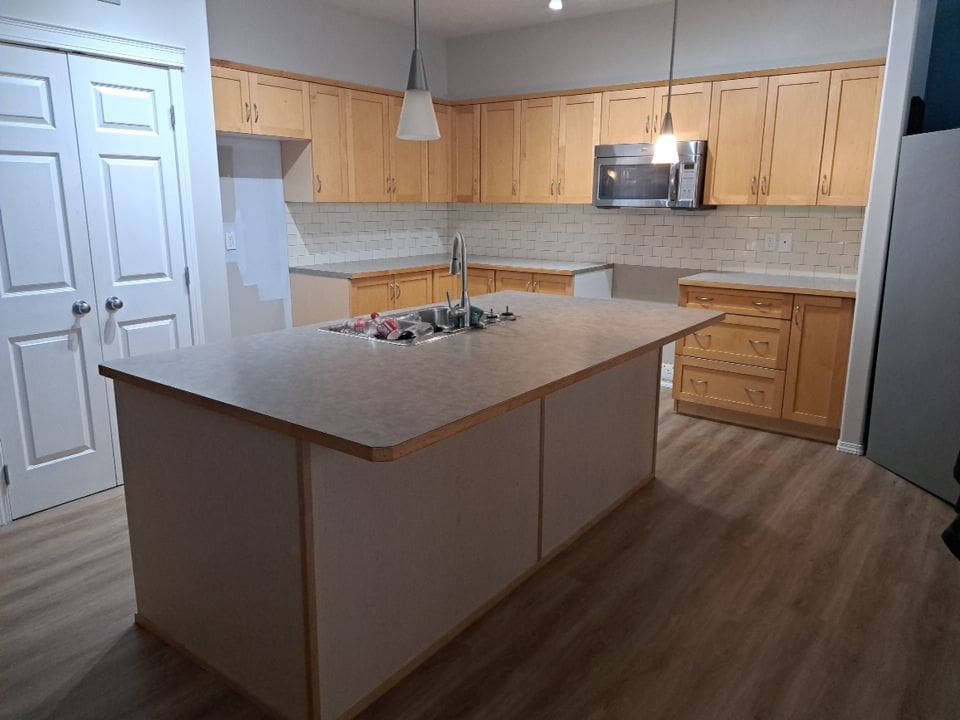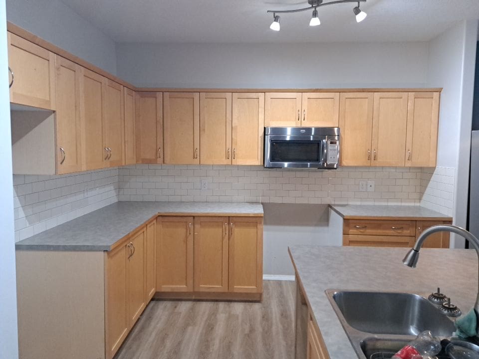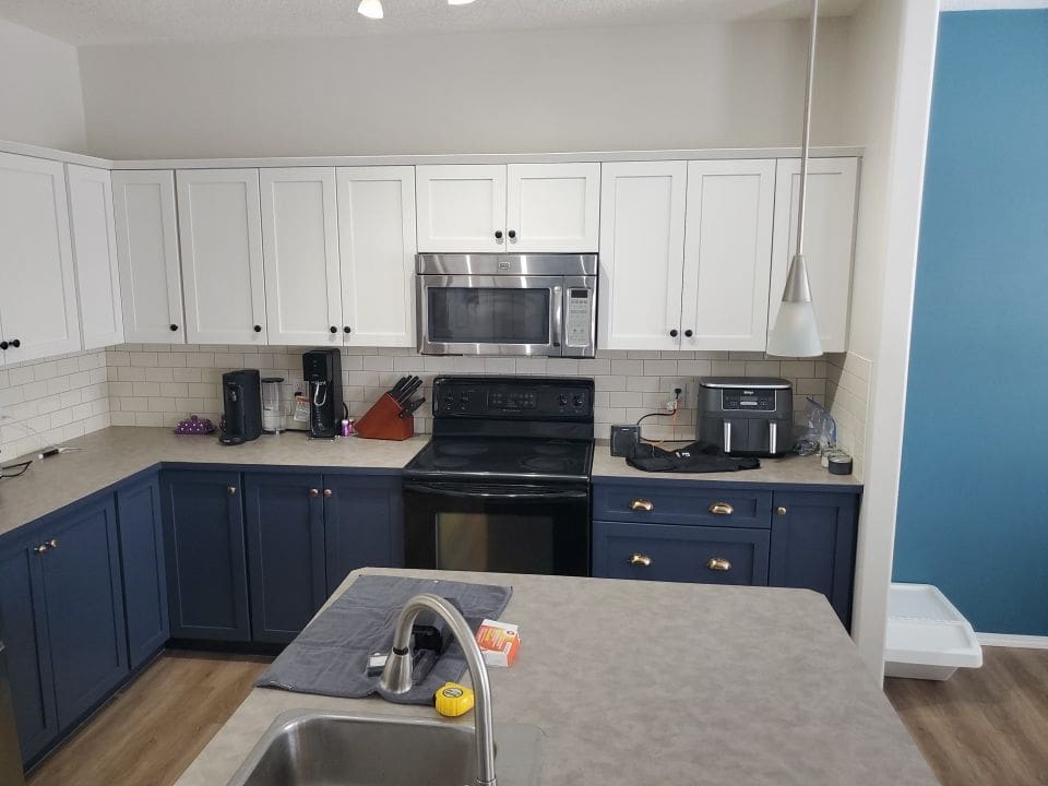 This project featured a full kitchen cabinet painting in sprayed lacquer, as well as a hardware upgrade. This Northwest Calgary home received a vibrant kitchen makeover with a trendy two tone Heron Plume for the lighter colour and Hale Navy as the dark accent. We replaced the older handles with stylish contrasting black and brass knobs. It’s hard to even imagine this dated maple kitchen could look so good once painted!