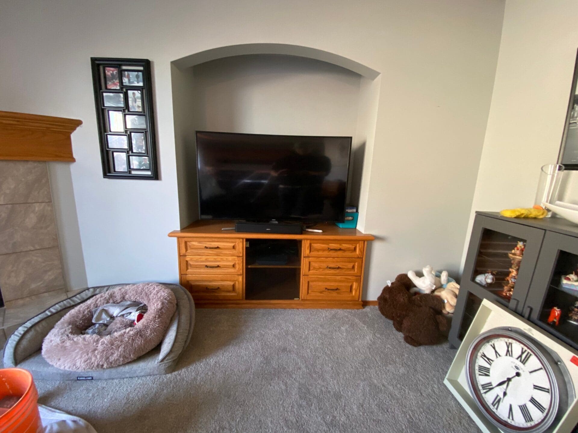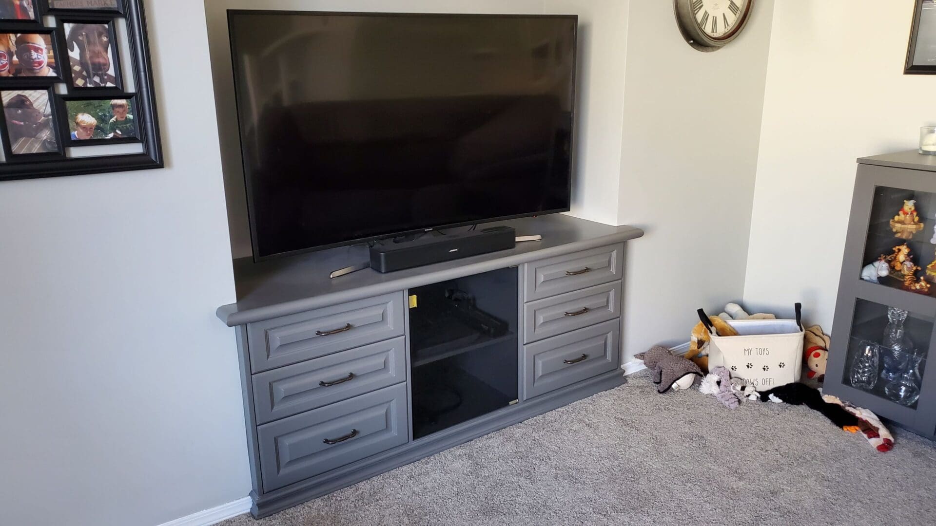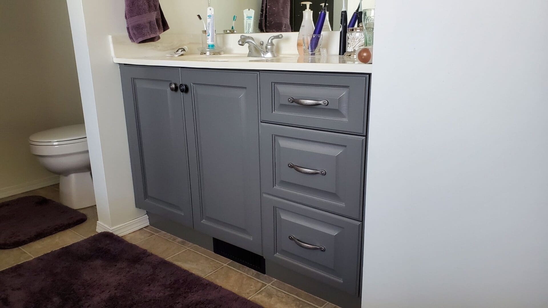This project featured a full kitchen cabinet painting as well as a banister, two bathroom vanities, laundry room, side-desk and TV stand. This Chestermere home, laden with classic orange oak, was in need of some modernization. We sprayed the upper kitchen cabinets, banister railing and laundry room cabinets a vibrant straight White, while the kitchen lowers, both bathroom vanities, side built-in desk and the built-in TV stand a popular accent grey Kendall Charcoal. The classic oak grain look was still present underneath the sprayed lacquer finish, but the new trendy two tone colour scheme instantly modernized the entire home’s interior.