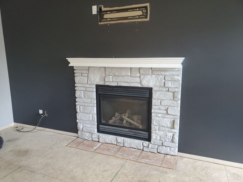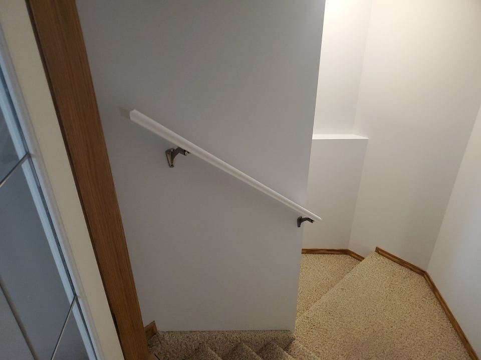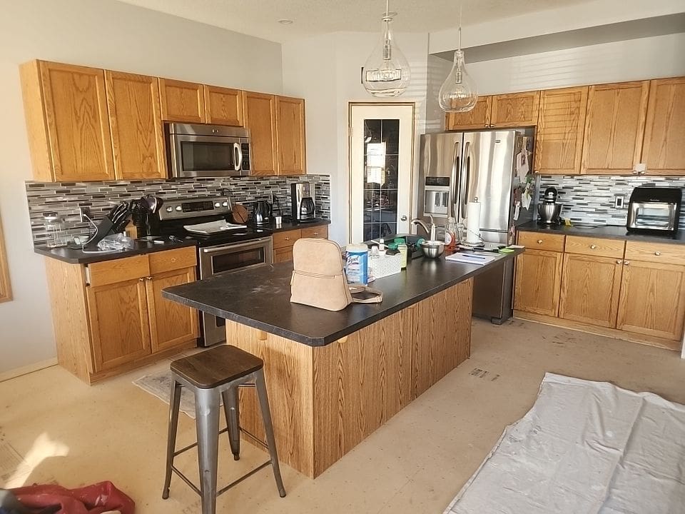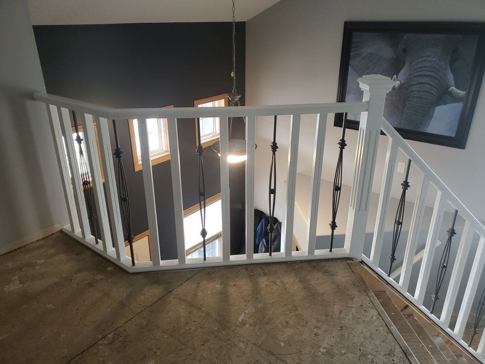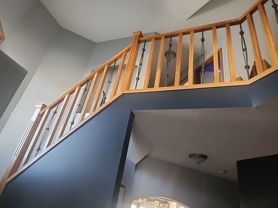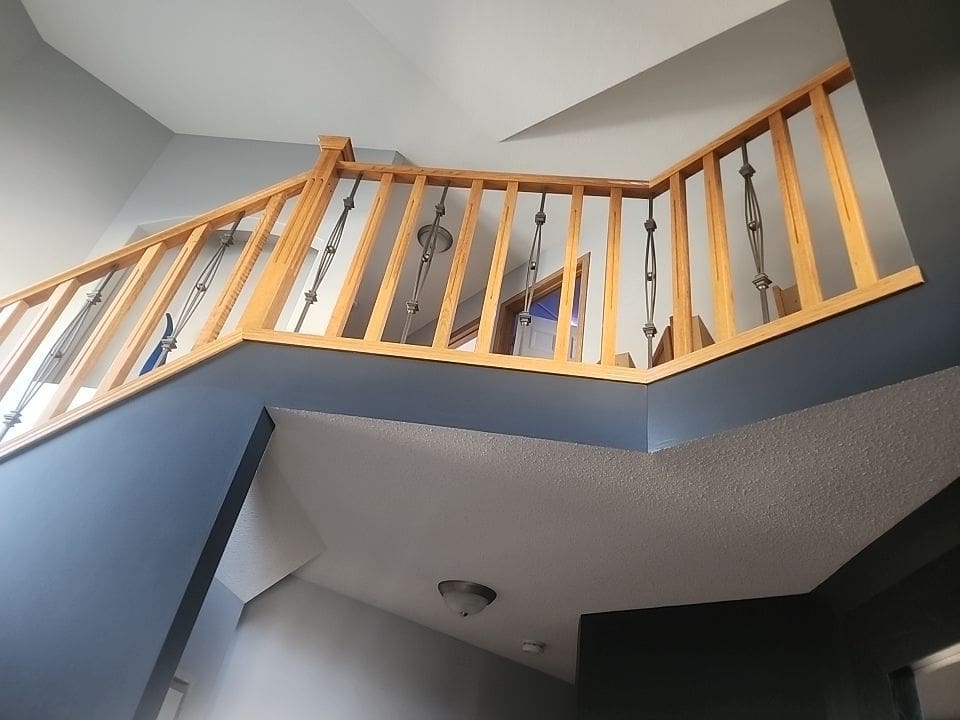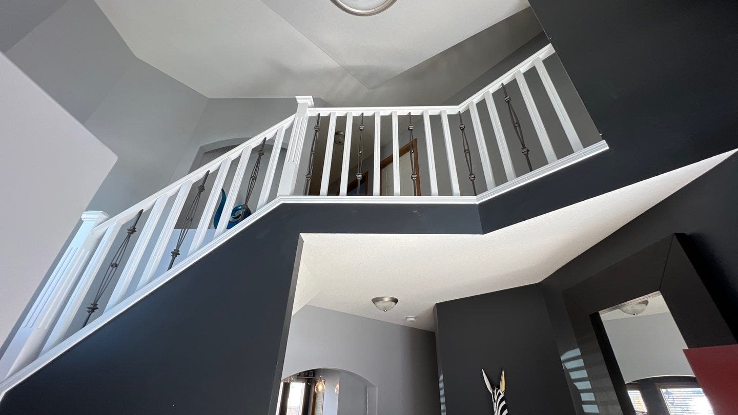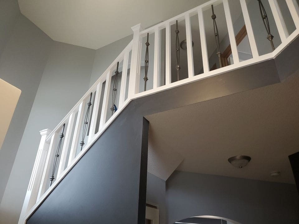 This project featured a full kitchen cabinet painting in sprayed lacquer, as well as two bathroom vanities, a banister and railings, and a fireplace mantel. This home featured classic orange oak cabinetry and railings throughout. To modernize and brighten the entire home’s interior, we updated the kitchen and bathroom cabinets with a trendy greyish-white called Big Chill. We painted the banister, railings and fireplace mantel a bright and versatile Straight White.