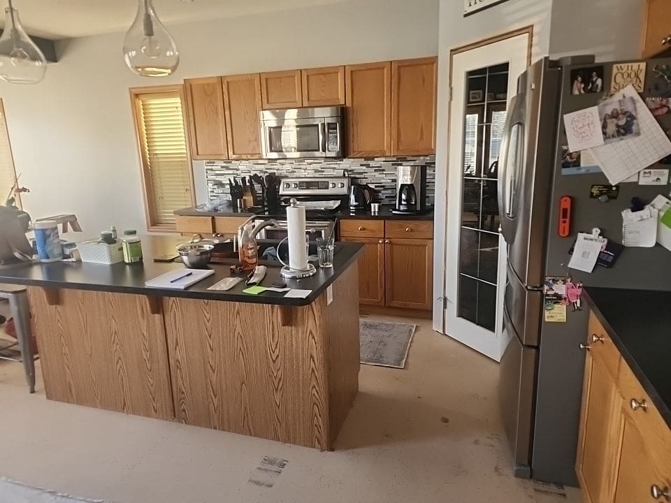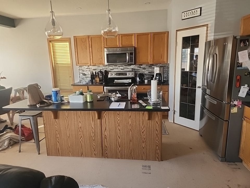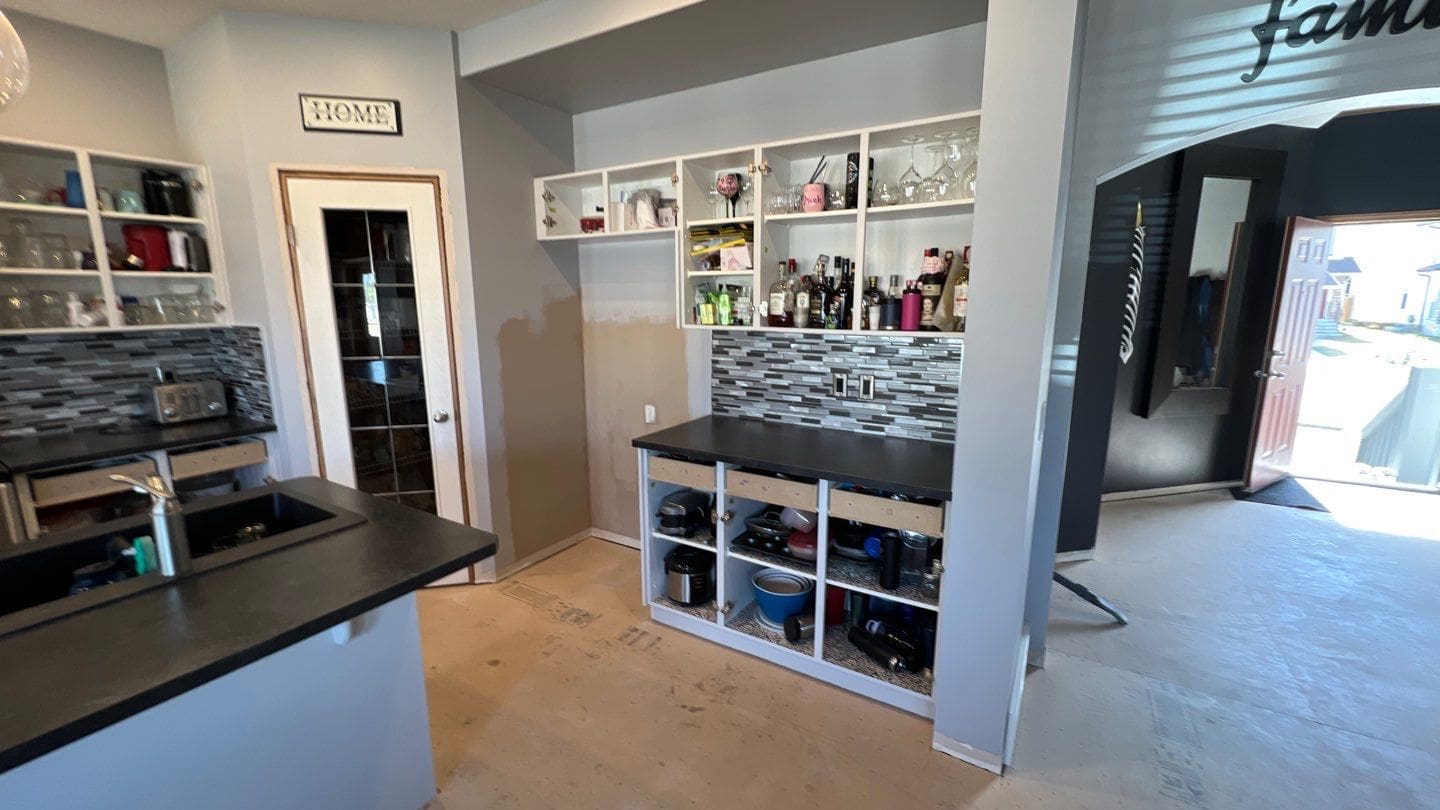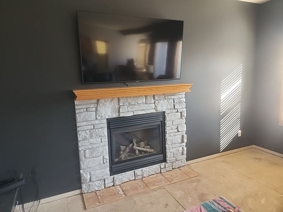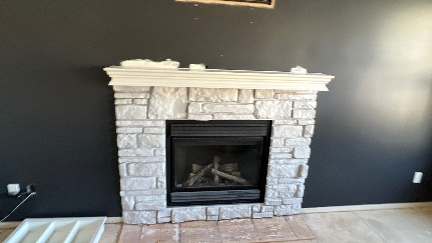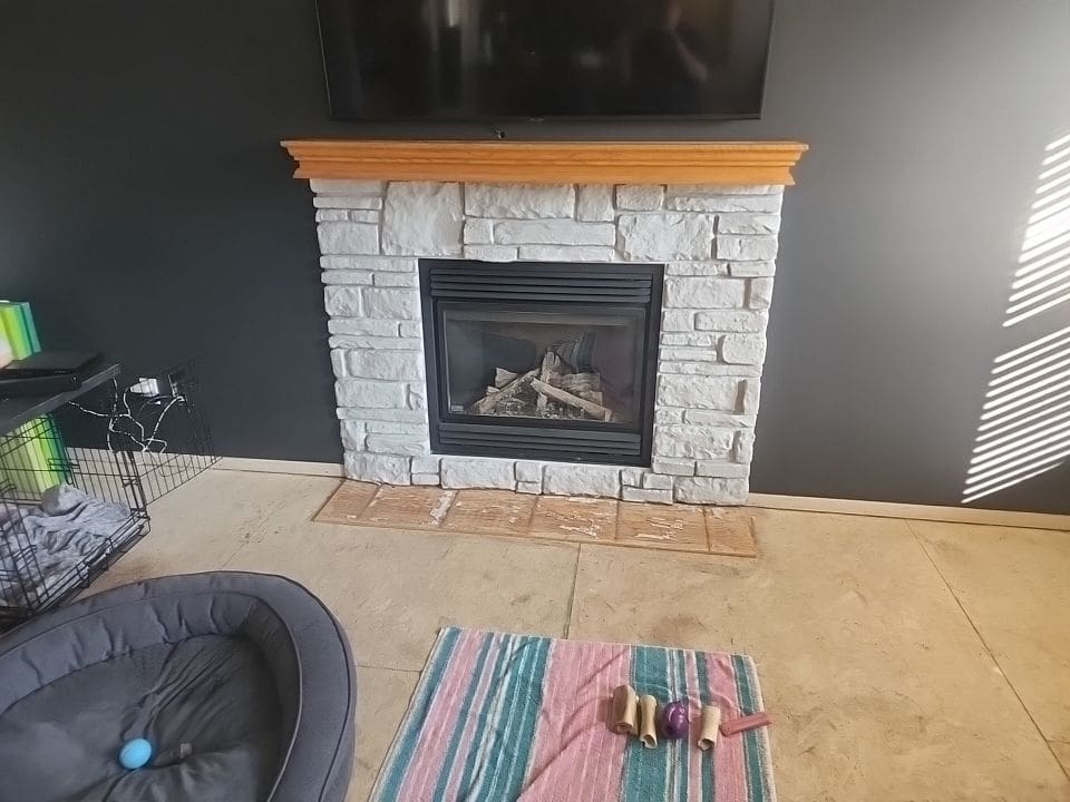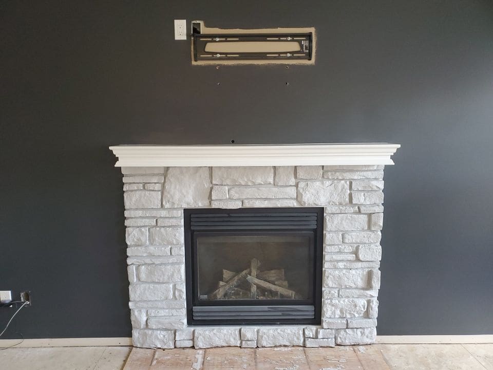 This project featured a full kitchen cabinet painting in sprayed lacquer, as well as two bathroom vanities, a banister and railings, and a fireplace mantel. This home featured classic orange oak cabinetry and railings throughout. To modernize and brighten the entire home’s interior, we updated the kitchen and bathroom cabinets with a trendy greyish-white called Big Chill. We painted the banister, railings and fireplace mantel a bright and versatile Straight White.