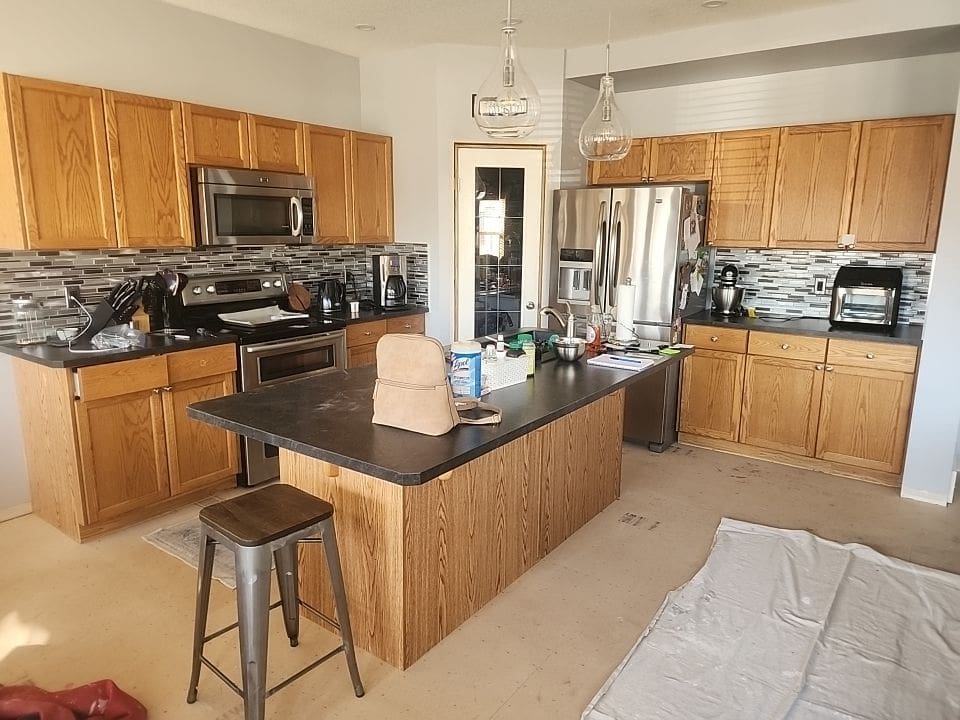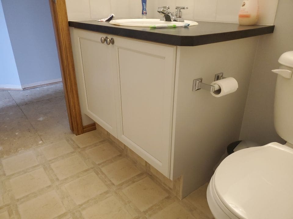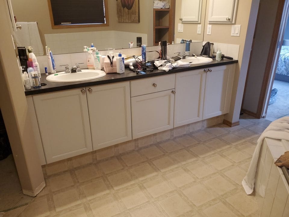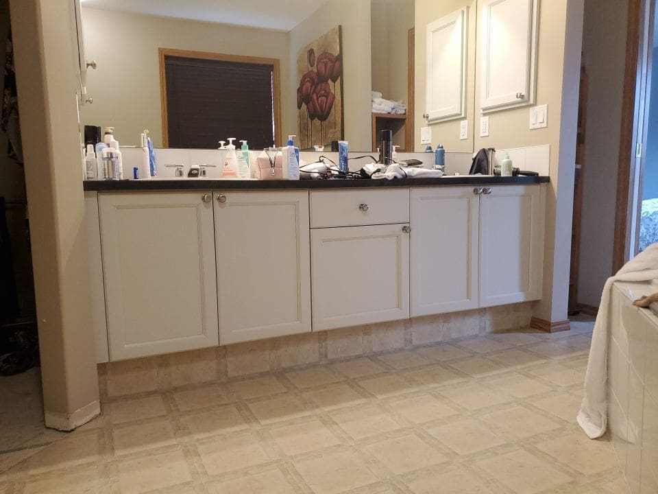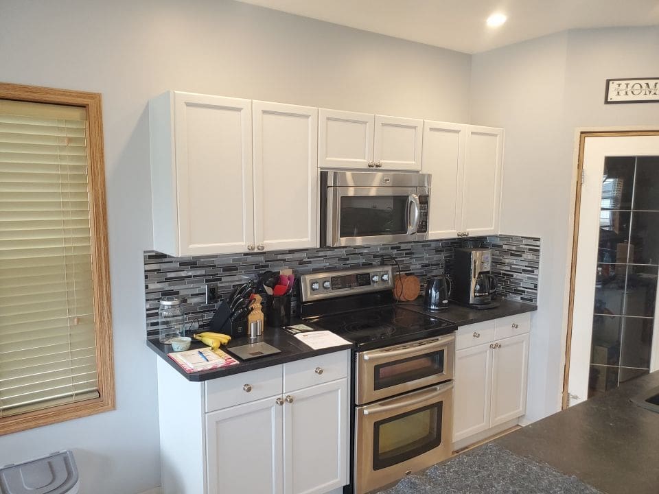 This clients home was vastly updated by this quick and cost effective renovation. The before and after photos speak for themselves! Do you have classic orange oak cabinets? Consider having them painted a stylish and modern shade of white! It not only instantly modernizes your home, but renews your cabinetry doors and wooden fronts in such a way that makes them look brand new once the painting is done. Don’t replace your aging cabinetry when you could easily get another ten or fifteen years of good use out of them!