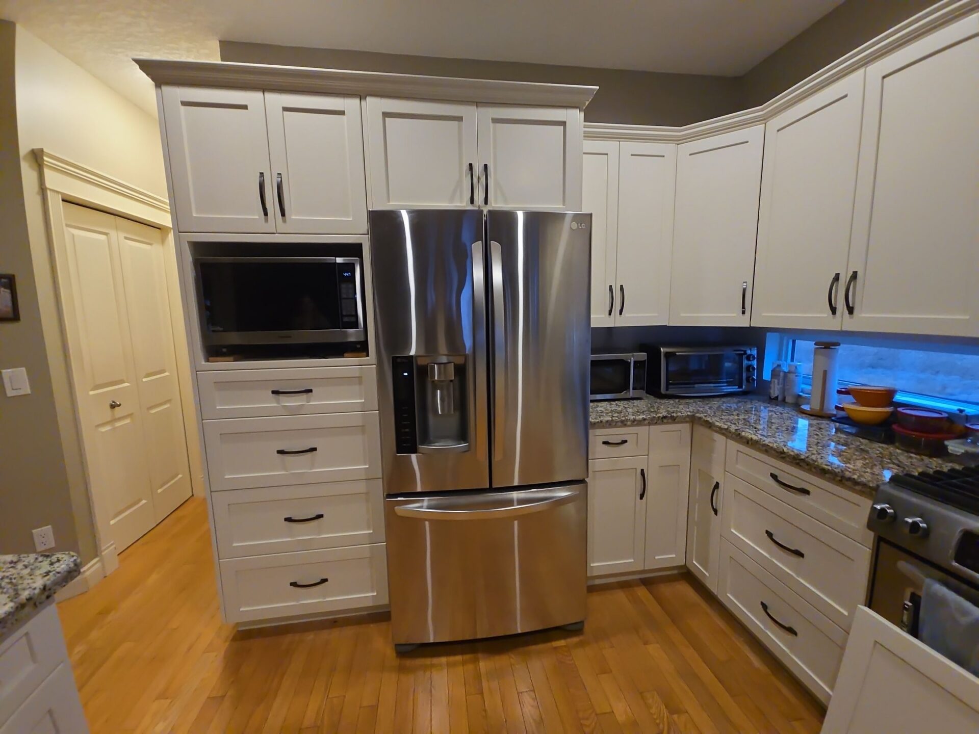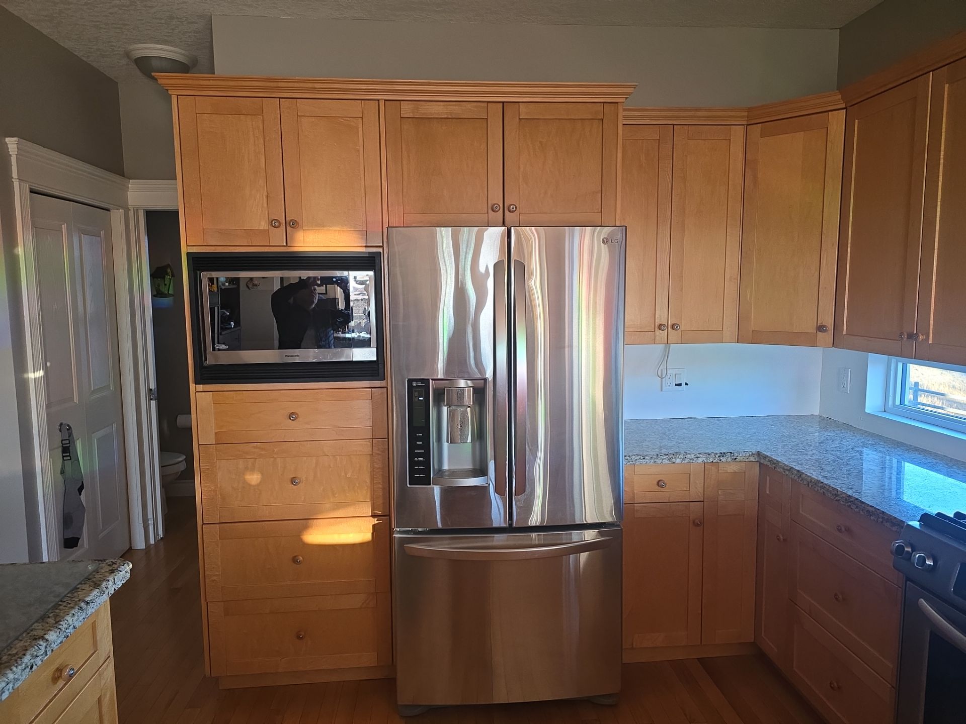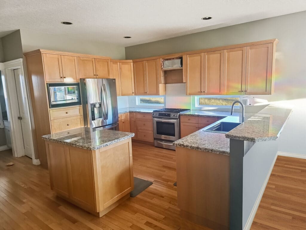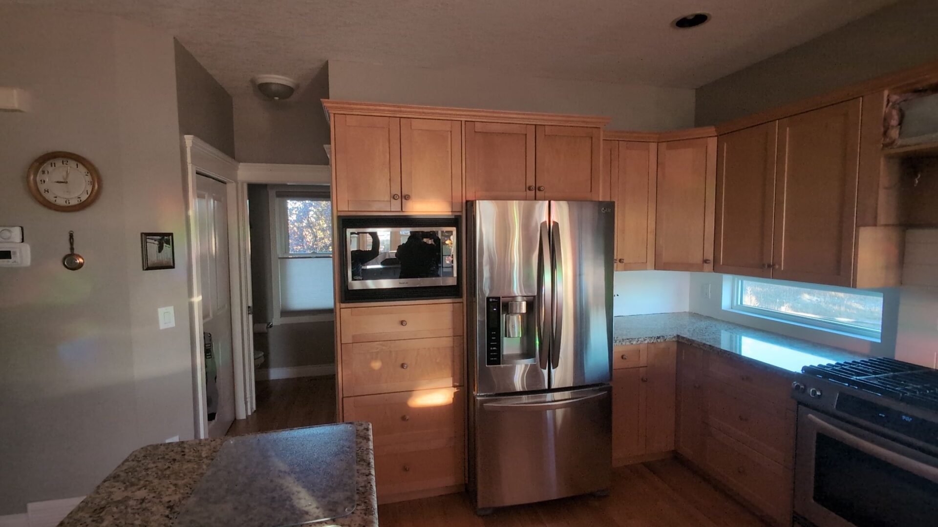 This project featured a full kitchen cabinet painting in professional spray coatings. See how professional kitchen cabinet painting transformed orange maple cabinets into a bright, custom off-white finish that flows with the rest of the home. This cabinet painting project focused on creating a brighter, more cohesive look that matched the rest of the home. By updating the existing orange maple cabinets with a custom-matched off-white finish, the kitchen was transformed into a clean, open space that complemented the homeowner’s décor and artwork.