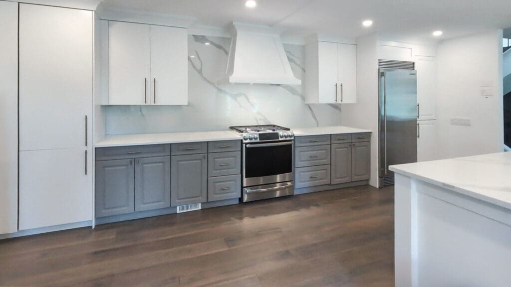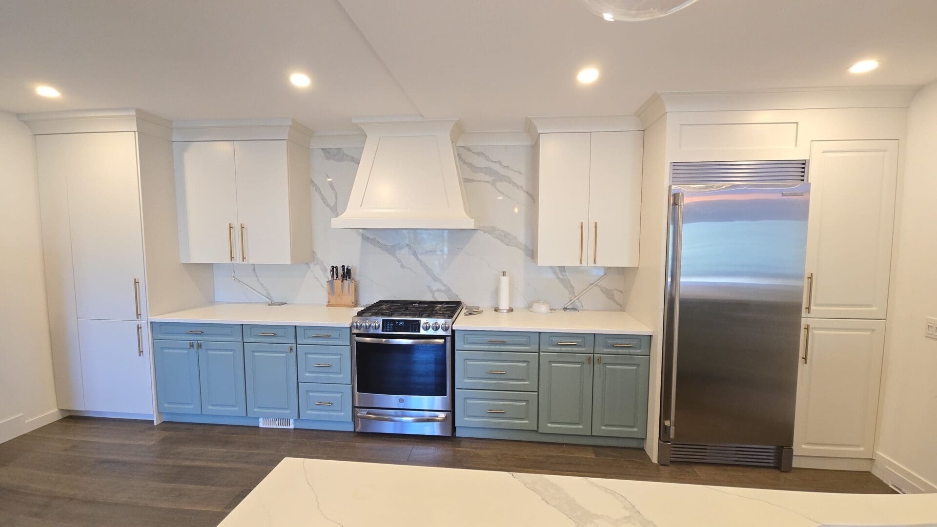 Do you have already-painted cabinets in need of a refresh? Consider having them re-done in vibrant, modern shades using professional spray coatings! This two-tone white and neutral blue-green kitchen was instantly modernized with these fresh, creative colours. Have your painted kitchen cabinet doors sanded, repaired and repainted today for a fraction of the cost to replace!