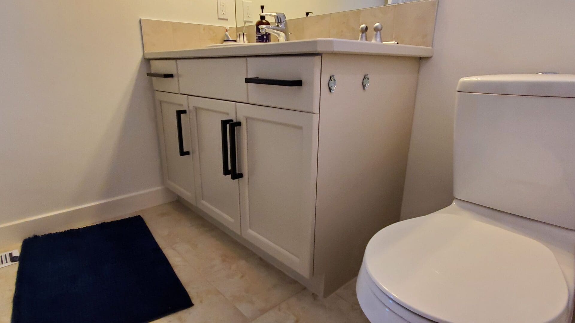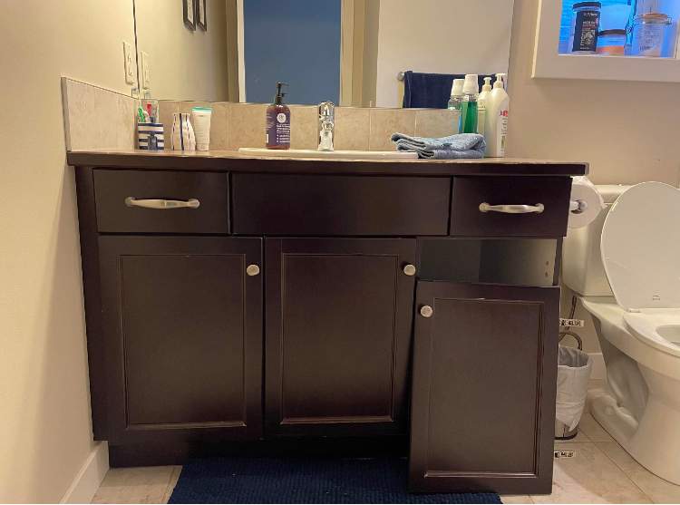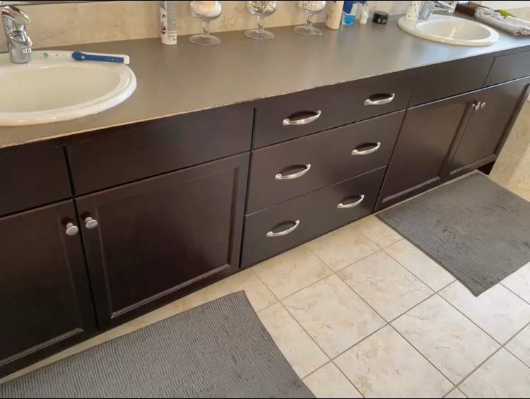 This project featured cabinetry painting on two bathroom vanity sets, as well as striking new hardware. This client wanted to update their outdated dark brown bathroom vanities in favour of a trendy and modern earthy-grey shade of sprayed lacquer called Revere Pewter. We also filled the old handle holes and drilled each door for a new and much larger, super stylish black accent handle. This brown to grey painted bathroom cabinets job instantly turned this home’s upstairs into a refreshed focal point. Do you have dated dark brown wood bathroom cabinets? Consider having them painted a subtle, modern shade of grey! It not only instantly modernizes your bathroom vanities but renews your cabinetry doors and wooden fronts in such a way that makes them look brand new once the painting is done. Consider a cabinet painting job today to update and modernize your home’s bathroom vanities!