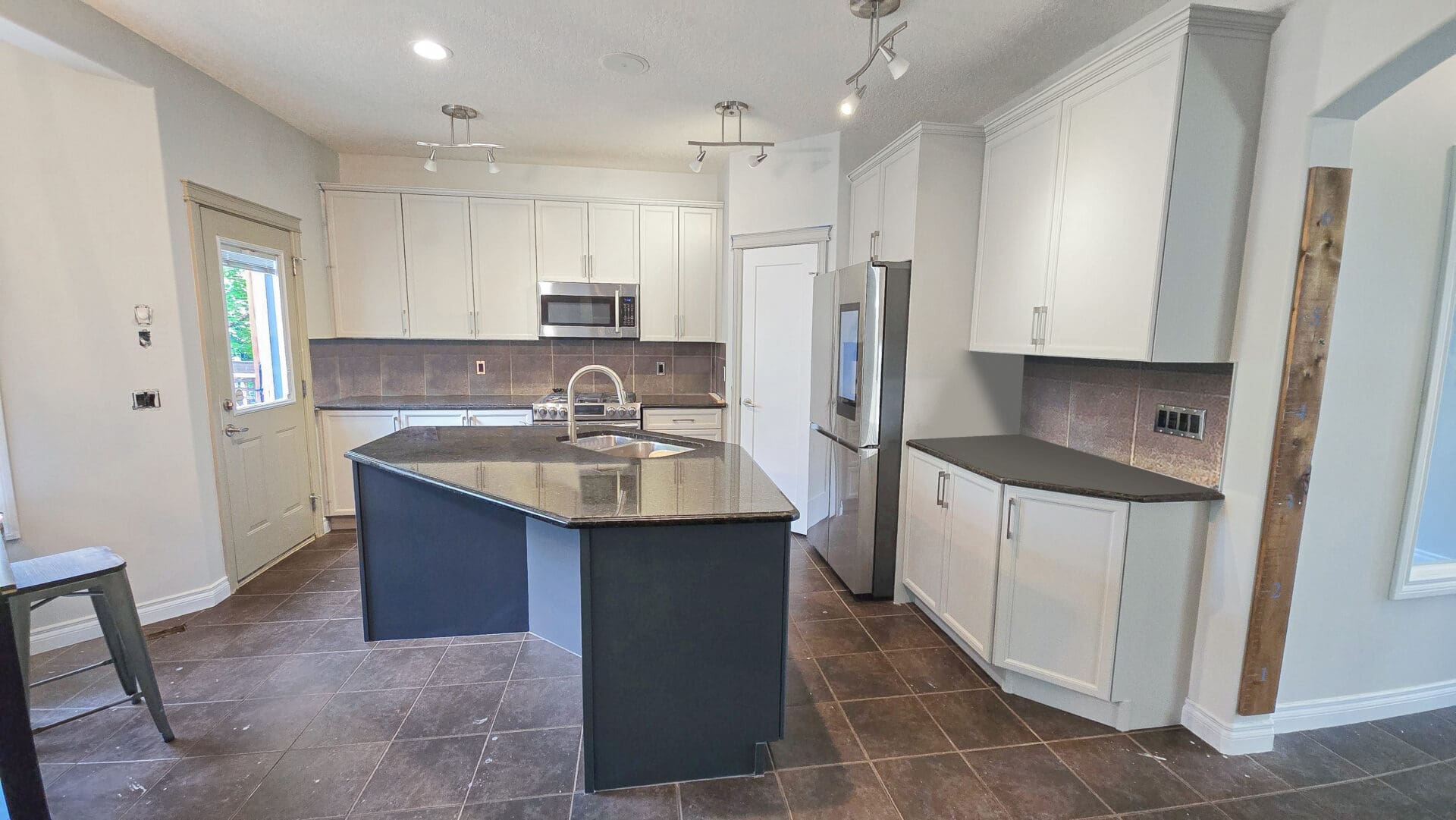 This project featured professional spray coatings on the kitchen cabinets, banister rails, fireplace mantel, entryway doors throughout the house, the laundry room cabinets, office desk built-in and all the bathroom cabinets. This client of ours wanted a full refresh of virtually all the cabinets in their home in a variety of stylish, modern colours. The main kitchen cabinets, the pantry door and frame, the fireplace, laundry room, and upstairs bathroom were painted in Revere Pewter, a stunning neutral gray-beige with warm undertones. The kitchen island, the master bathroom and office desk were painted in Jabberwocky, a darker gray with subtle, warm reddish brown undertones. The banister railing and entryway doors were painted pure white, to match the rest of the home’s trim. The end result was a contemporary array of stylish, complementary colours that modernized the whole of this home’s interior. The perfect finishing touch – upgraded modern bar-style handles on all the doors and drawers.