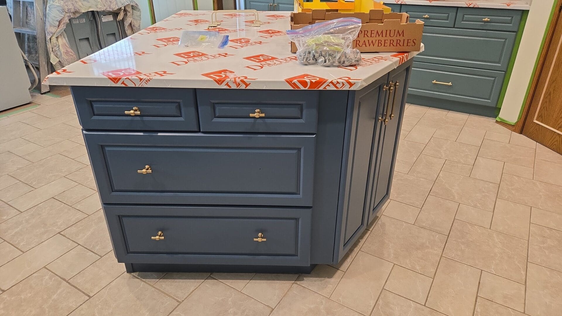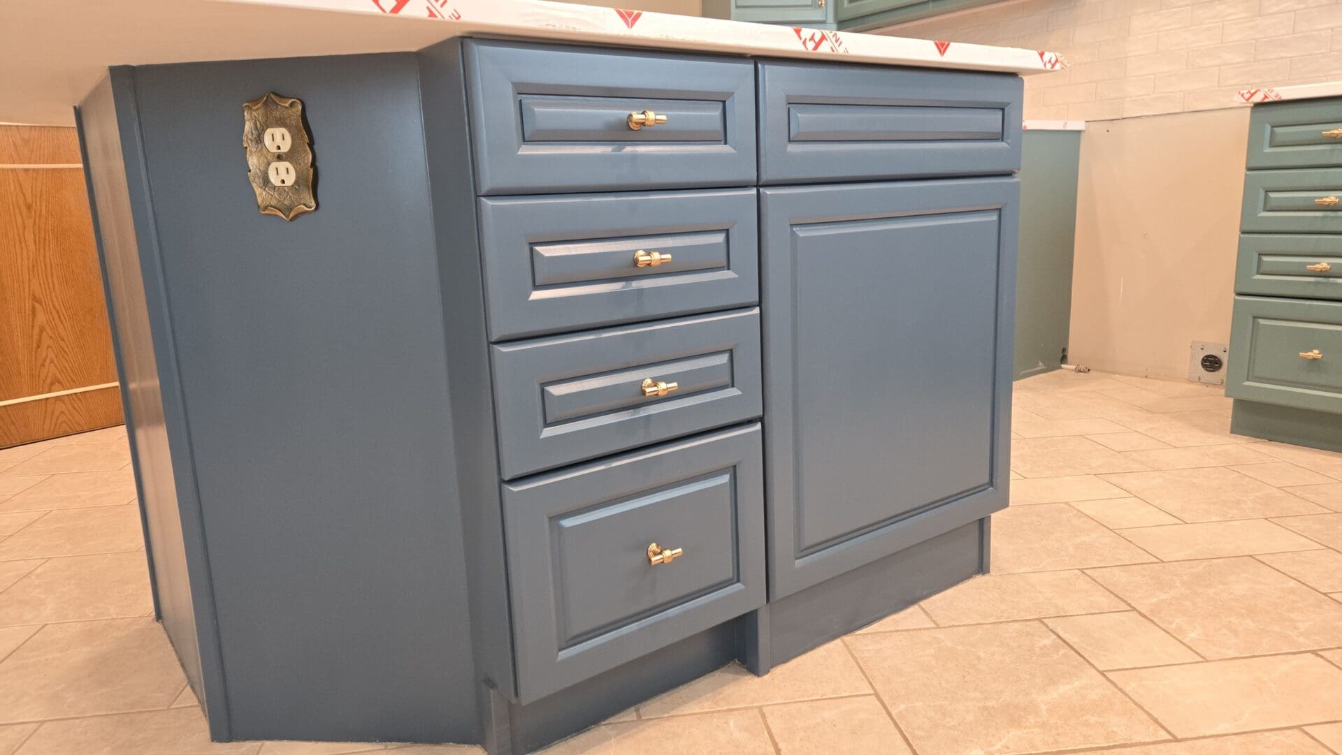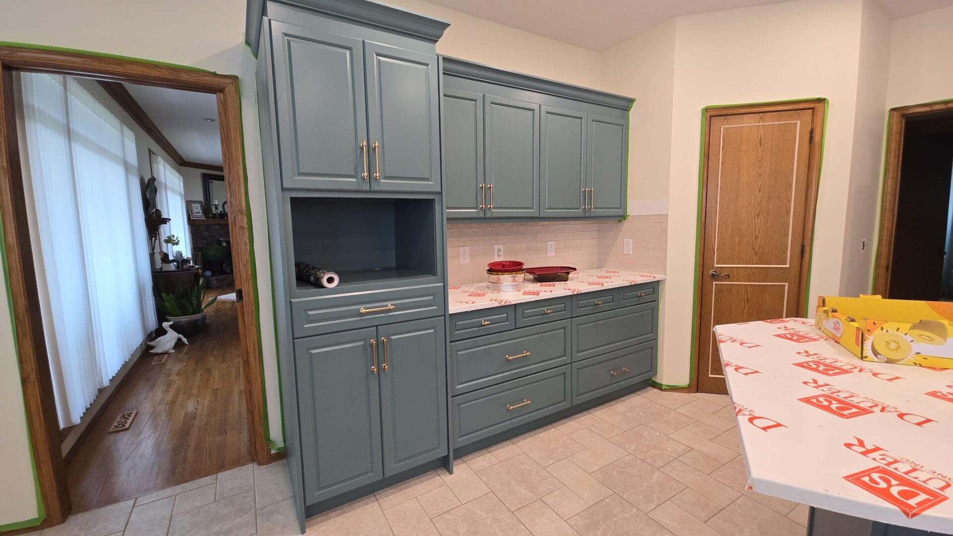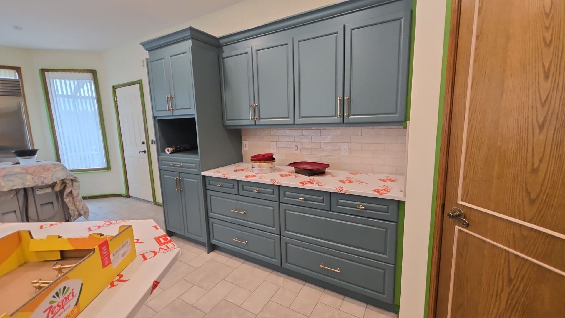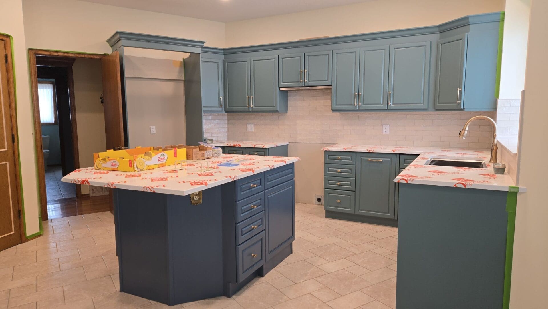 This project featured a full kitchen cabinet painting using professional spray coatings. This client of ours wanted to transform their dated, dark red stain kitchen cabinets using a stylish and very unique two-tone colour scheme, as part of a larger kitchen remodel they had already undertaken. To create the kitchen of our client’s dreams, our team painted the perimeter cabinets a stylish, neutral teal blue called Caribbean Teal, while the island was painted a darker blue accent colour called Deep Water. The perfect finishing touch: upgrading all the handles on the doors and drawer fronts to an elegant, modern bar-style design in polished brass. The two-tone colour scheme with the new hardware, finished off with the client’s new countertops and backsplash meant a complete transformation for this kitchen space.