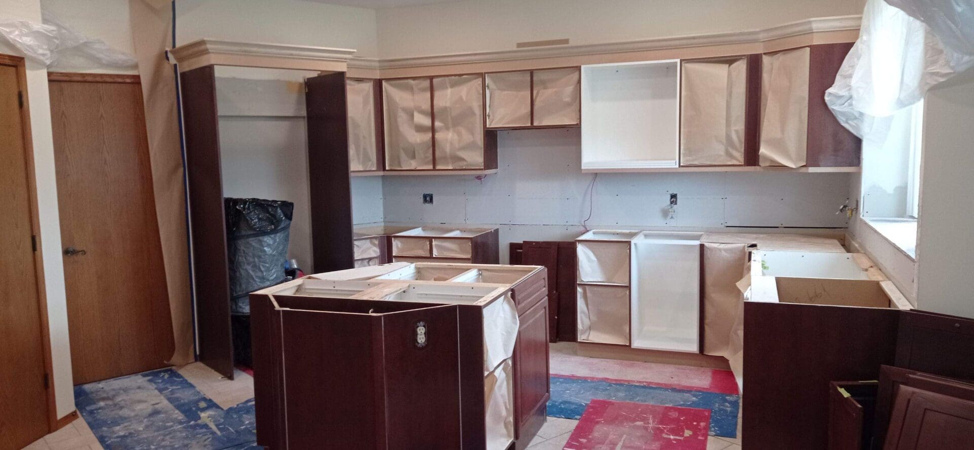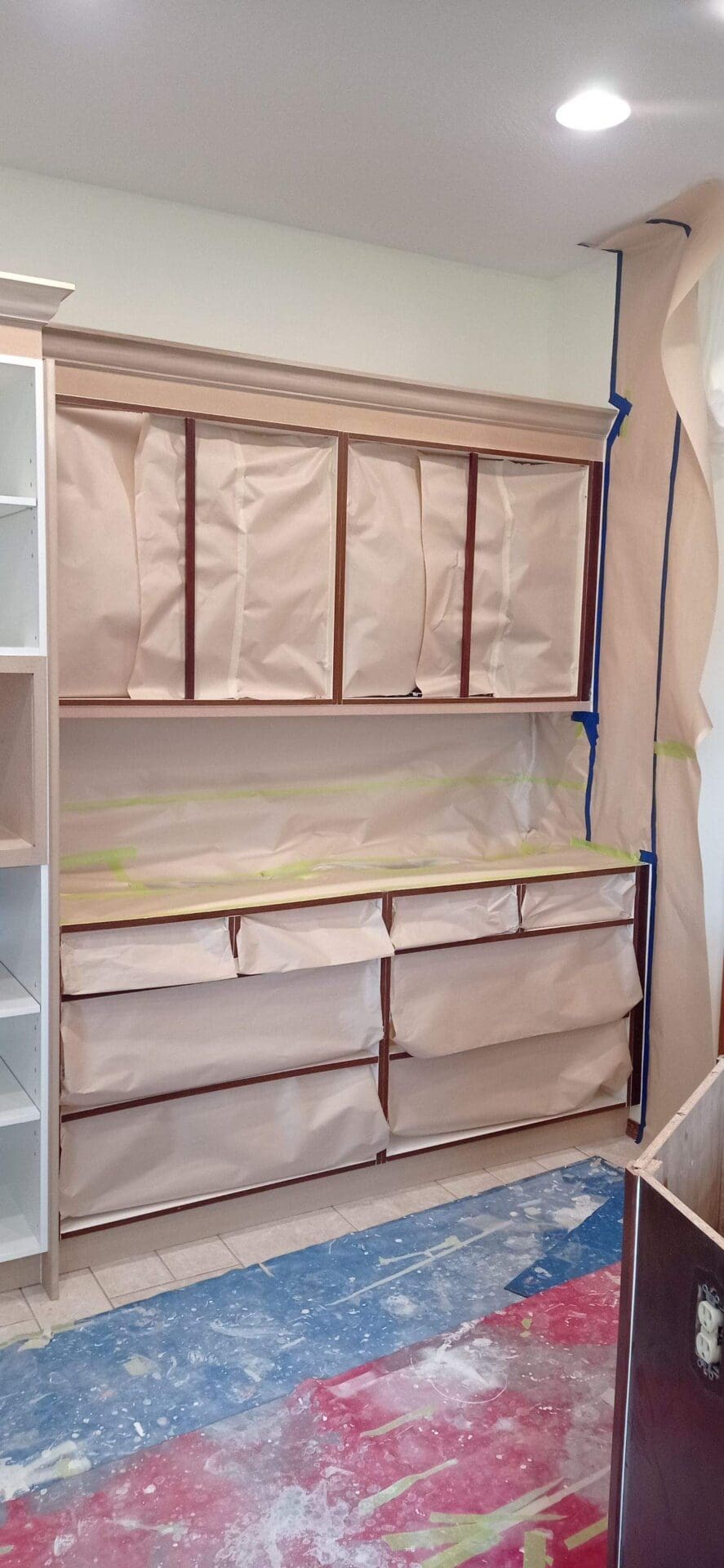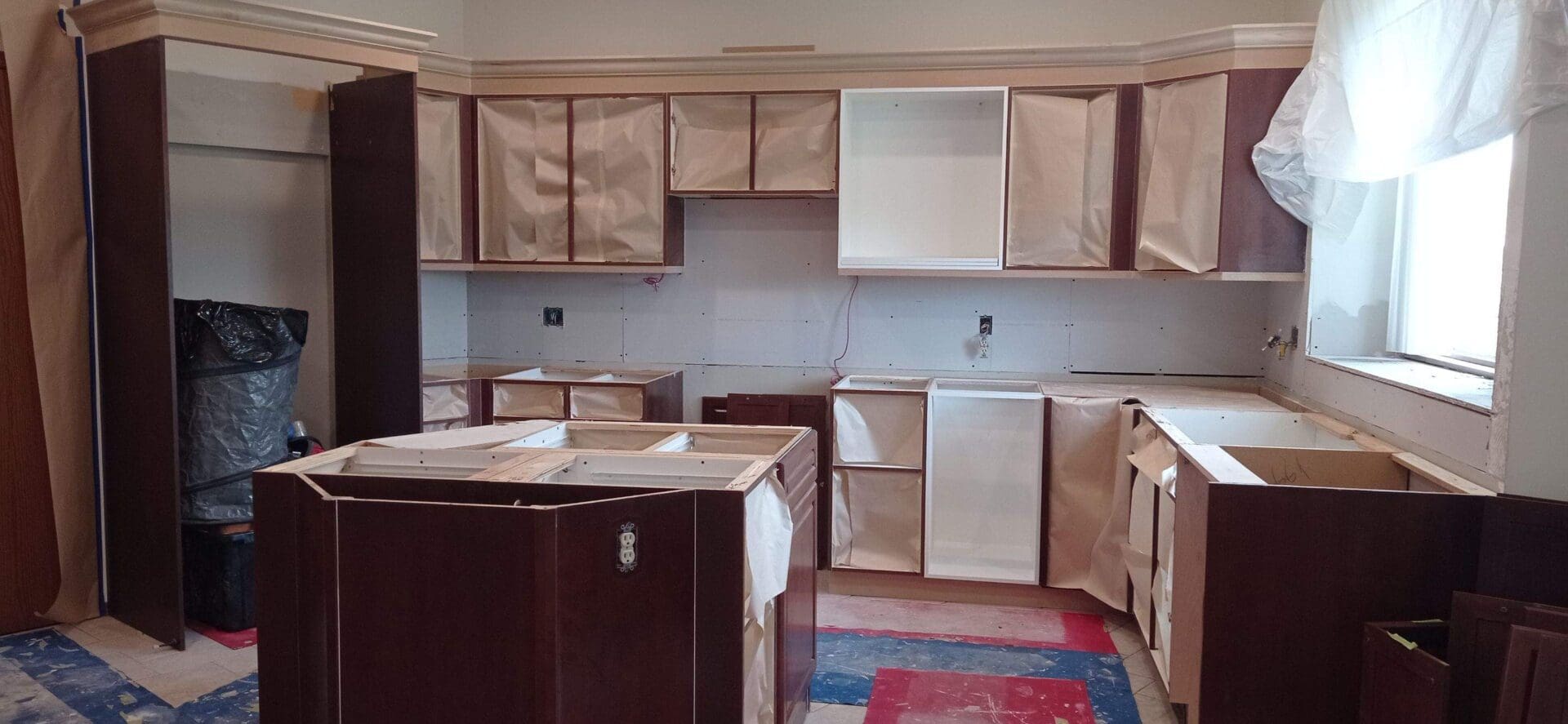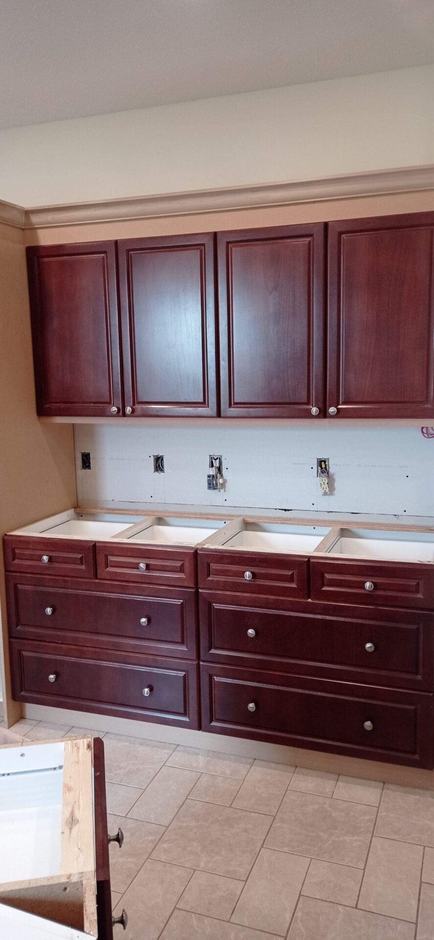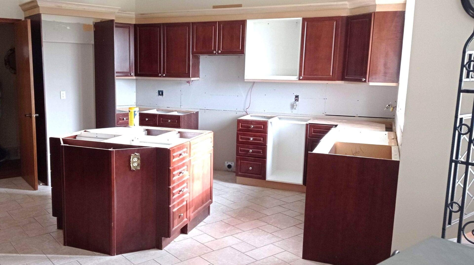 Do you have dated, dark red kitchen cabinets? Consider having them painted in a stylish and modern two-tone! These dark and dated cabinets were modernized with a fresh two tone colour scheme and contemporary hardware that instantly transformed the kitchen space. Replacing your cabinetry can be very expensive, and in most cases the doors and boxes you already have are still in great shape! Save money and add professional spray coatings to your cabinets as part of your next kitchen remodel!
