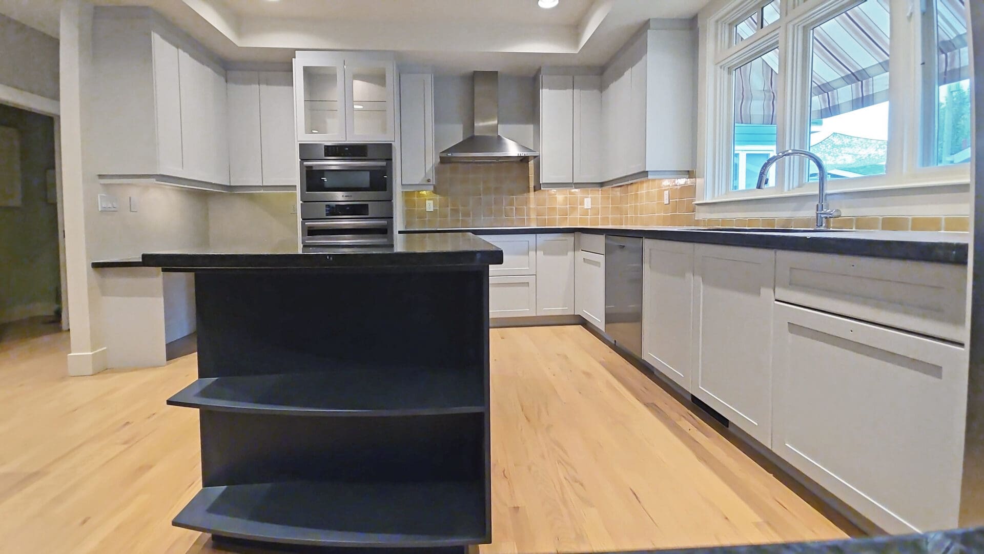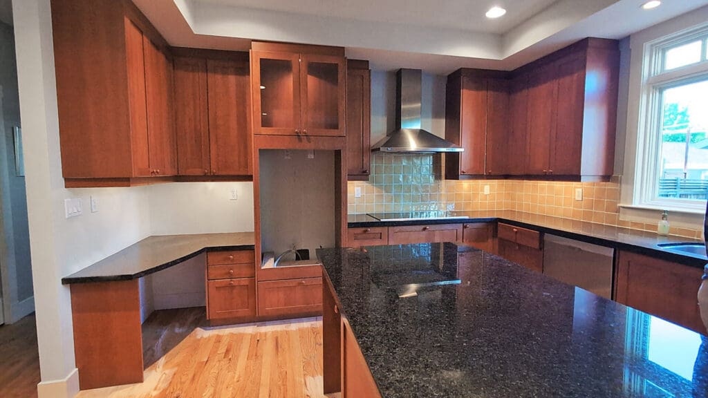 This project featured a full kitchen cabinet painting in professional spray coatings. This client of ours wanted to transform their kitchen away from the dark reddish brown cabinet colour in favour of a sleek and stylish two-tone colour scheme with modern, durable professional spray coatings. The perimeter cabinets were painted a brighter but neutral gray-beige fan favourite called Revere Pewter, while the island cabinets now sport a striking dark accent colour called Black Panther. The end result was a kitchen that instantly became the home’s centrepiece – complementary bright and dark colours, neutral but full of depth and undertones.