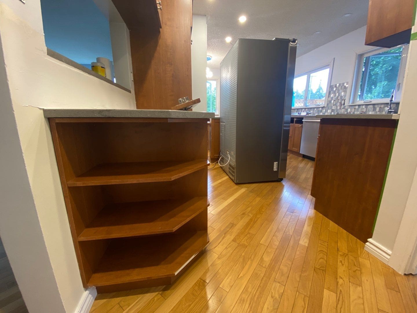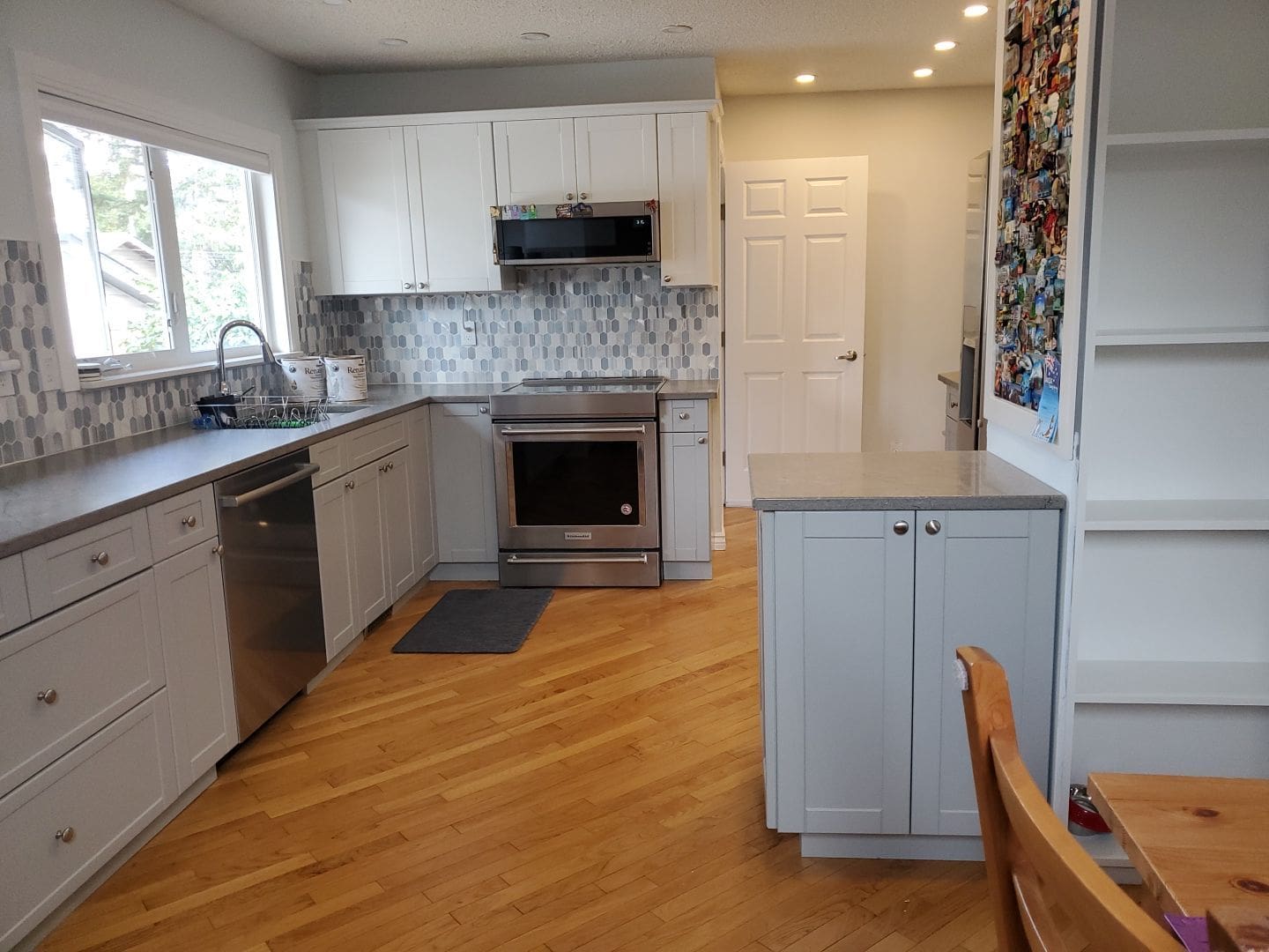 This project featured a full kitchen cabinet painting with sprayed lacquer on the doors and sprayed latex waterborne on the kitchen boxes. This cozy home located in the established neighbourhood of Willow Park featured a brown stained wood kitchen before we painted it a stylish and modernized two tone Oxford White and Coventry Grey. Just by having the brown cabinetry painted a modern two tone, this kitchen felt brighter, newer, and more spacious.