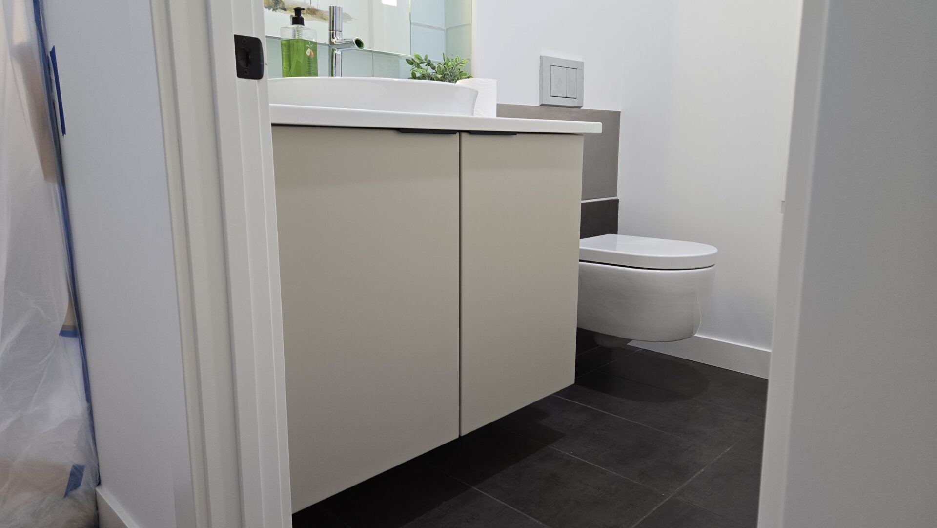 Cabinets: Drop Cloth by Farrow & Ball (a warm mid-gray beige)