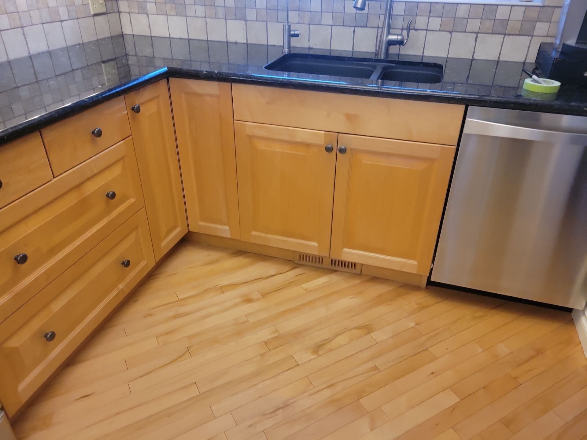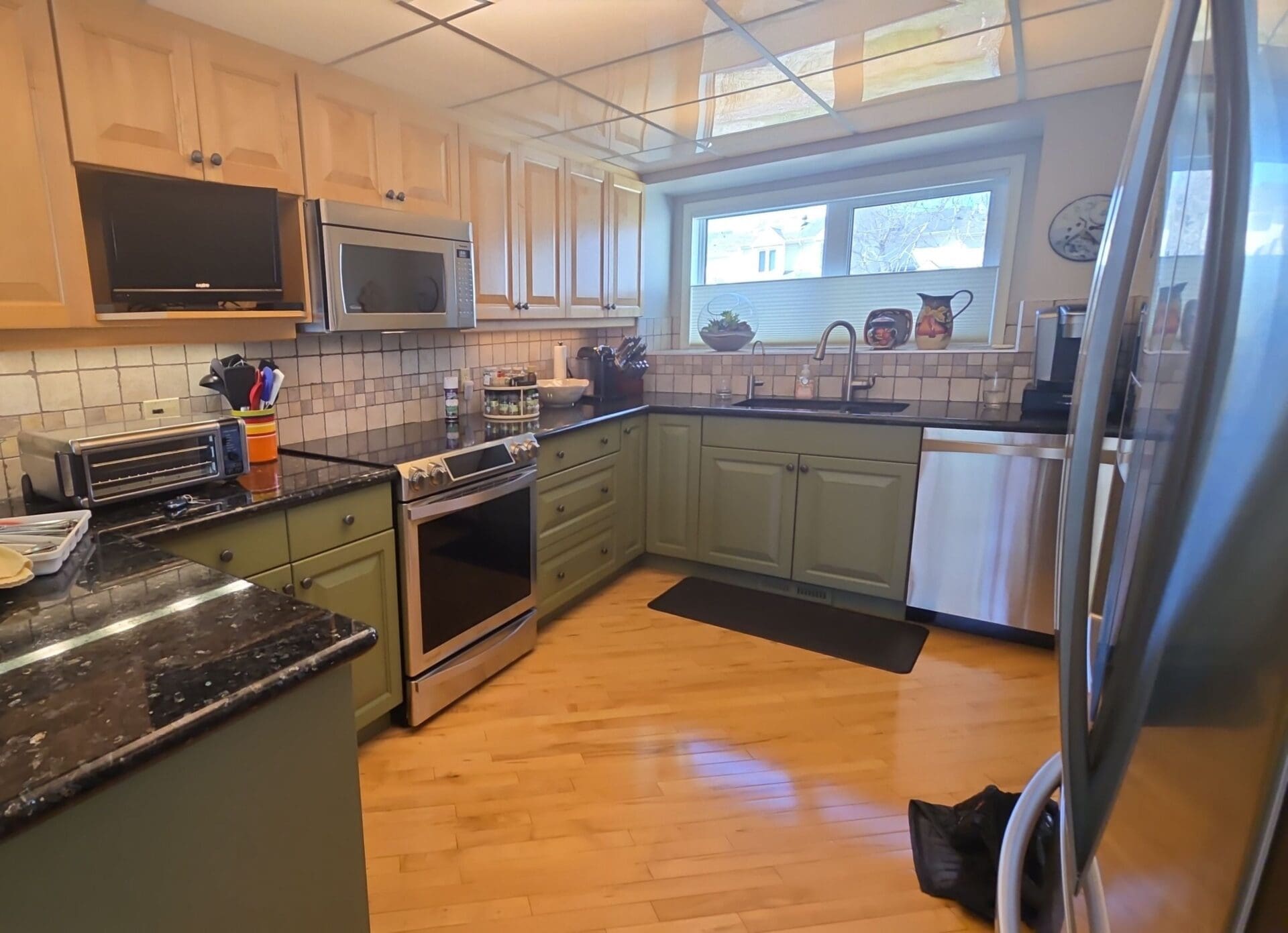 Light Yellow Maple Kitchen Cabinets Updated with Stylish Dark Green Lowers