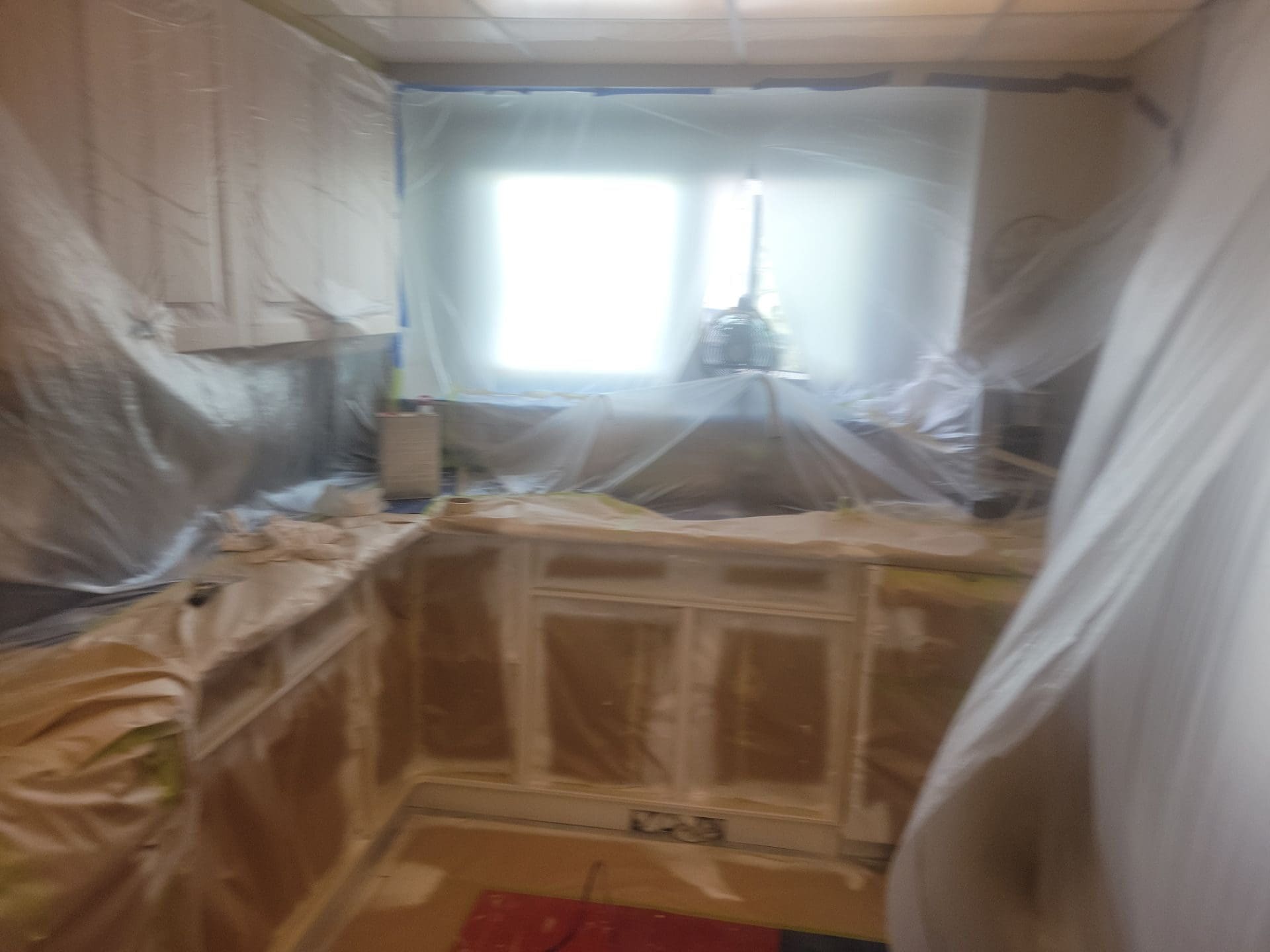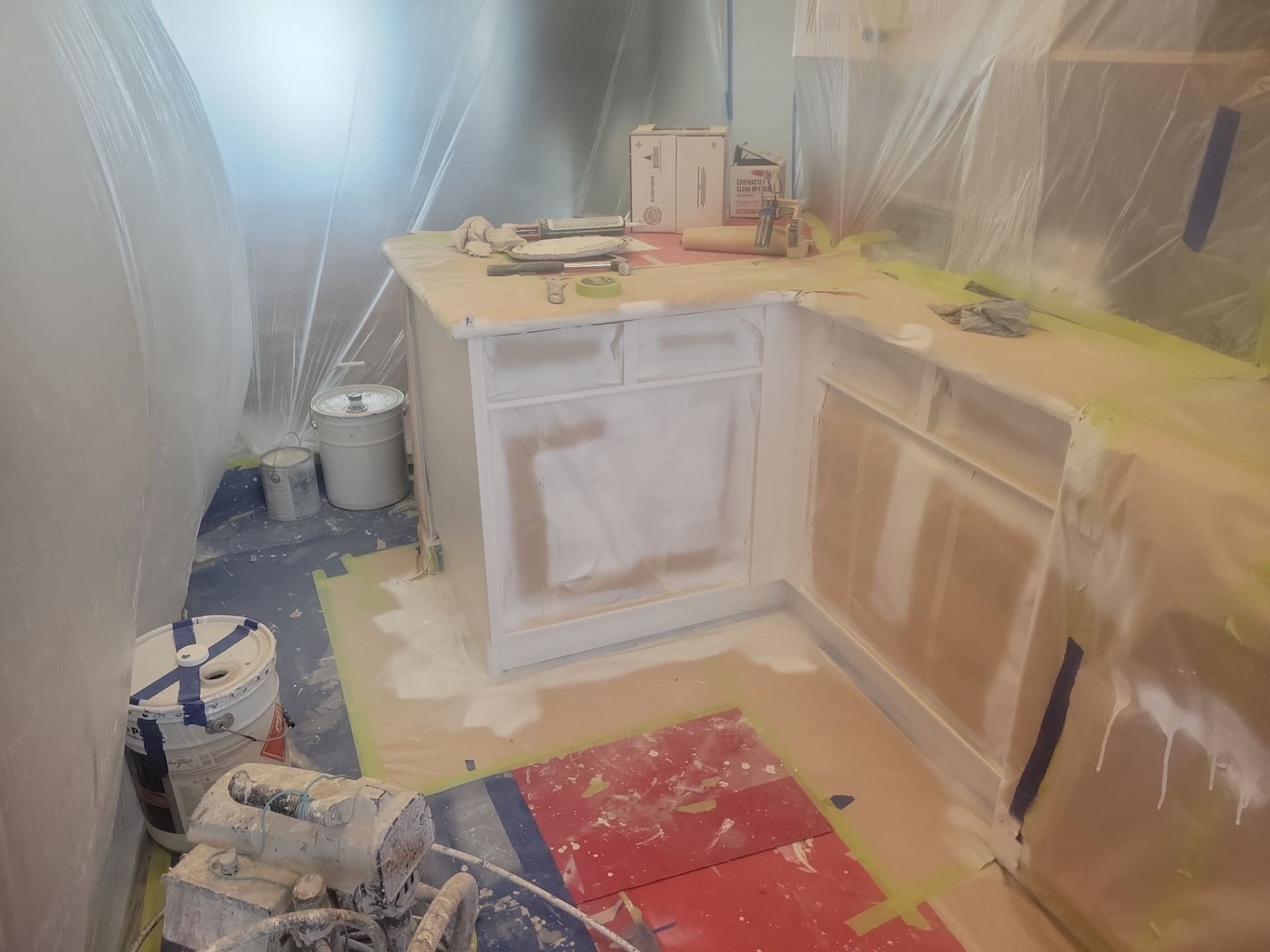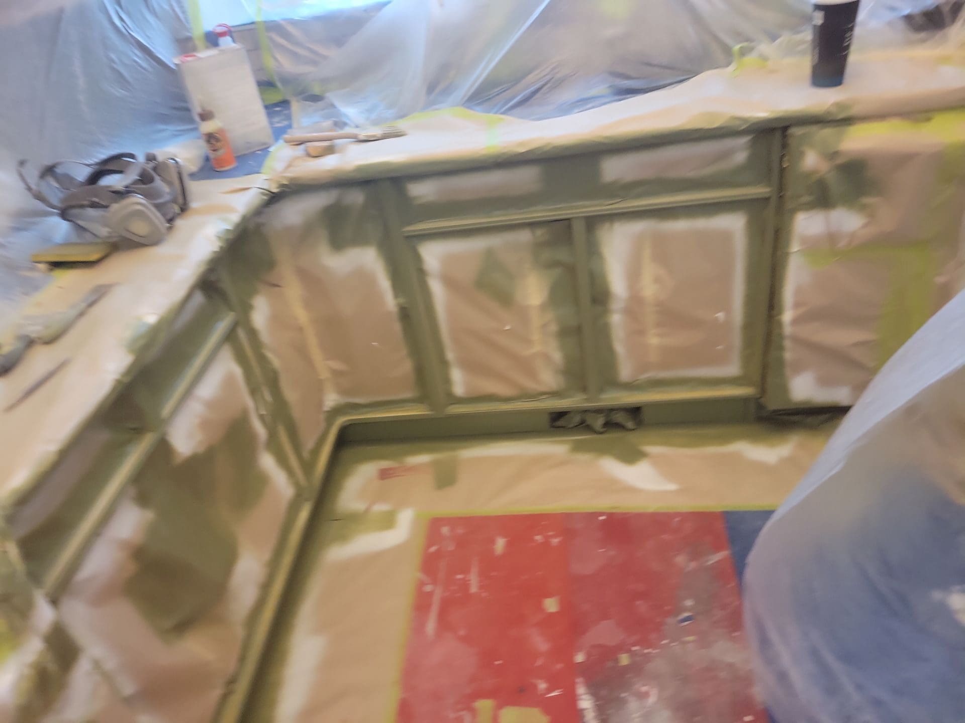 This project featured a partial kitchen cabinet painting, using professionally sprayed coatings to change the style of this client’s lower kitchen cabinets only. We created a contemporary two-tone between their original light wood stain uppers and a new chic earthy, mid-tone green on the lowers. Our team painted the lower cabinets only, a colour called Eucalyptus – adding the slightest touch of modern style and creativity to this kitchen space. No space is too big or too small for an update using professional spray coatings!