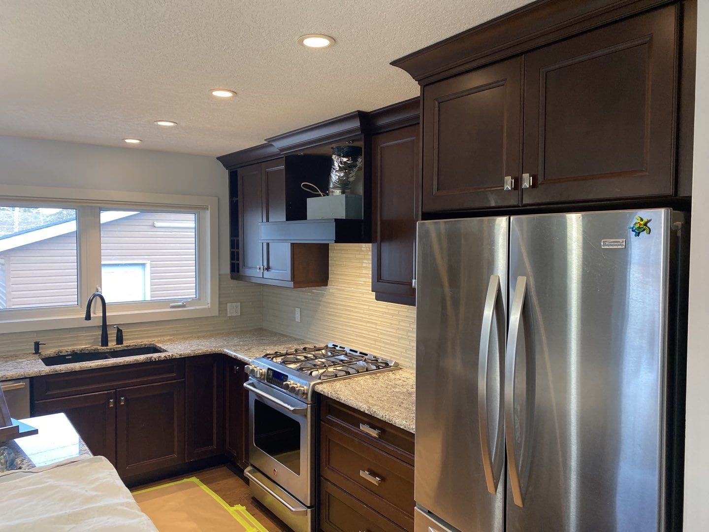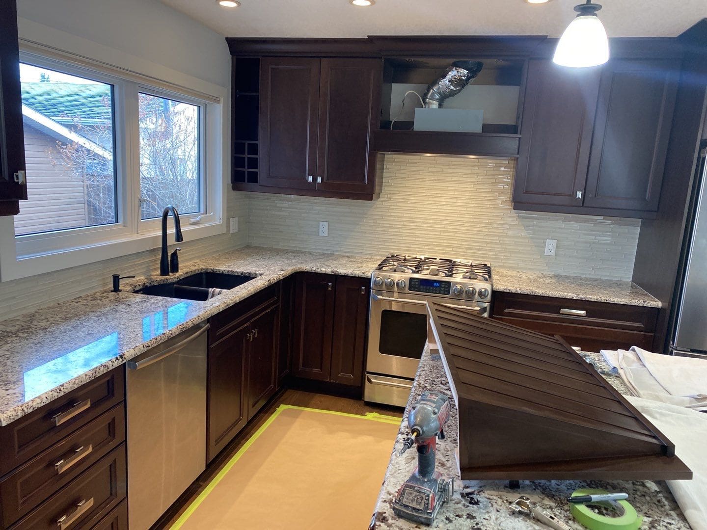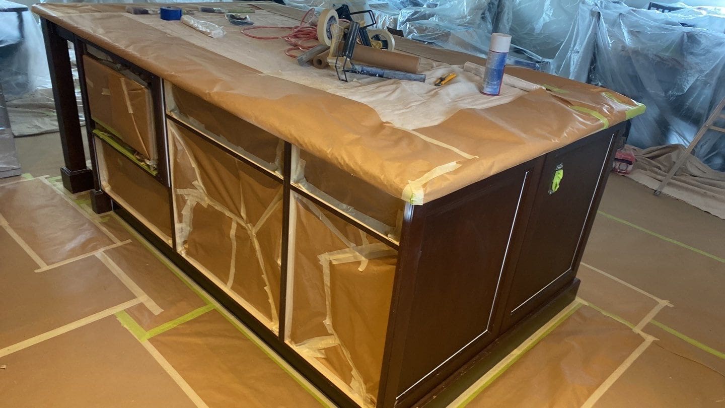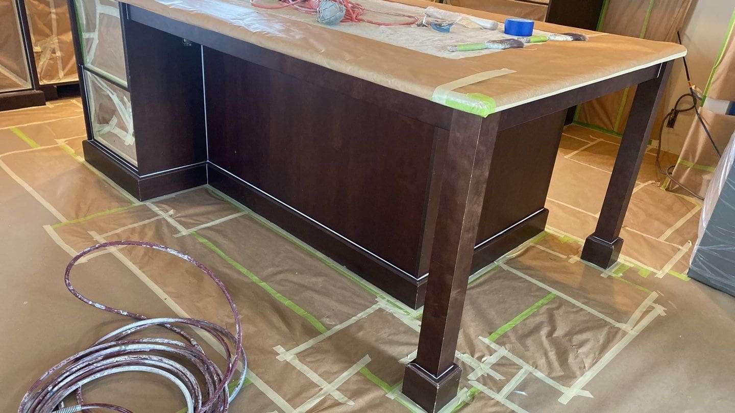 This project featured a full kitchen painting in sprayed lacquer. This cozy and modern dark brown kitchen received a bright refresh when we sprayed the doors and cabinetry a unique off-white shade of paint called Antique Ivory. At different times of day and under different lighting, antique ivory will display a variety of natural undertones that go from cool greys to warmer, creamy whites. This colour truly is a versatile and elegant addition to any cabinetry colour scheme.