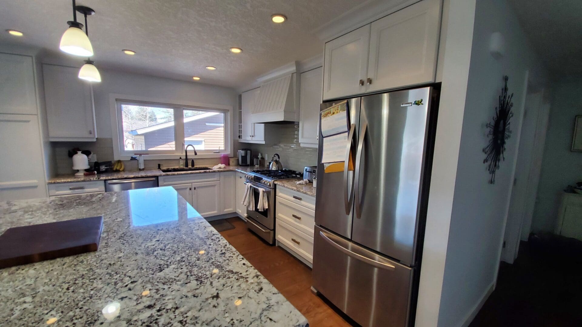 Do you have a relatively modern kitchen but with an outdated colour scheme? Consider having your kitchen cabinets redone in a sprayed lacquer paint job! This modern kitchen was instantly refreshed and updated with a bright off-white that transformed the space and added tons of light into the main floor. Dark cabinets absorb so much light, making kitchens feel small and cramped. Having a brighter, more reflective colour tone will drastically change the lighting and vibrance without having to do any major renovations!