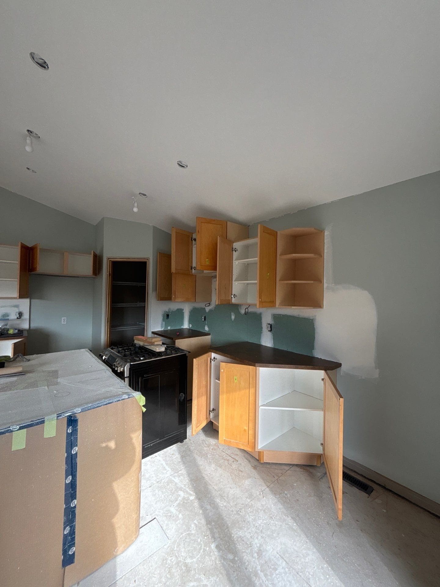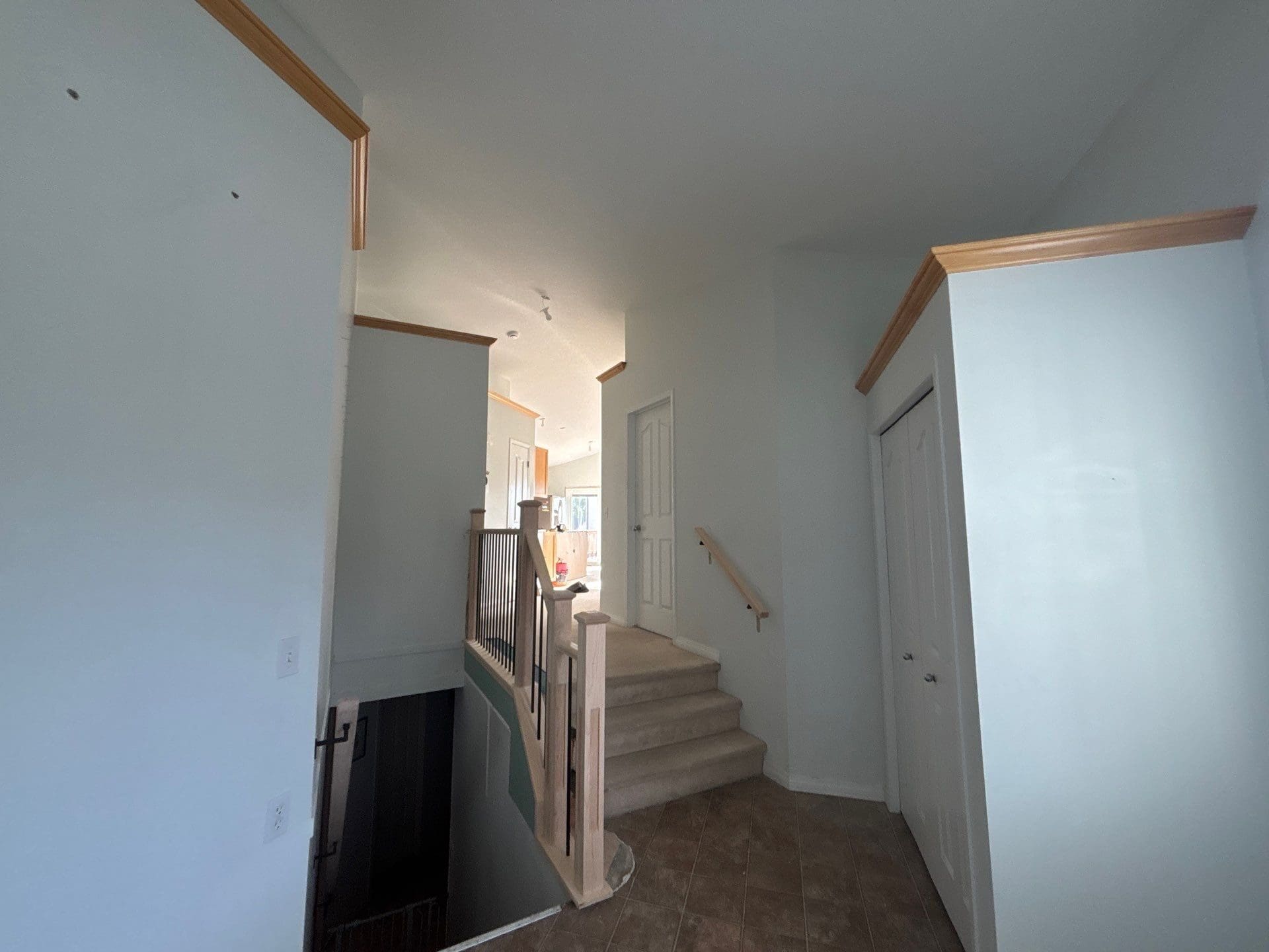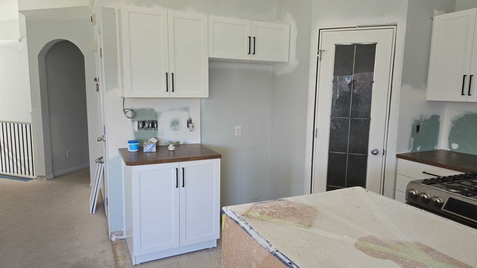 Dated Orange Maple Kitchen, Trim and New MDF Banister Painted Bright, Contemporary White