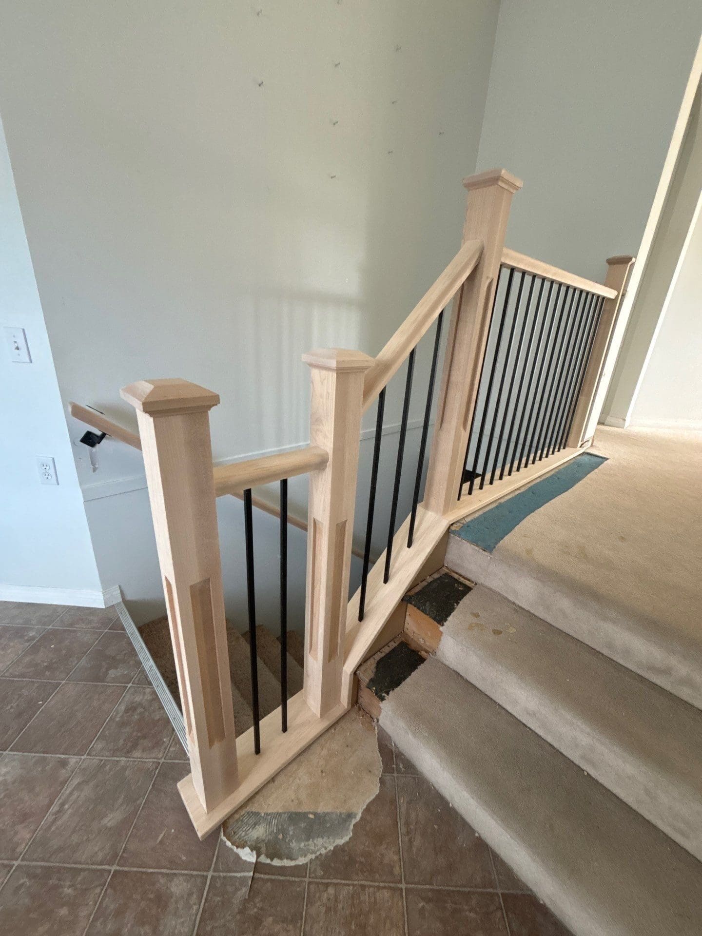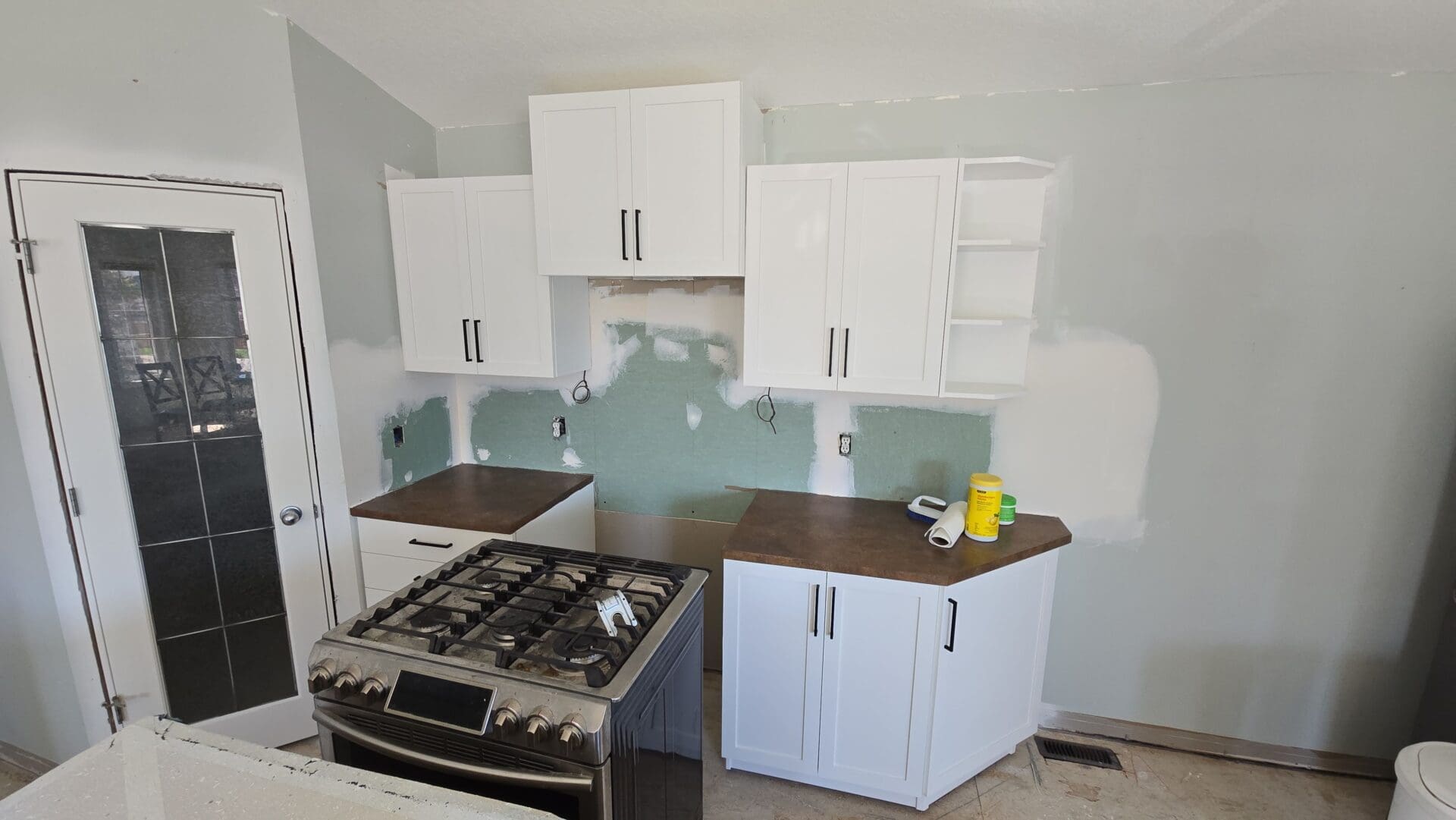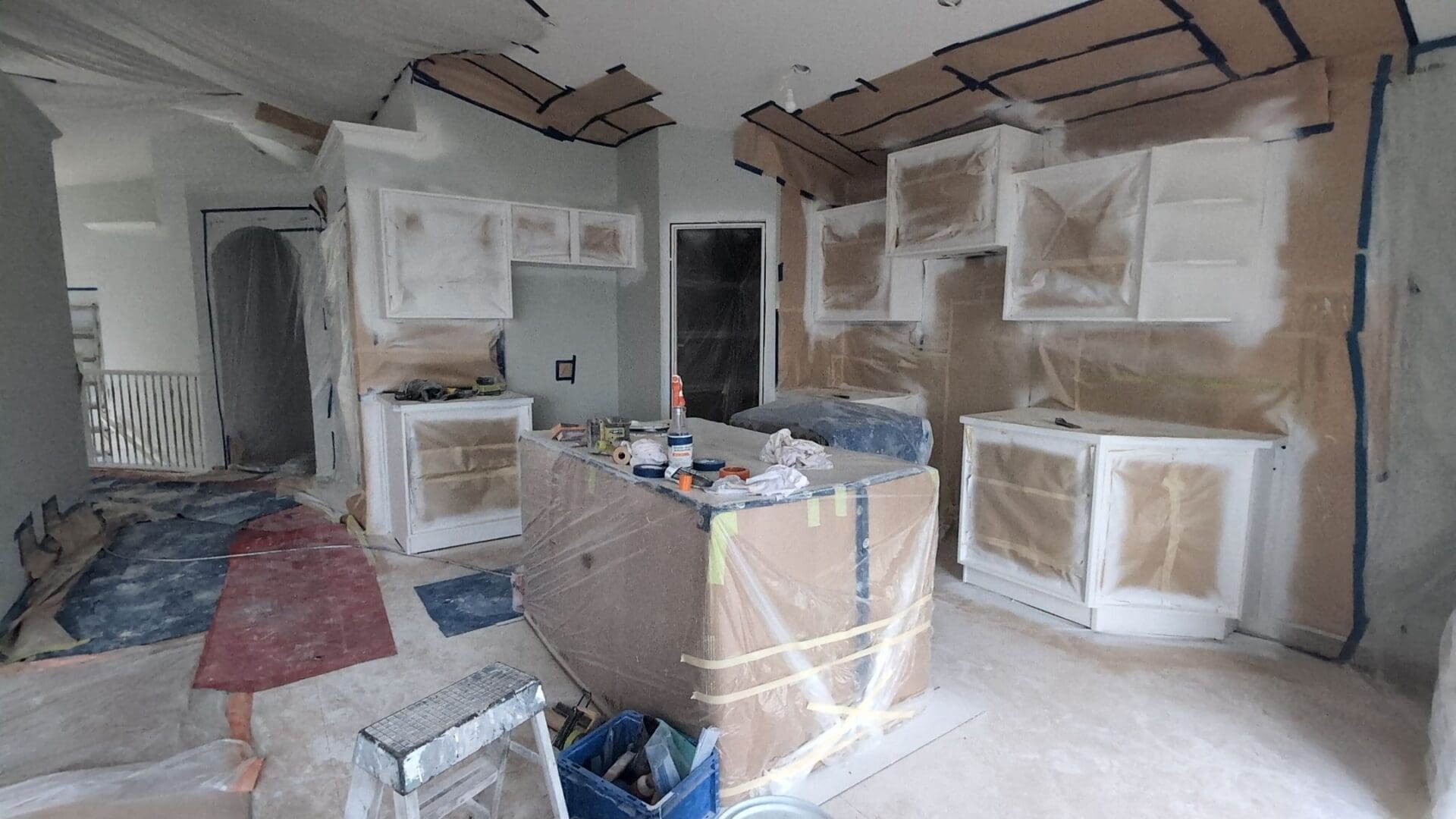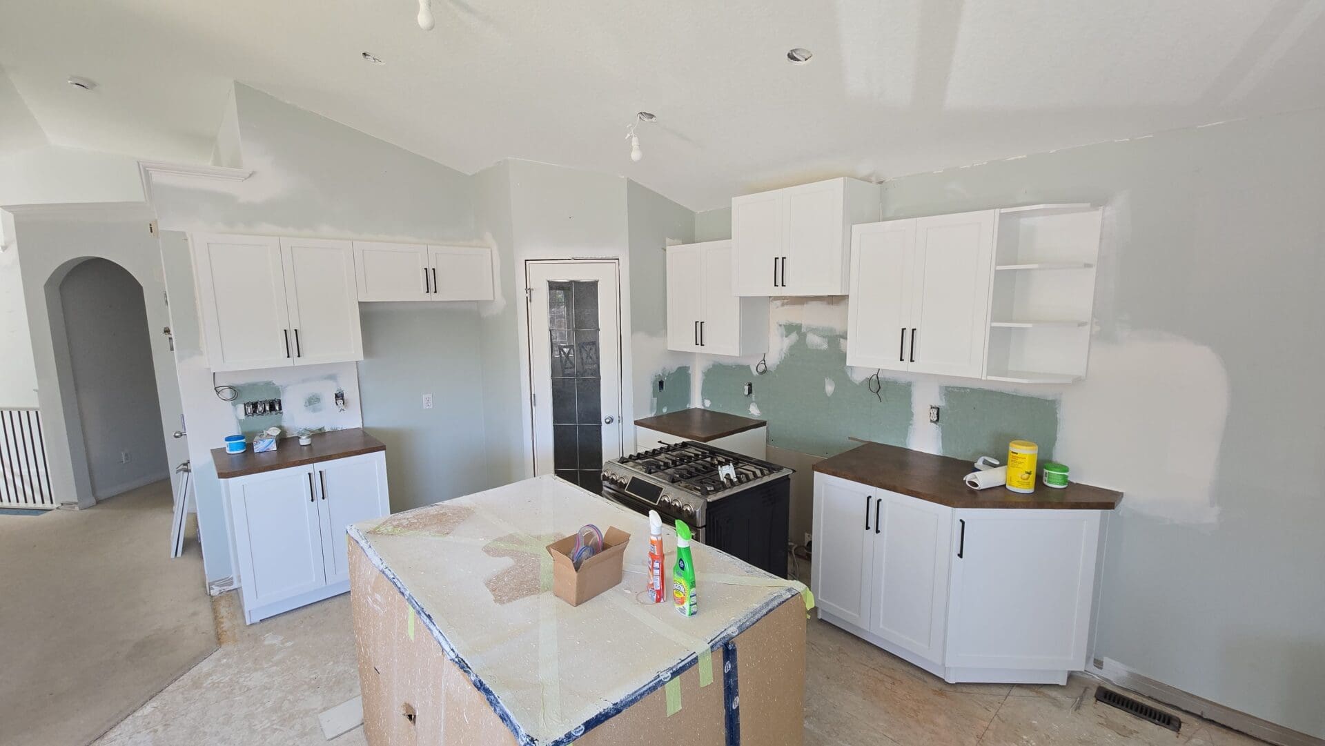 Dated Orange Maple Kitchen, Trim and New MDF Banister Painted Bright, Contemporary White