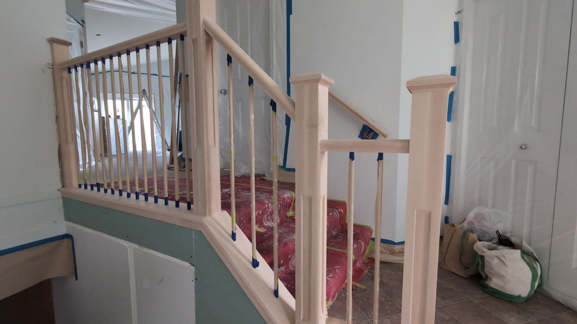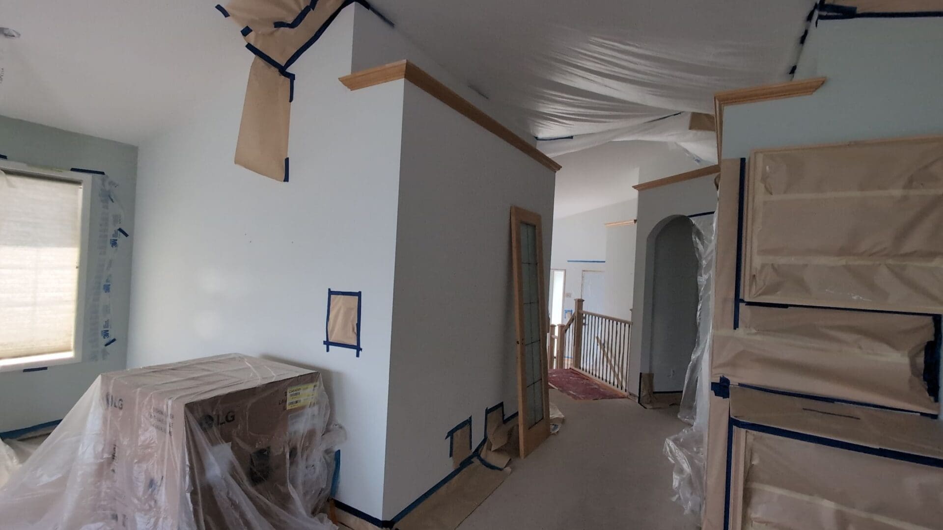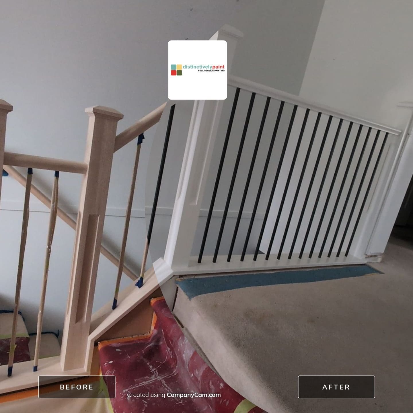 This project featured a full kitchen cabinet painting, banister rail and fireplace mantel in professional spray coatings. This client had a brand new banister rail built, and also wanted their kitchen space and fireplace mantel to feel brighter, more spacious and more consistent. Our team used pure white to transform this home’s entire main floor – the banister and handrails going up and down, the kitchen, all the crown moulding and the fireplace mantel. Professional spray coatings can not only modernize your interior space in a variety of vibrant colours but will add years of durability to the already existing wood!