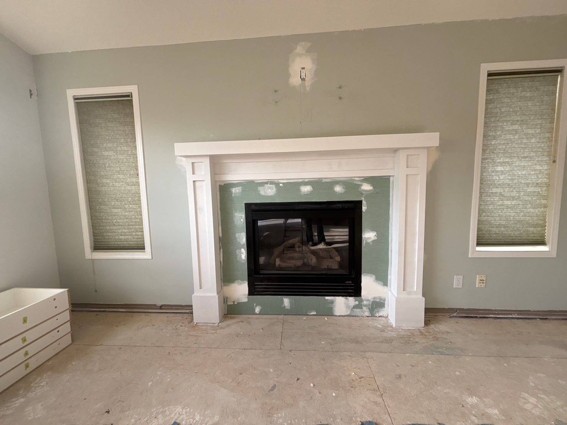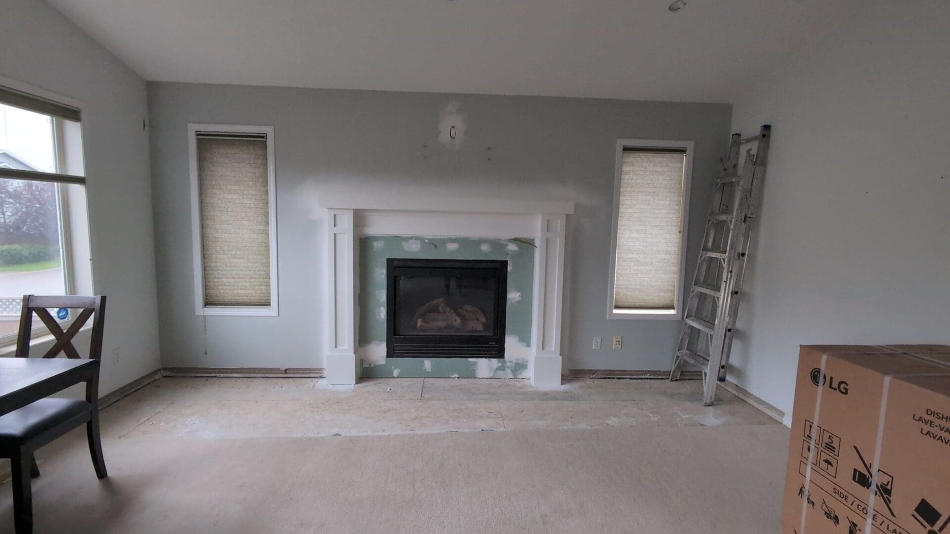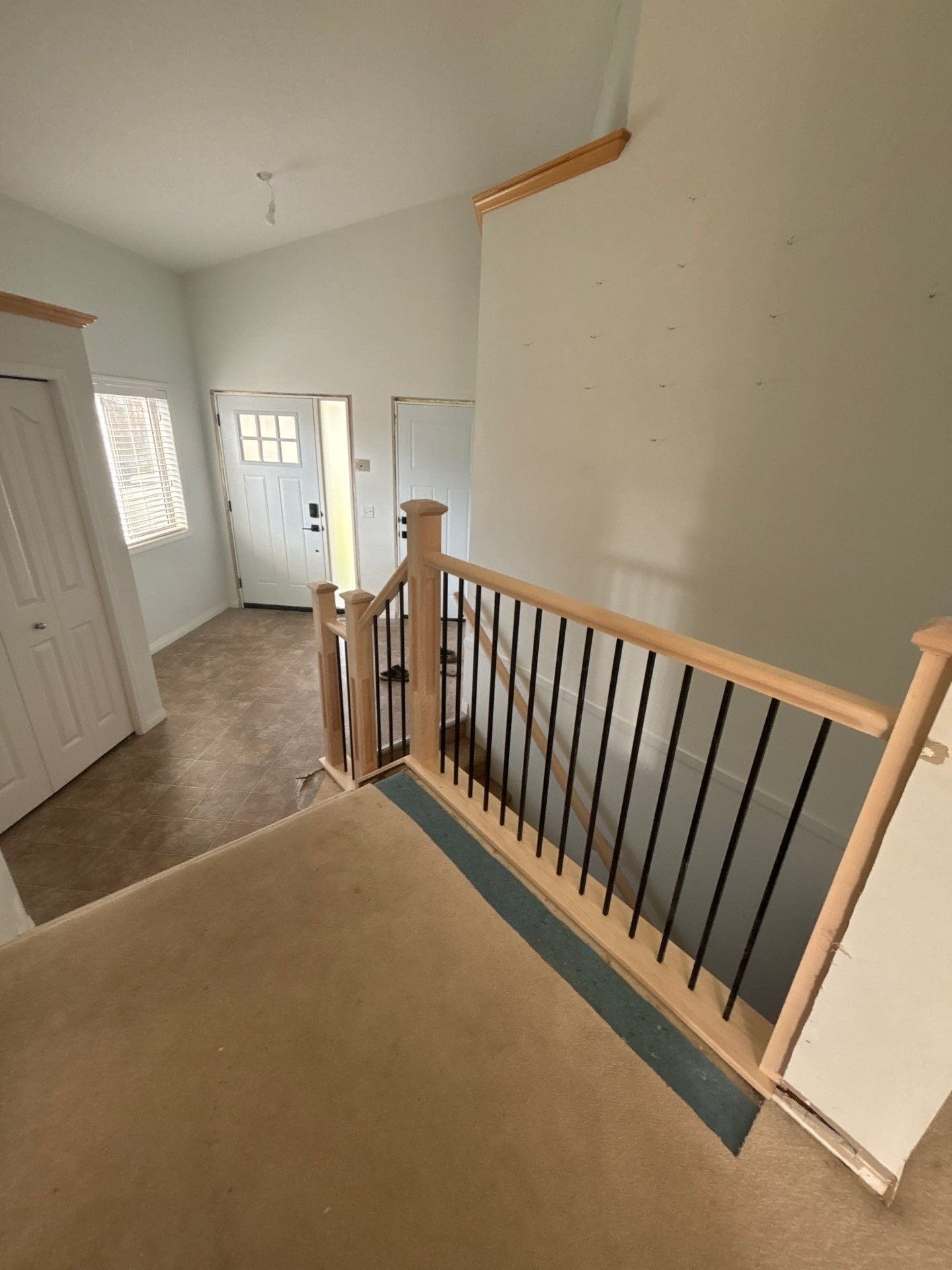 This project featured a full kitchen cabinet painting, banister rail and fireplace mantel in professional spray coatings. This client had a brand new banister rail built, and also wanted their kitchen space and fireplace mantel to feel brighter, more spacious and more consistent. Our team used pure white to transform this home’s entire main floor – the banister and handrails going up and down, the kitchen, all the crown moulding and the fireplace mantel. Professional spray coatings can not only modernize your interior space in a variety of vibrant colours but will add years of durability to the already existing wood!