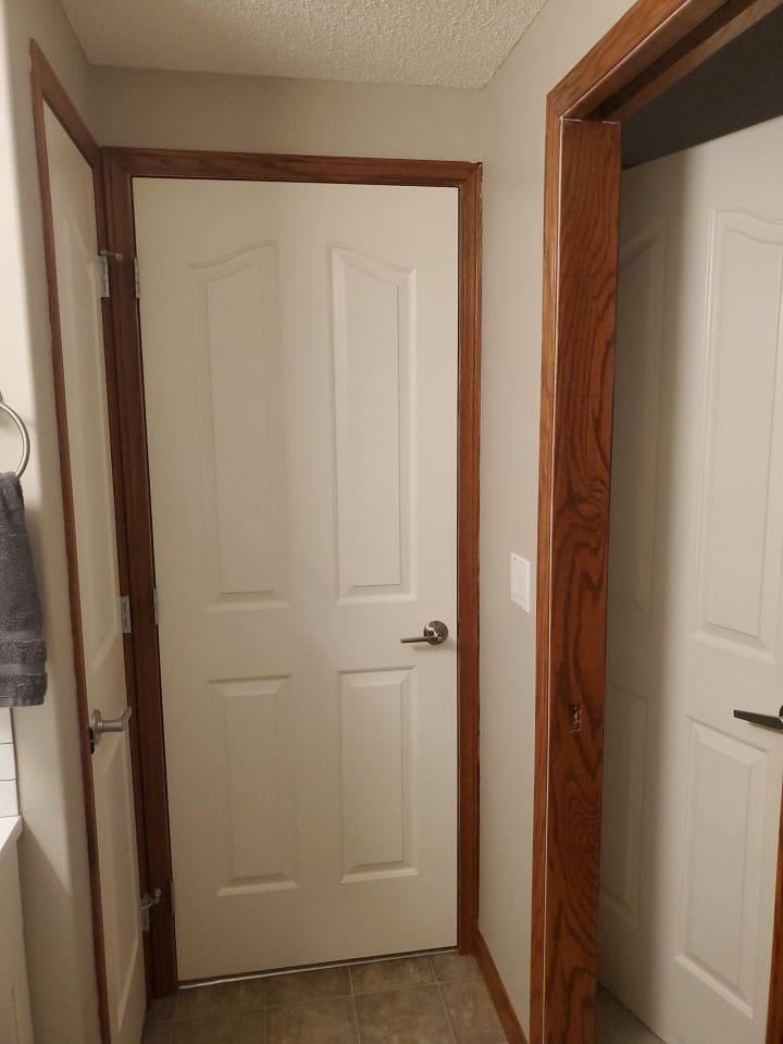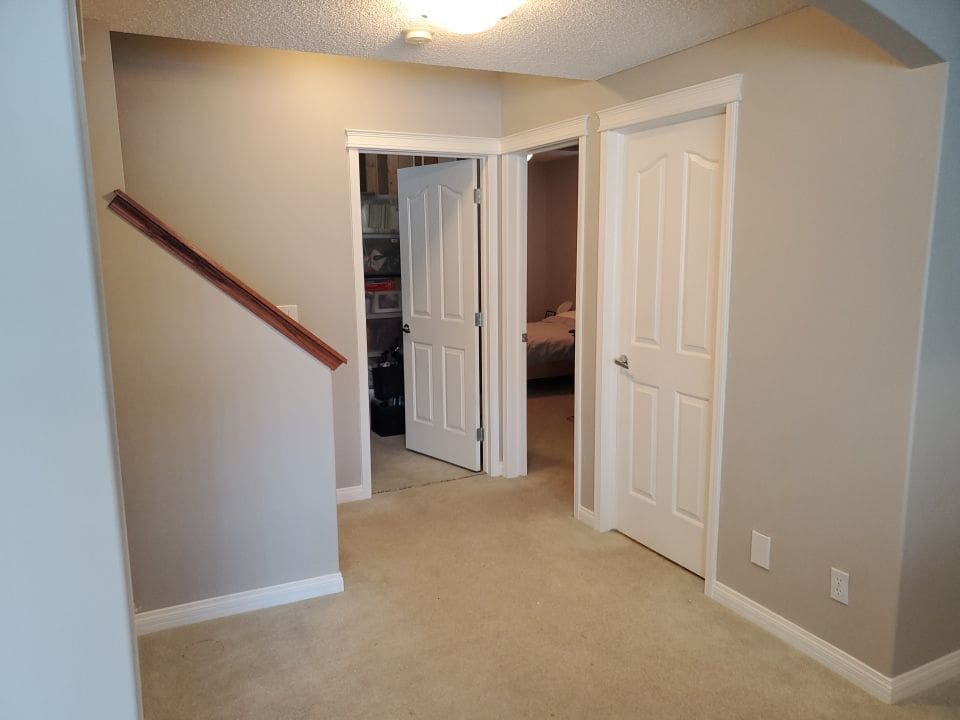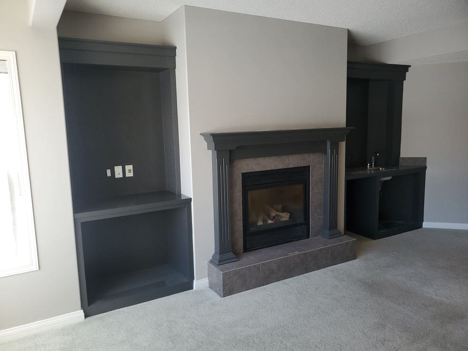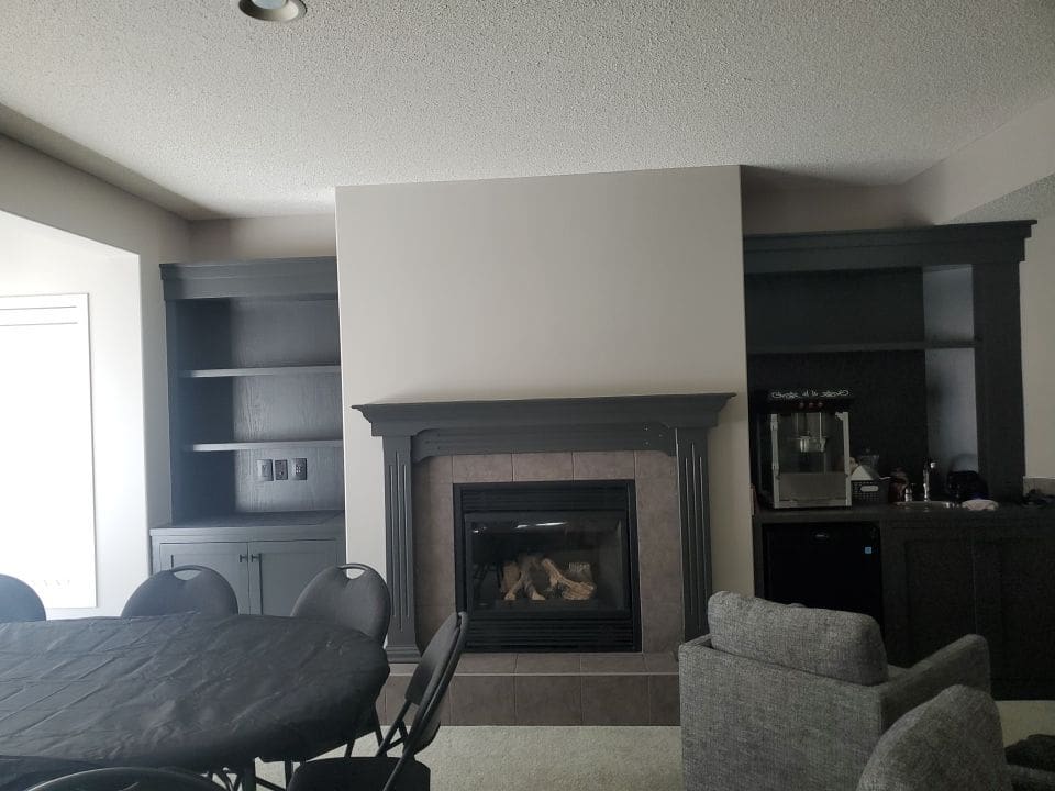 This project featured a full kitchen cabinetry painting as well as door frames and a built-in shelving and fireplace mantle unit in the basement. This bright and open Discovery Ridge home was in need of an update to the outdated orange stained wood. We painted the kitchen perimeter cabinets and the frames in the basement White Dove, the kitchen island and pantry door a custom colour called Black Fire, and the basement fireplace shelving unit Iron Ore. The two different dark shades combined with the White Dove instantly modernized the aesthetic throughout the home.