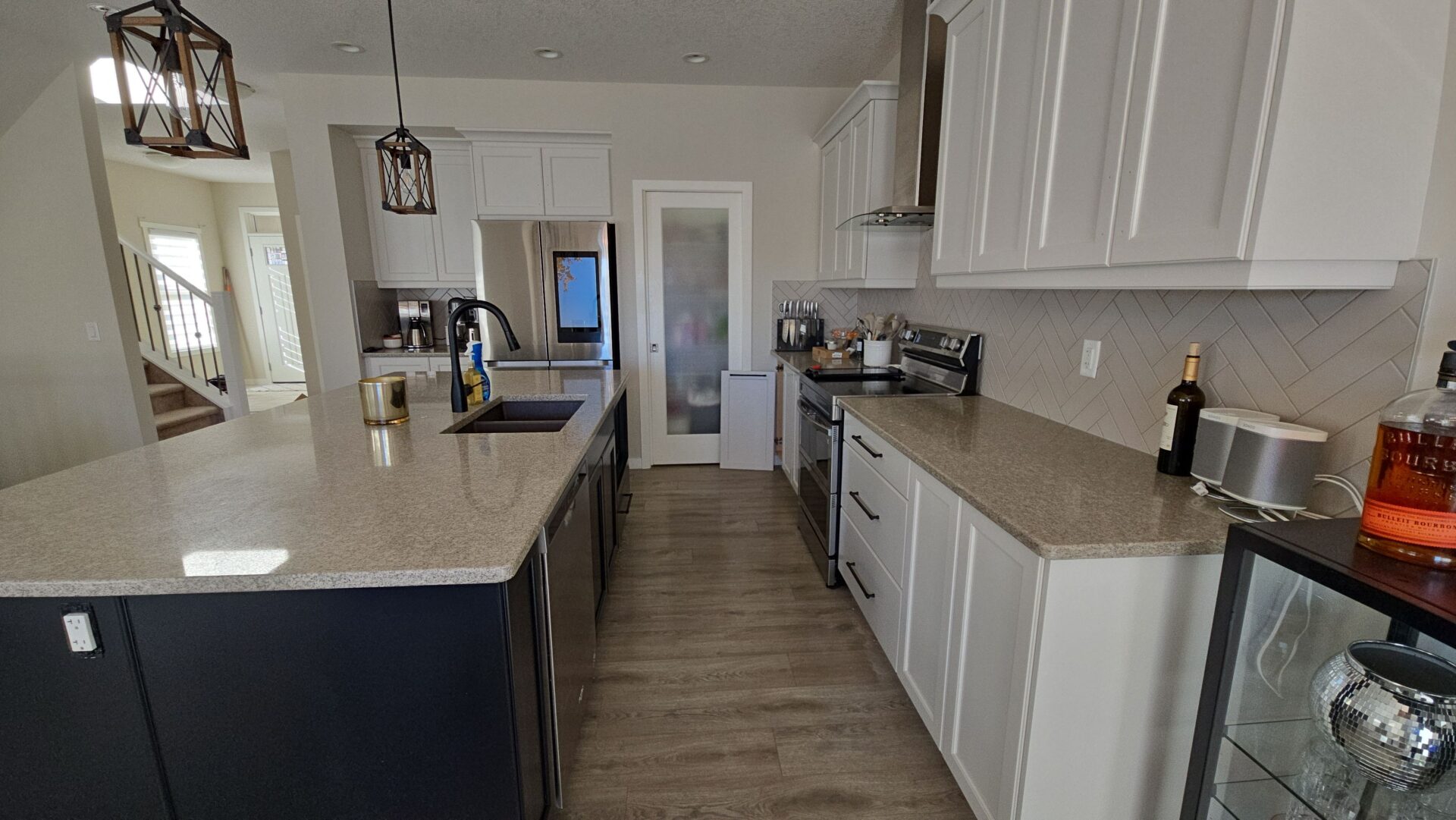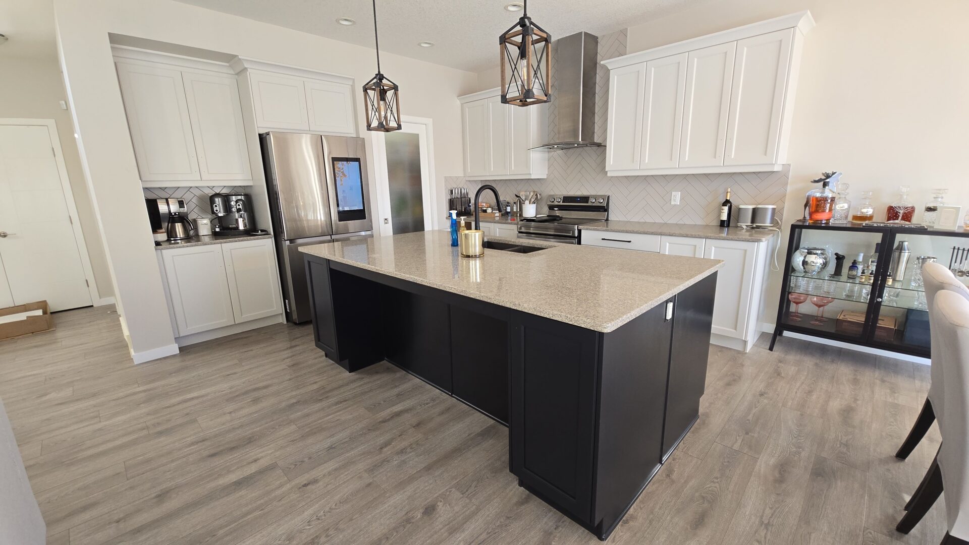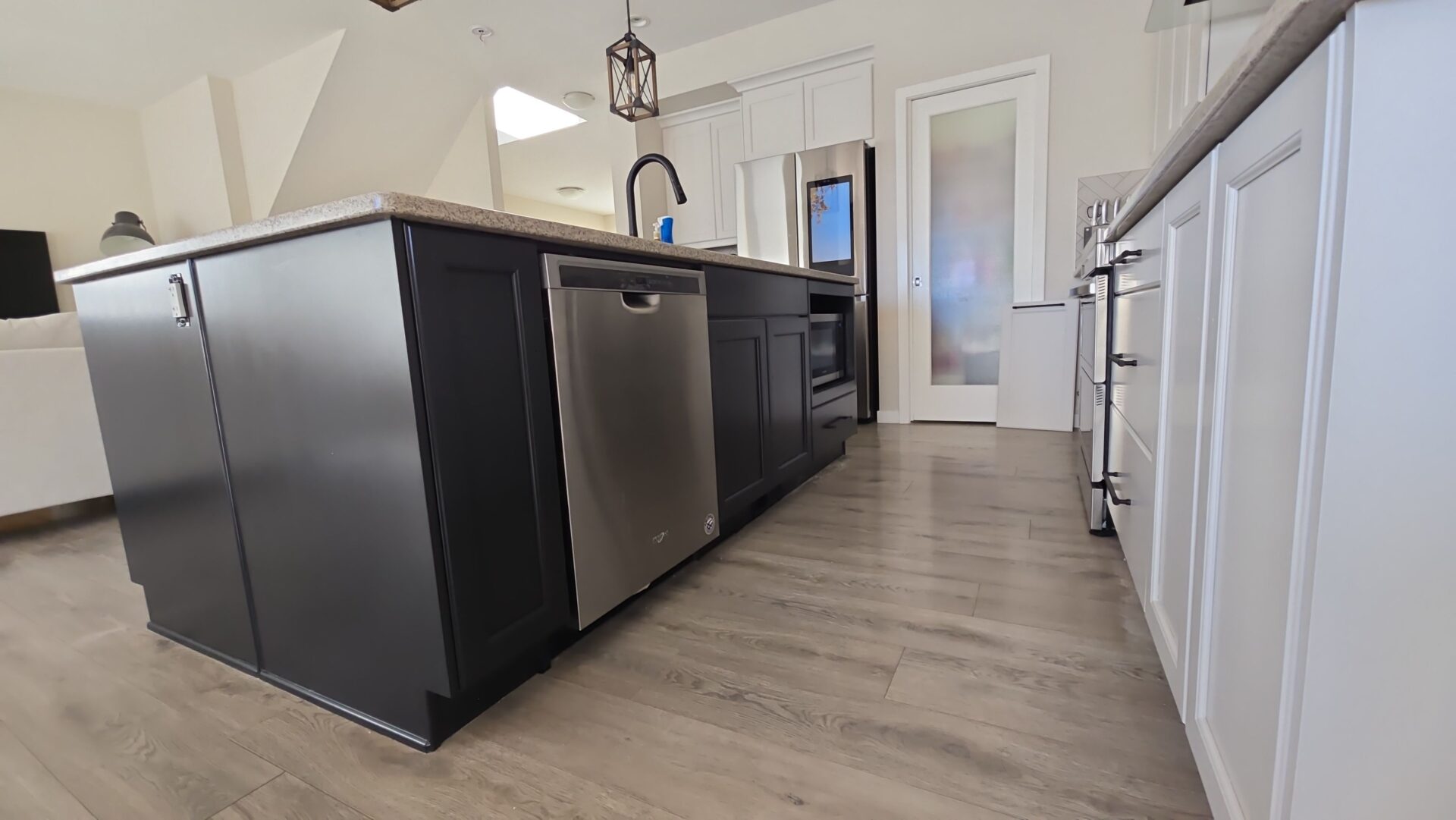The finished space feels brighter, more open, and distinctly modern. The lighter cabinetry instantly refreshed the kitchen, bathroom, and laundry room, while the dark island added depth and visual interest. The updated banister rail tied in seamlessly with the home’s trim, resulting in a polished, cohesive look throughout.