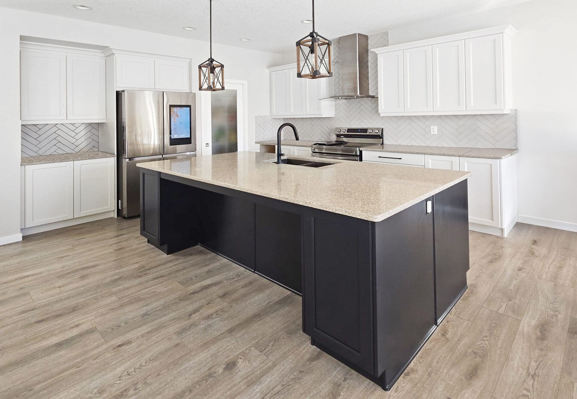 The contrast between the soft off-white cabinetry and the dark island created a strong focal point while keeping the overall palette clean and timeless.