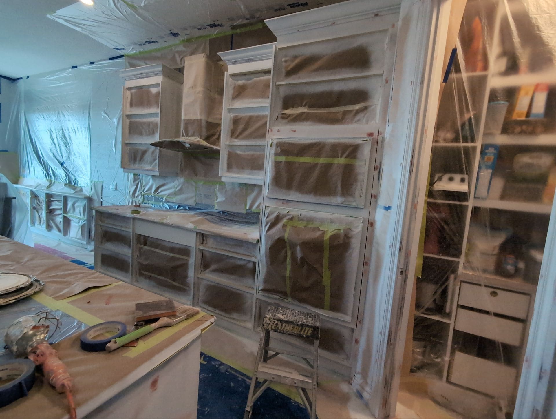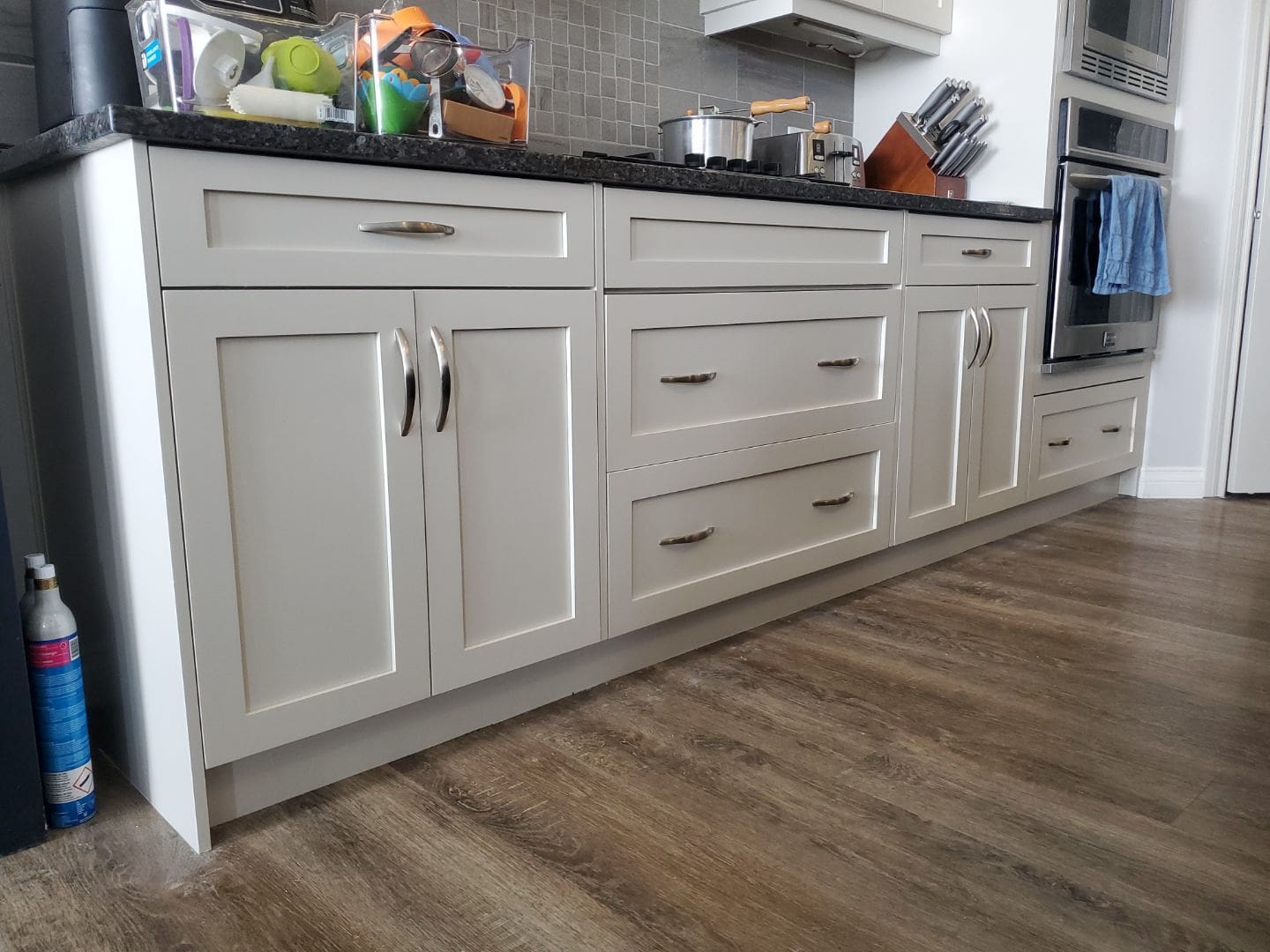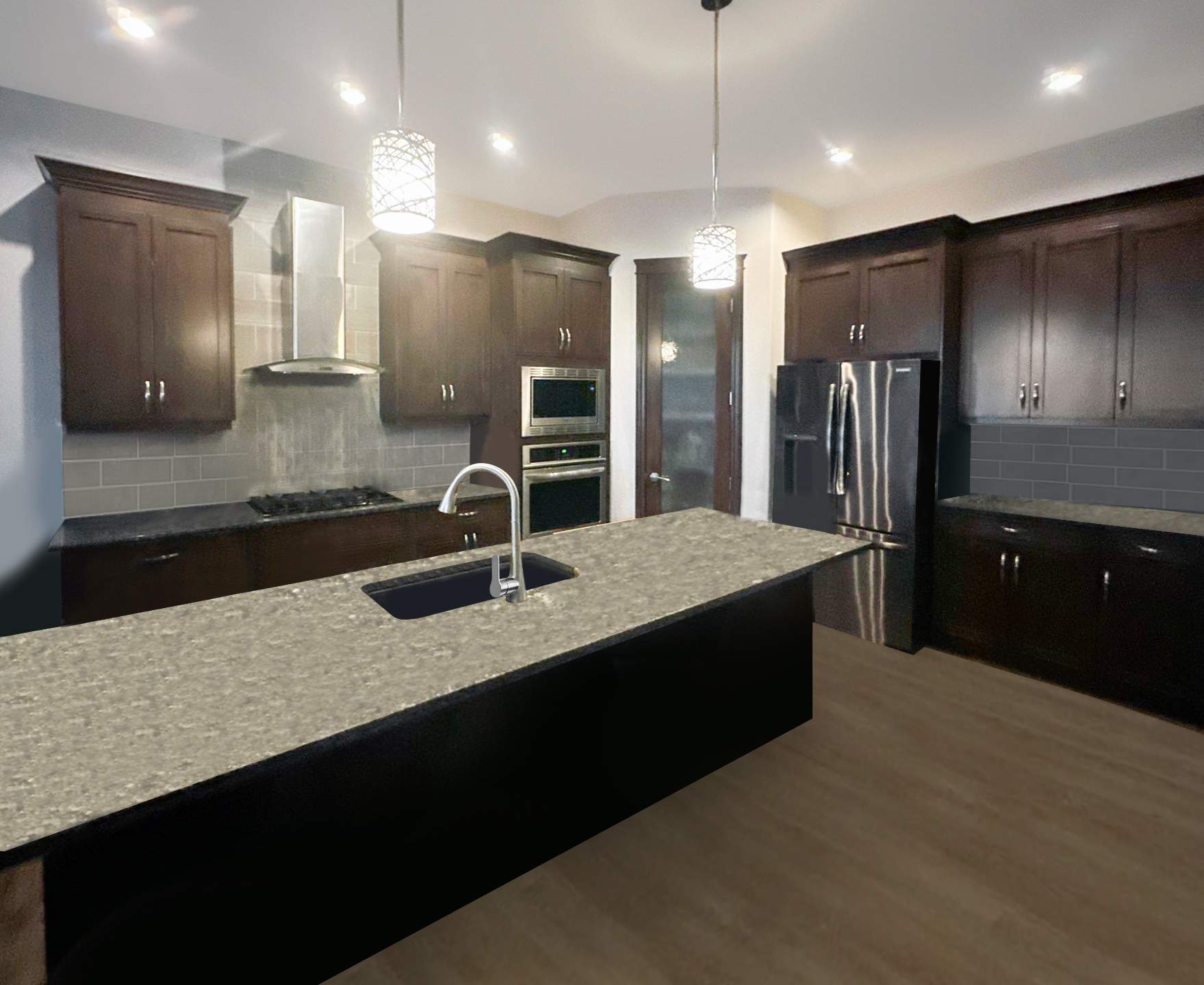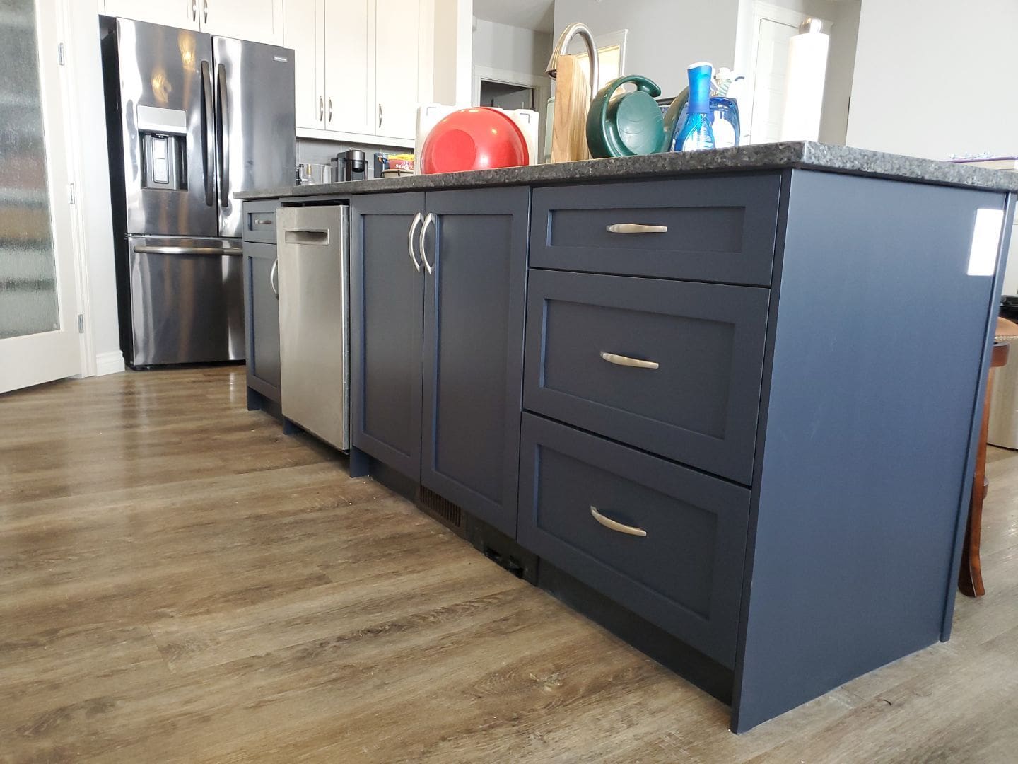 This project featured a full kitchen cabinet painting in sprayed lacquer, as well as two bathroom vanities, the banister and handrails throughout, the pantry door and frame and the dining room area cabinets. This was a fairly large project where our client wanted to remove the vast majority of the dark wood stain throughout their home. We painted the kitchen surround cabinets, the master bath and main floor powder vanities, dining room cabinets and all the handrails a creamy off-white match to the client’s existing trim. The client chose to go for a stylish two-tone design for this project, so we painted the kitchen island cabinets a cool dark blue called Fushion Midnight Blue. By changing the home’s dominant colour from a dark brown stain to an off-white with a dark blue accent instantly modernized and brightened the space, and gave the cabinets a renewed look and feel.