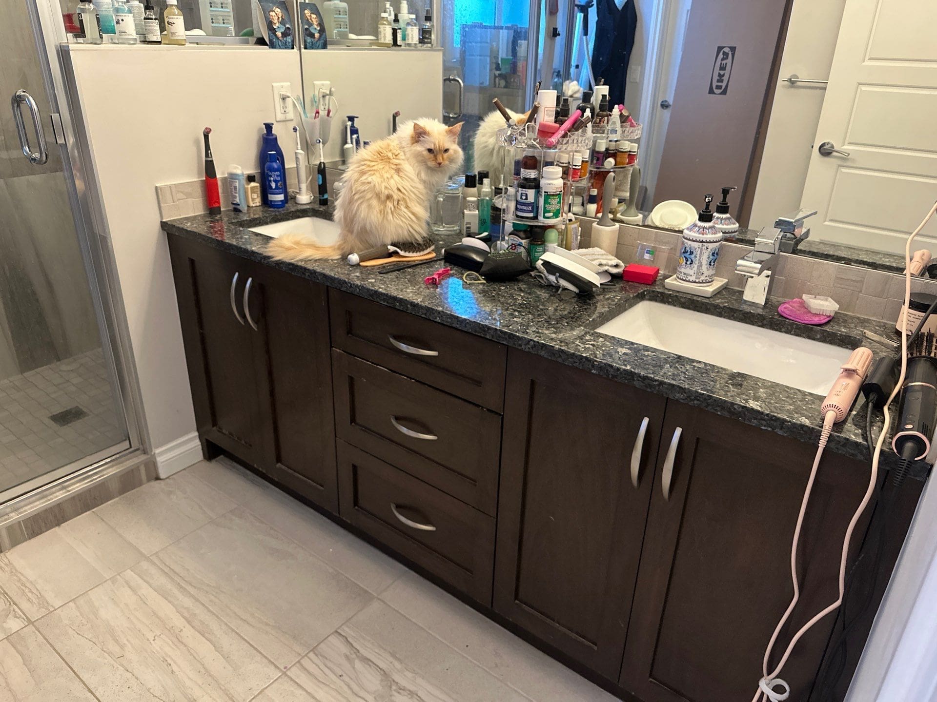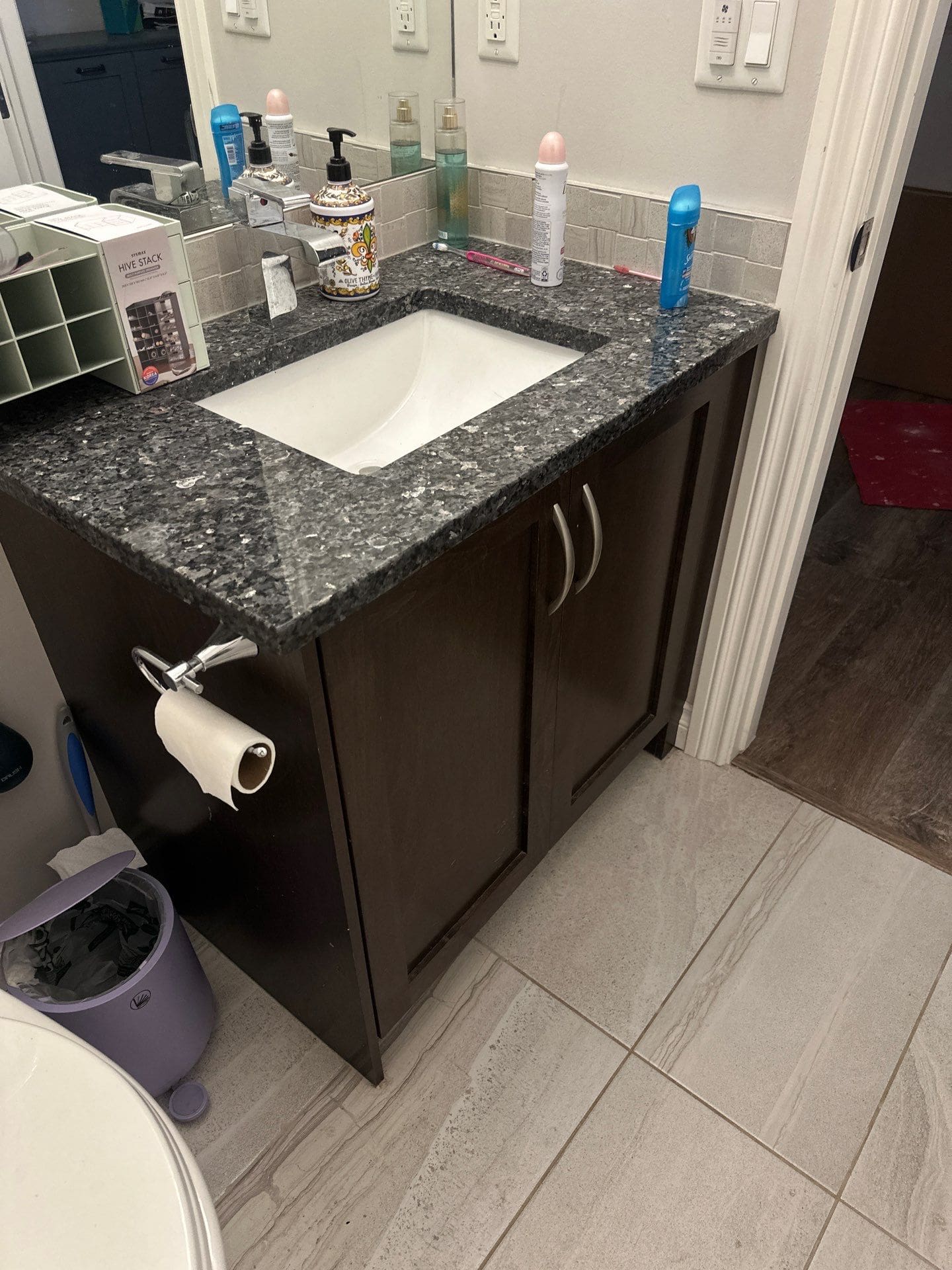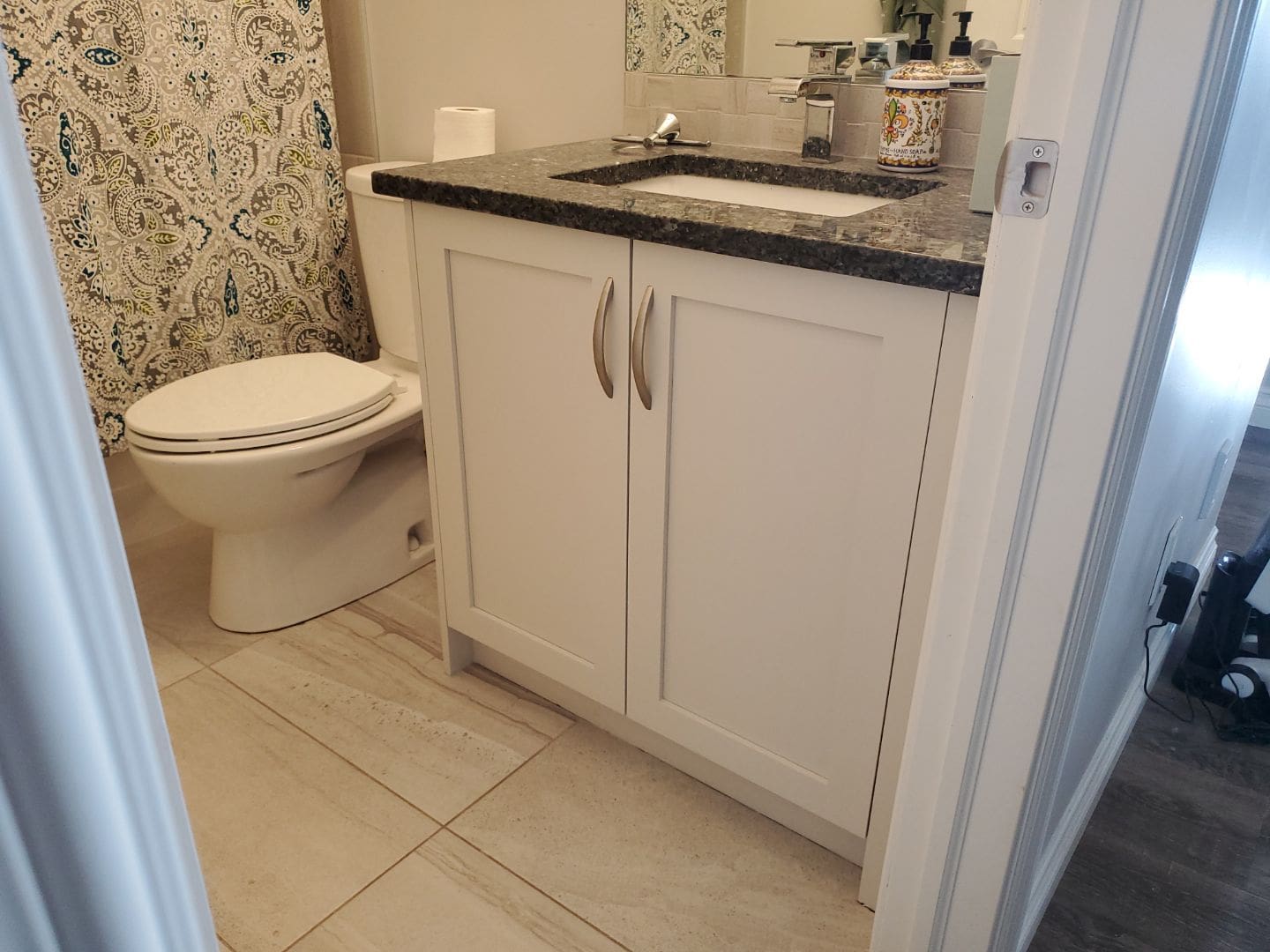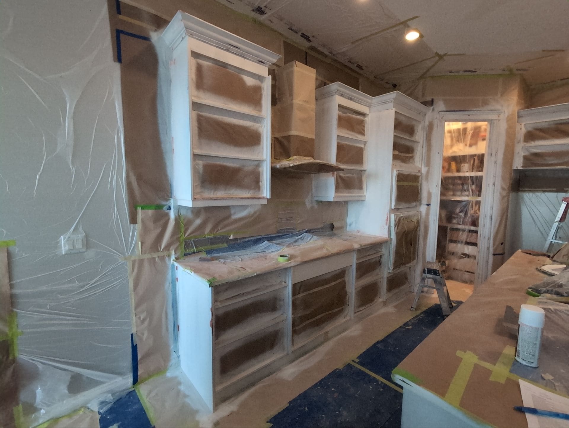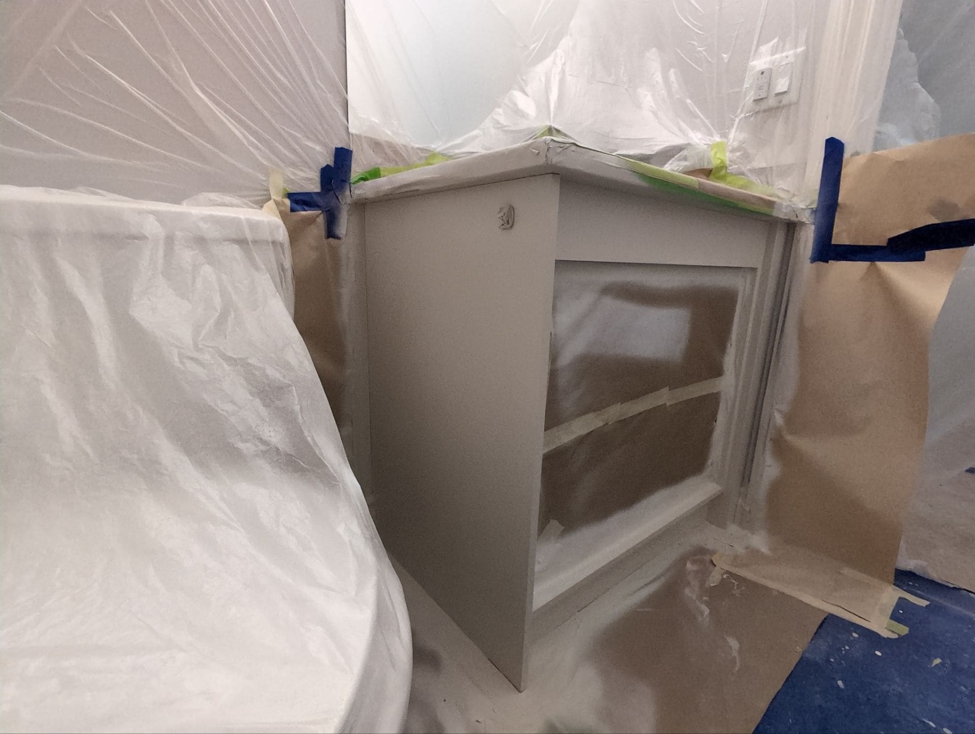 This project featured a full kitchen cabinet painting in sprayed lacquer, as well as two bathroom vanities, the banister and handrails throughout, the pantry door and frame and the dining room area cabinets. This was a fairly large project where our client wanted to remove the vast majority of the dark wood stain throughout their home. We painted the kitchen surround cabinets, the master bath and main floor powder vanities, dining room cabinets and all the handrails a creamy off-white match to the client’s existing trim. The client chose to go for a stylish two-tone design for this project, so we painted the kitchen island cabinets a cool dark blue called Fushion Midnight Blue. By changing the home’s dominant colour from a dark brown stain to an off-white with a dark blue accent instantly modernized and brightened the space, and gave the cabinets a renewed look and feel.