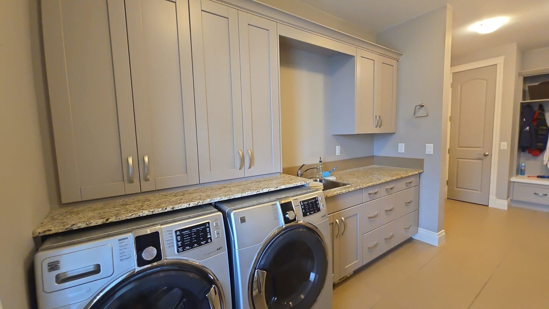 Yellow Maple Laundry Room Cabinets Updated to Modern Gray Trim Match