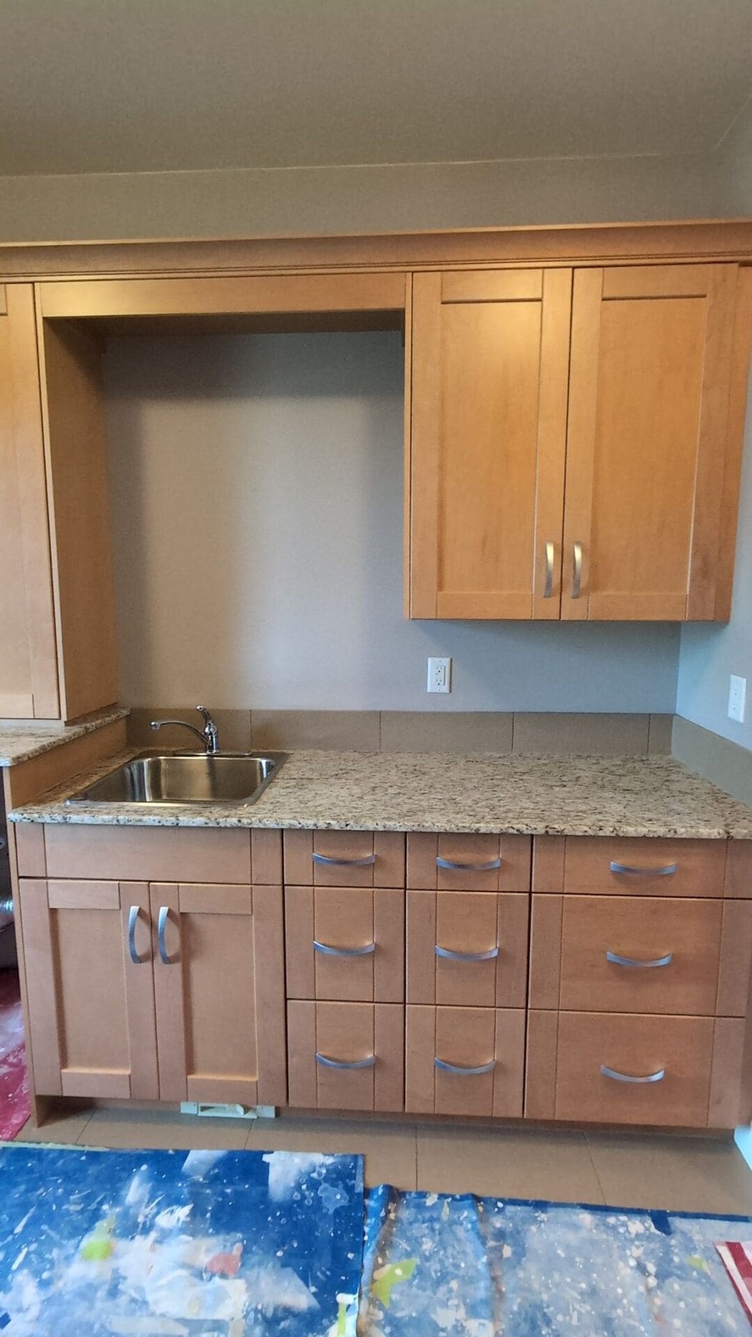 This project featured a large laundry room cabinet set refinished using professional spray coatings. This client wanted to update their laundry room so the cabinets no longer featured the dated light brown/orange maple style from the original build. These cabinets already featured fairly modern hardware, so all they needed was a colour refresh. Our team painted this laundry room in a fan-favourite colour at this company, the popular warm gray-beige called Revere Pewter. The end result was a total transformation of the laundry room space – a modern, stylish warm gray-beige that will turn even your home’s smaller spaces into modern show-stoppers. No project is too big or too small for professional spray coatings!