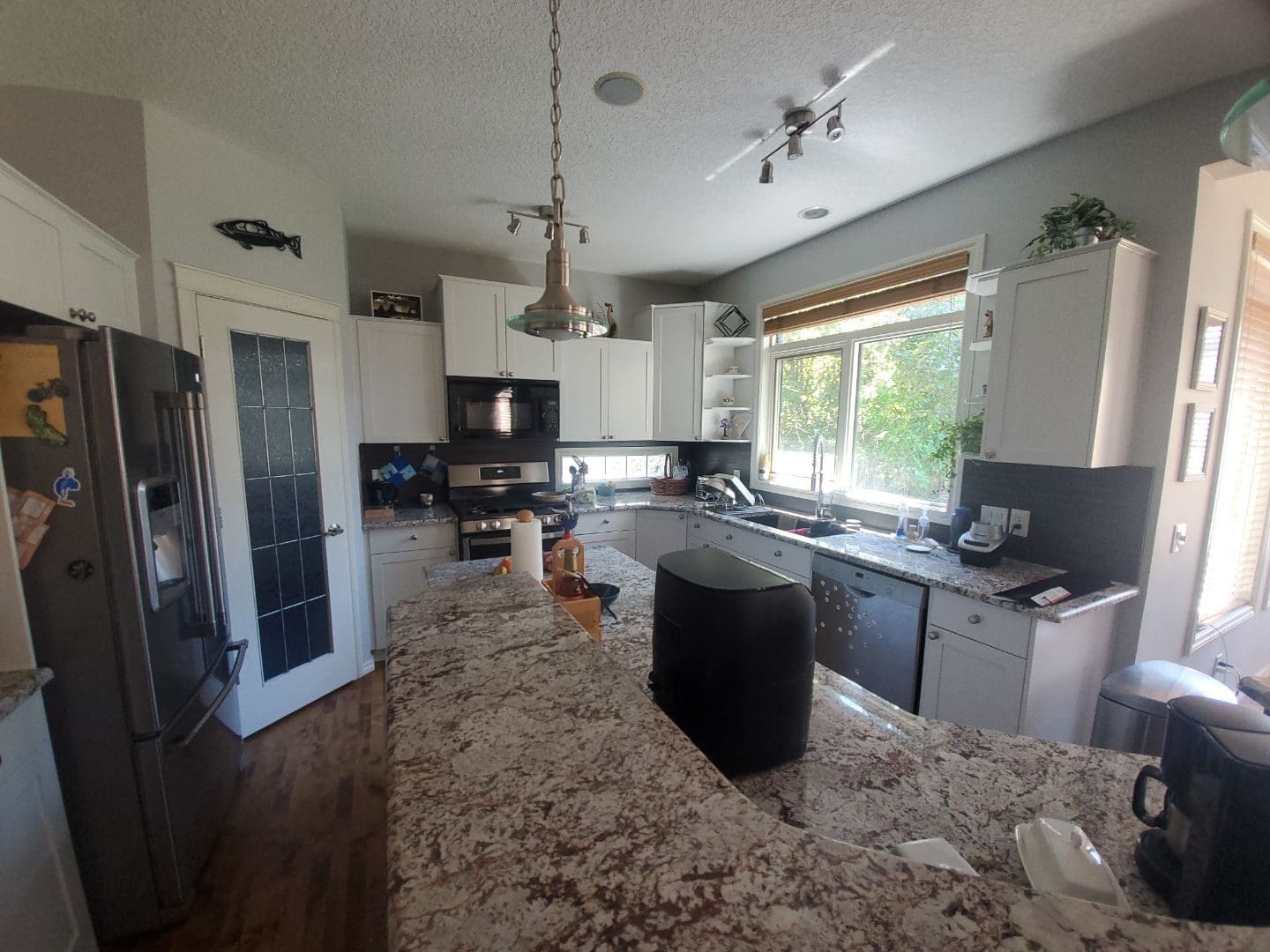 Do you have classic yellow oak or maple kitchen cabinets in need of an upgrade? Consider having them painted a modern shade of white! These dated maple cabinets were instantly modernized with a fresh and stylish shade of off-white that truly opened up the space and changed the entire feel of the main floor. Having shades of white on your cabinetry will not only modernize the space, but your cabinet surfaces will reflect more light back into the home, and give off a variety of warm and cool shades depending on the specific colour! Transform your home today with professional spray coatings!