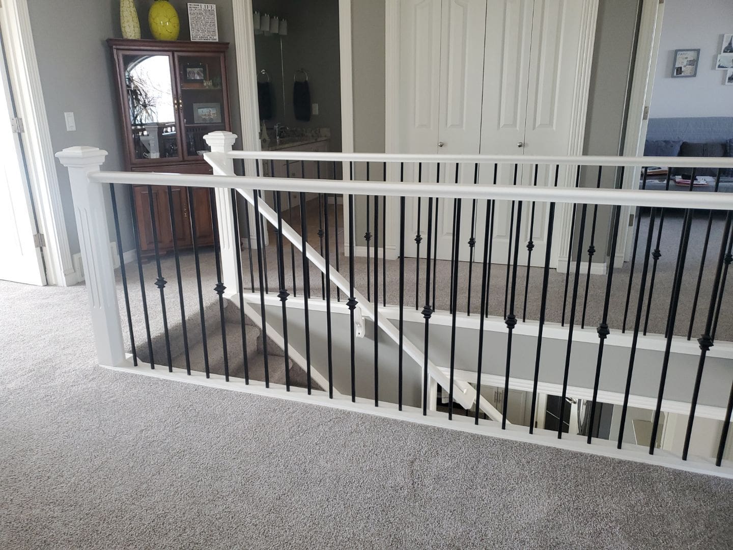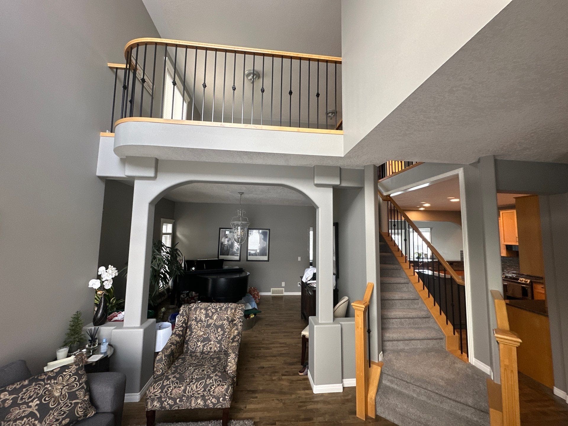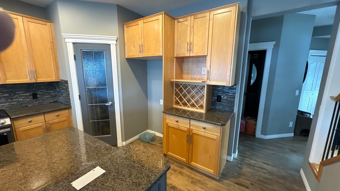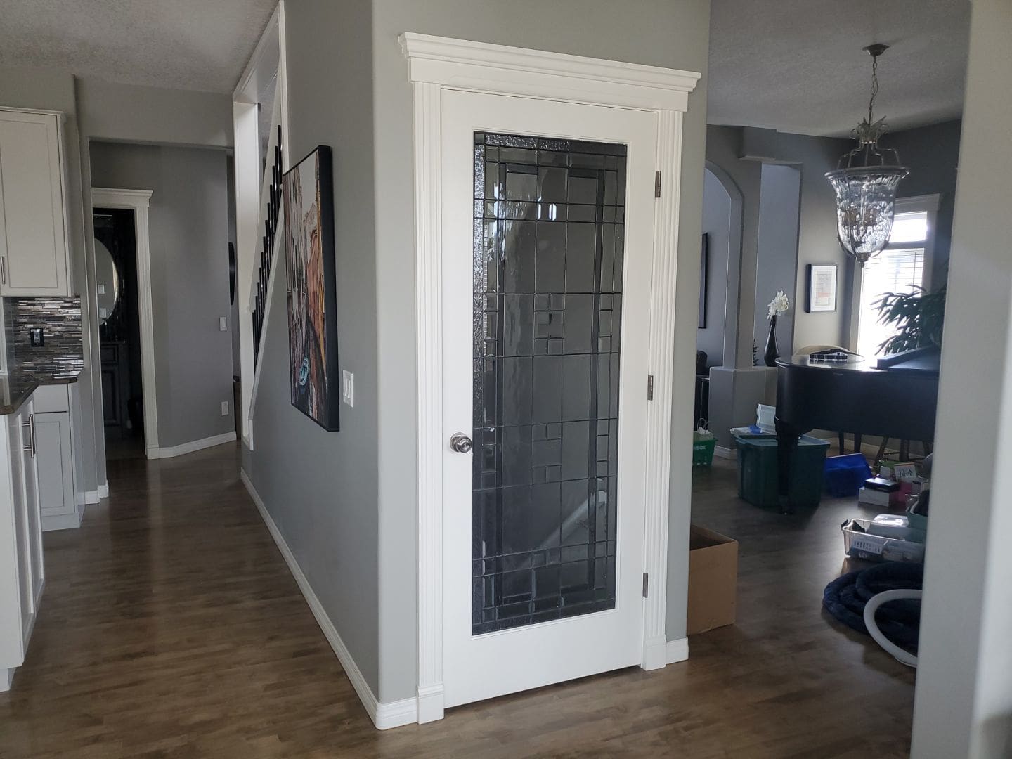 This project featured a full kitchen cabinet painting in sprayed lacquer, as well as laundry room cabinets, the banister railing from the main floor to upstairs, the master bath vanity, the pantry door and basement door and frames. Our client here wanted to update the interior of their home by getting rid of the of the light yellowish – light orange classic wood stain from the early 2000s. We painted the kitchen cabinets, the laundry room cabinets, and the master bath vanity a stylish and contemporary light gray called Collingwood. This colour is a soft gray with cooler undertones that provides a stunning look especially on cabinets that receive lots of natural light. For the pantry door, the basement door and frames, as well as the banister going from the main floor to upstairs, we painted a bright white match to the client’s existing trim colour. This added flow and cohesion from room to room and brightened up the entire home’s interior.