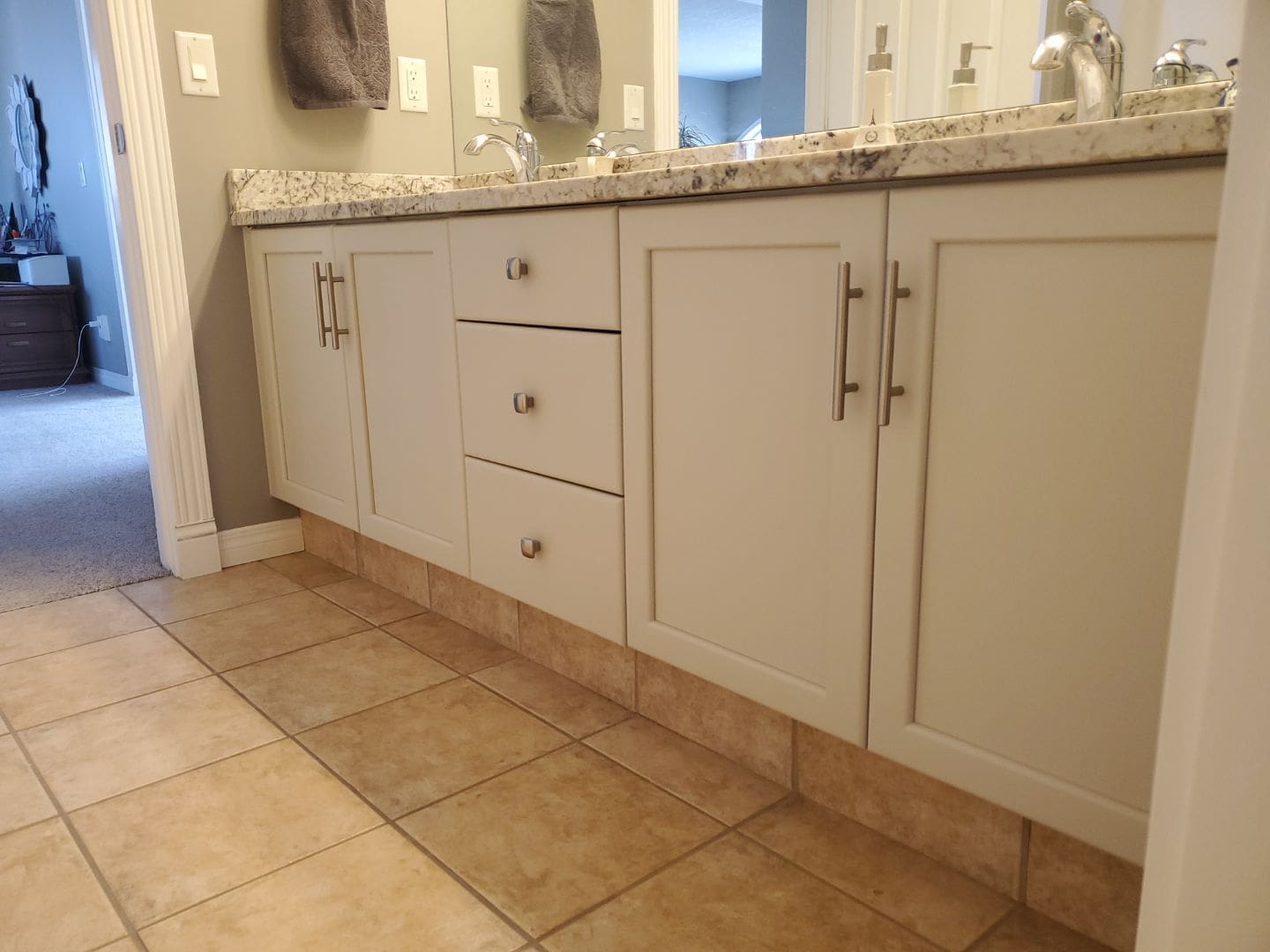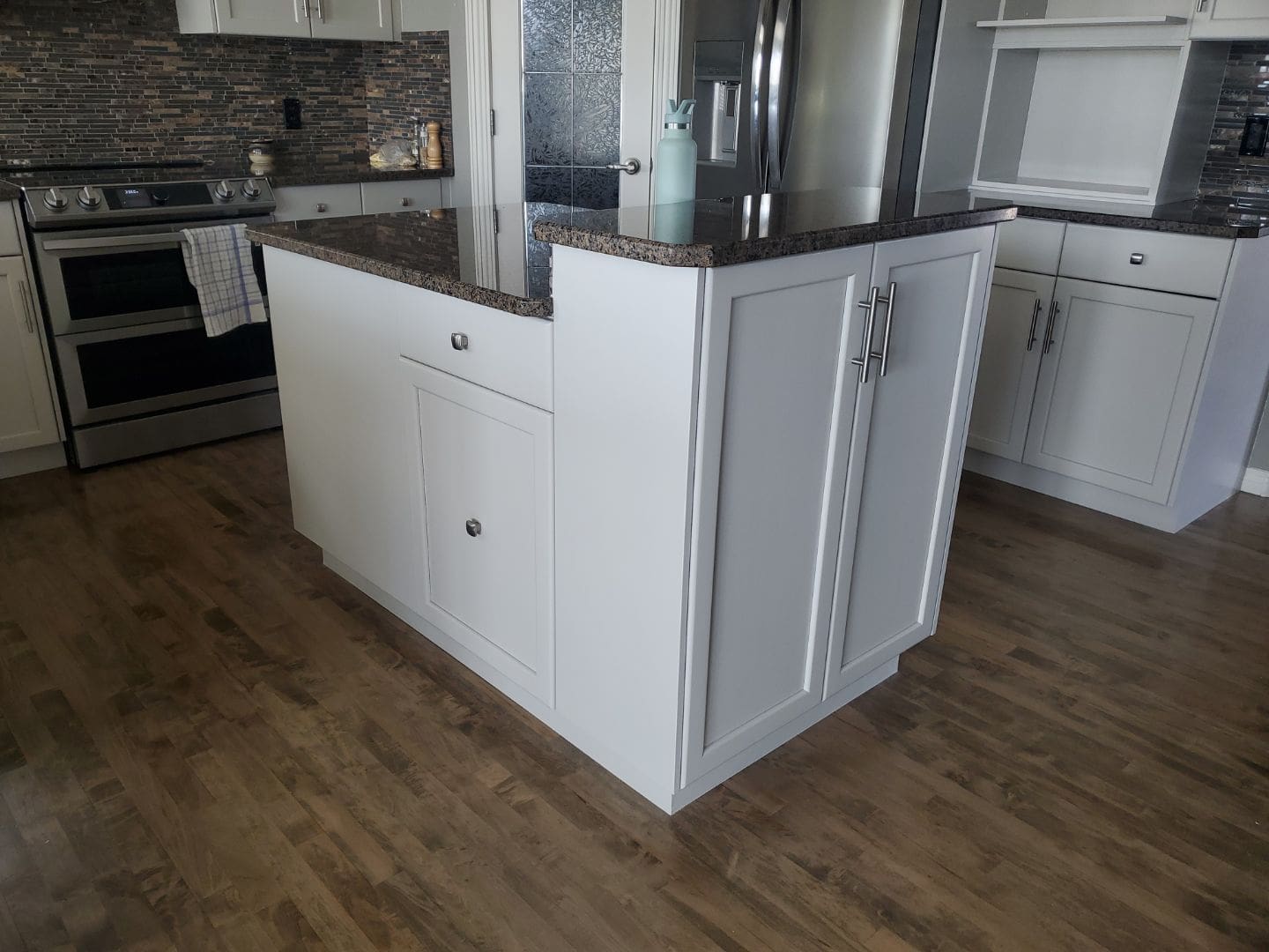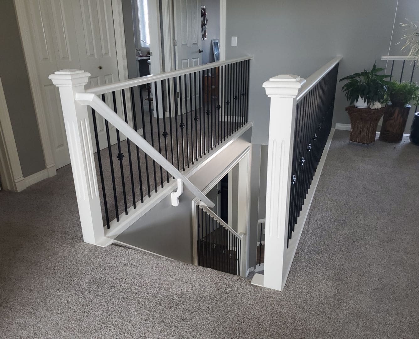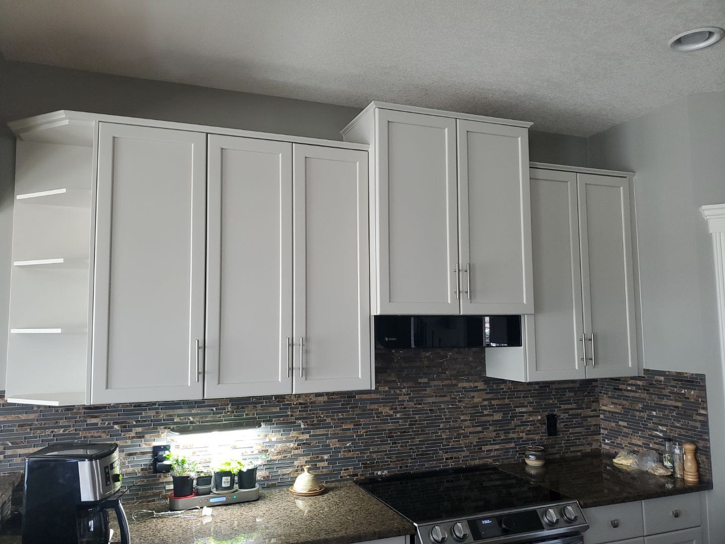 This project featured a full kitchen cabinet painting in sprayed lacquer, as well as laundry room cabinets, the banister railing from the main floor to upstairs, the master bath vanity, the pantry door and basement door and frames. Our client here wanted to update the interior of their home by getting rid of the of the light yellowish – light orange classic wood stain from the early 2000s. We painted the kitchen cabinets, the laundry room cabinets, and the master bath vanity a stylish and contemporary light gray called Collingwood. This colour is a soft gray with cooler undertones that provides a stunning look especially on cabinets that receive lots of natural light. For the pantry door, the basement door and frames, as well as the banister going from the main floor to upstairs, we painted a bright white match to the client’s existing trim colour. This added flow and cohesion from room to room and brightened up the entire home’s interior.