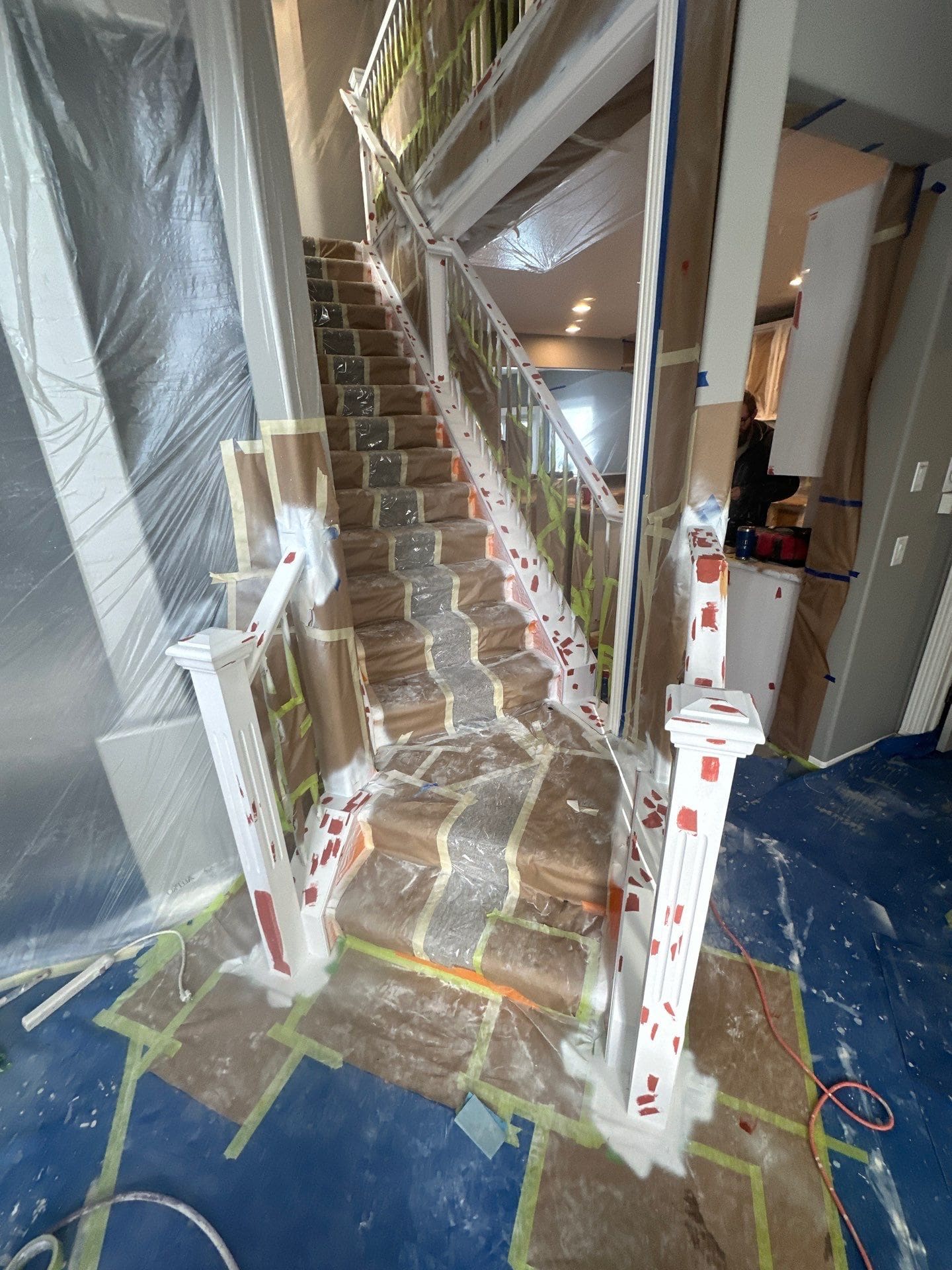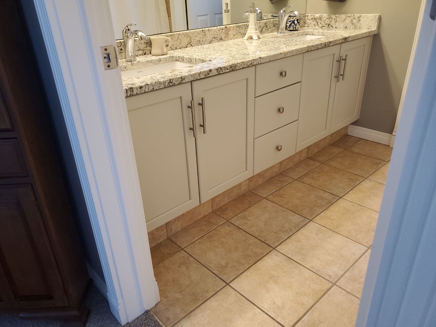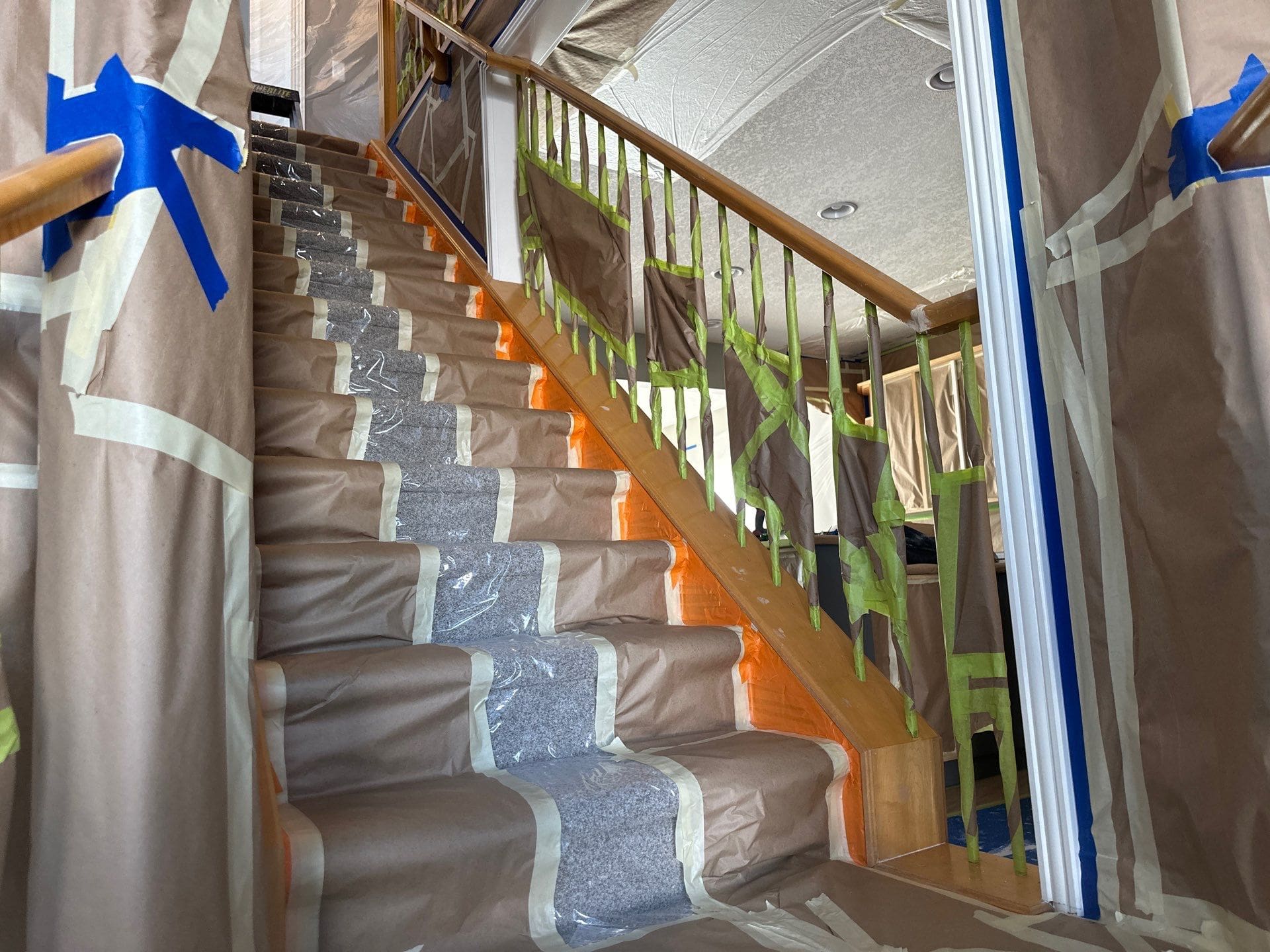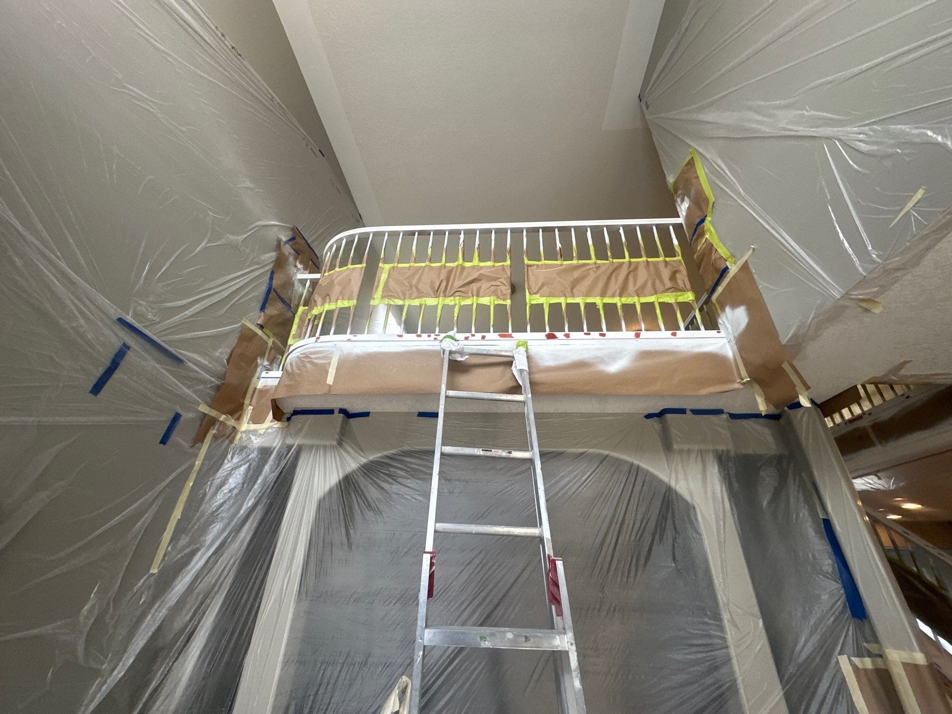 This project featured a full kitchen cabinet painting in sprayed lacquer, as well as laundry room cabinets, the banister railing from the main floor to upstairs, the master bath vanity, the pantry door and basement door and frames. Our client here wanted to update the interior of their home by getting rid of the of the light yellowish – light orange classic wood stain from the early 2000s. We painted the kitchen cabinets, the laundry room cabinets, and the master bath vanity a stylish and contemporary light gray called Collingwood. This colour is a soft gray with cooler undertones that provides a stunning look especially on cabinets that receive lots of natural light. For the pantry door, the basement door and frames, as well as the banister going from the main floor to upstairs, we painted a bright white match to the client’s existing trim colour. This added flow and cohesion from room to room and brightened up the entire home’s interior.