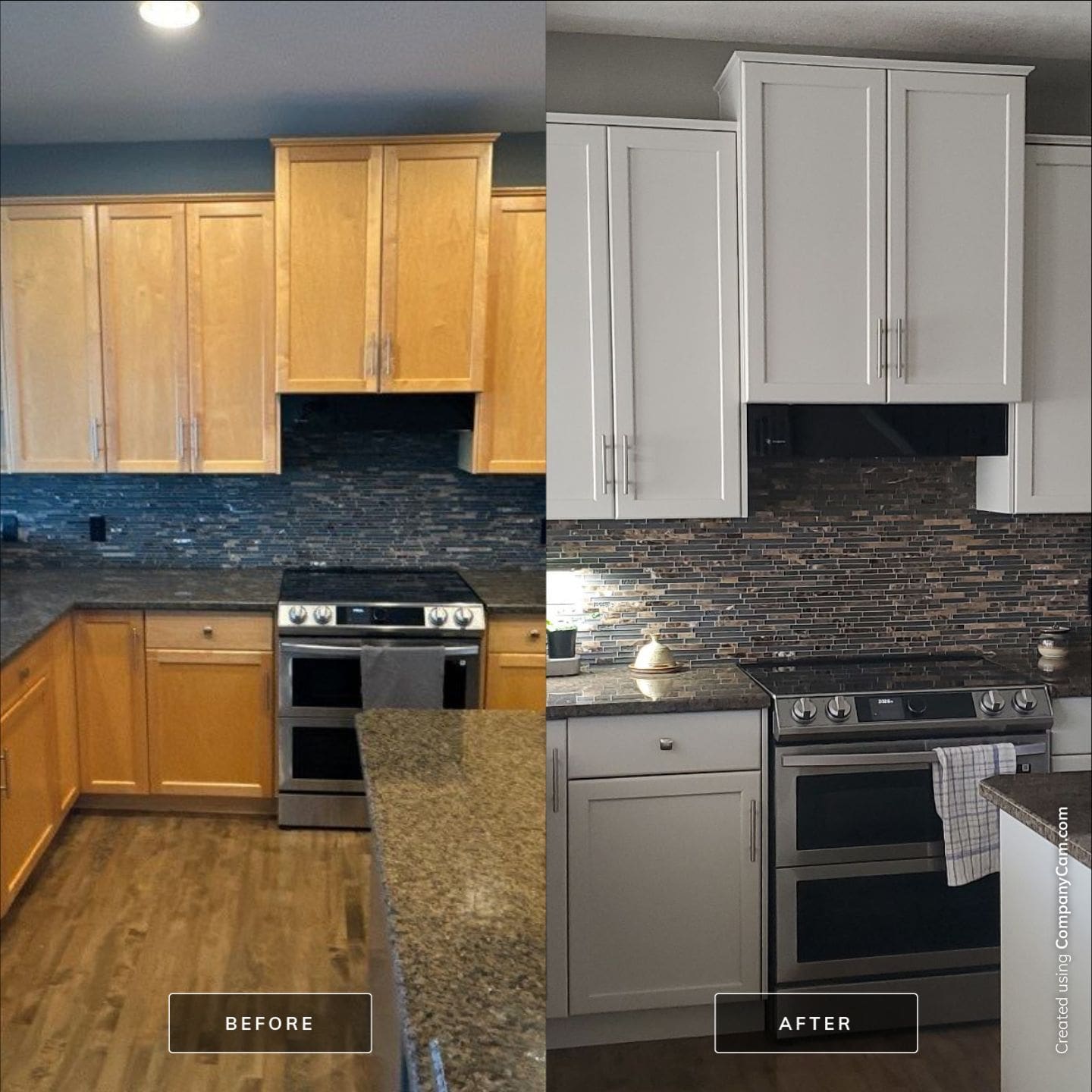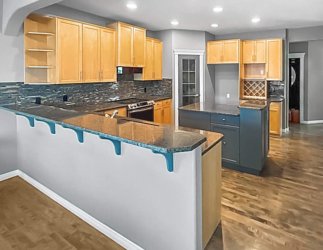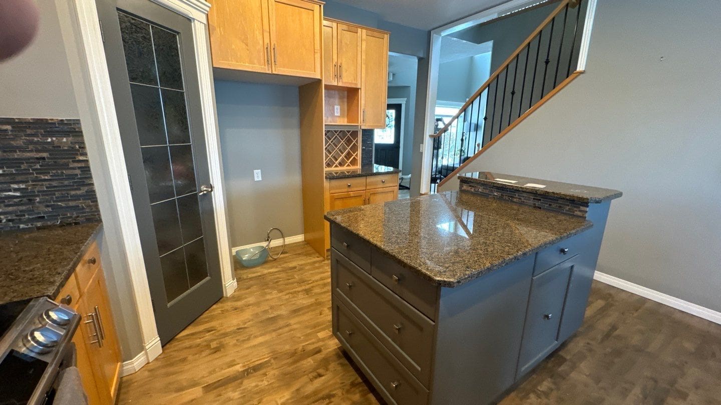 Dated Yellow Maple Two-tone to Modern Gray and White Cabinet and Trim Repaint