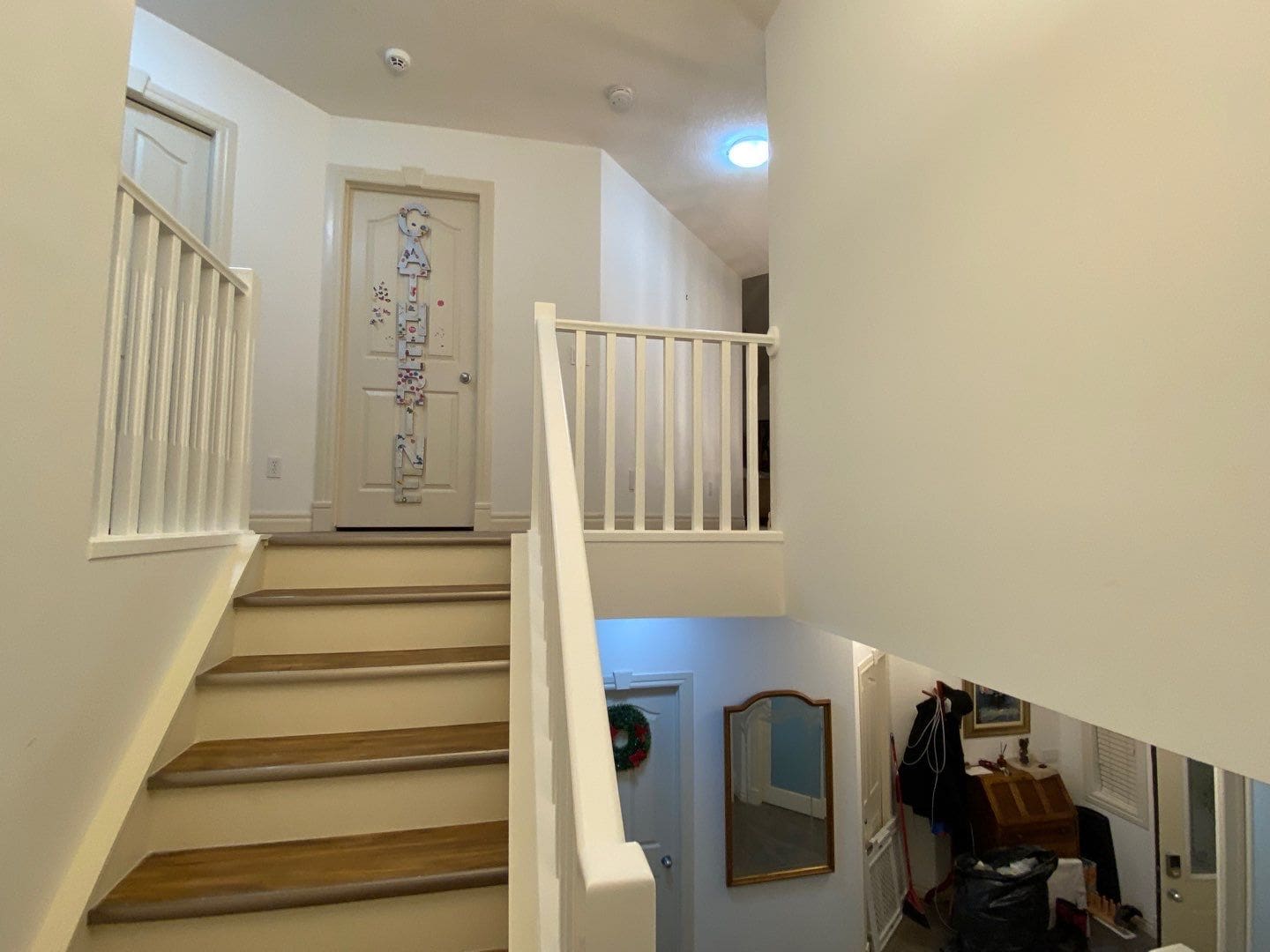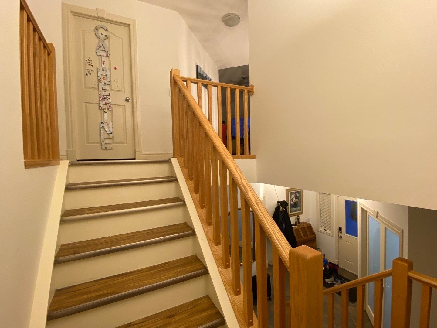 This project featured a banister rail painting in sprayed lacquer. We took this banister from a dated yellow oak to a modern, slightly creamy shade of white called Mountain Peak. The refreshed look to this banister brightened up the entire central space between the main and upper floors. Do you have a classic yellow oak banister in your home? Consider having it painted a bright and modern shade of white! It not only instantly modernizes your home, but renews your banister surface in such a way that makes it look and feel brand new once the painting is done. Consider transforming your home’s interior today by having your banister painted!