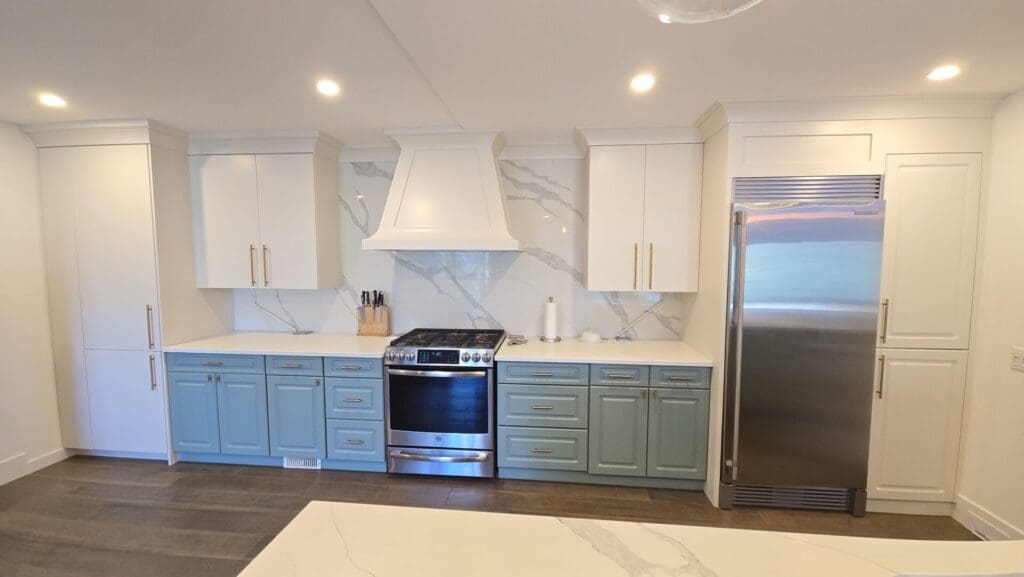 Oak Cabinets and Crown Moulding Painted White and Blue
